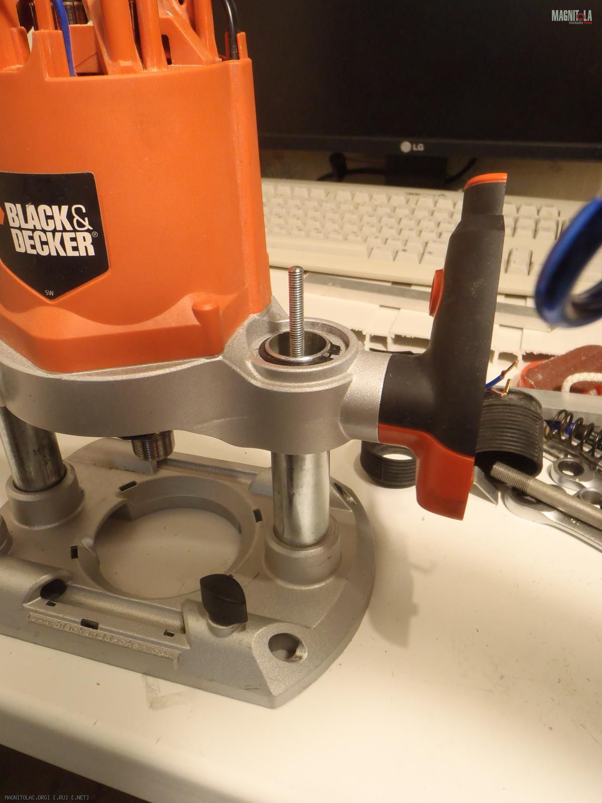 PS Остался момент, который нужно решить. Специально делал скользящую гайку, чтобы механизм регулировки не мешал ручному опусканию фрезера, но расположение регулятора оборотов (находится прямо над направляющей) не позволяет воспользоваться этим решением. Пока не знаю, что буду делать, но варианта 2: 1. Переделать механизм с неподвижным корпусом гайки и скользящей гайкой внутри корпуса; 2. Перенести регулятор оборотов наружу (так им и удобней будет пользоваться в столе), отв., куда будет выходить гайка, при опускании фрезера в ручном режиме, закрыть кожухом.
