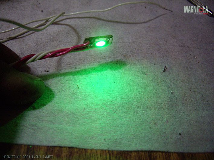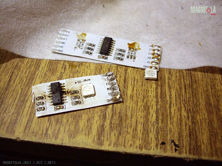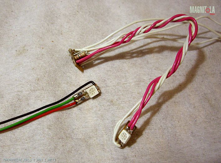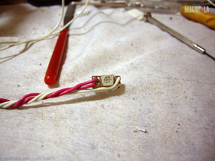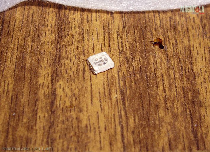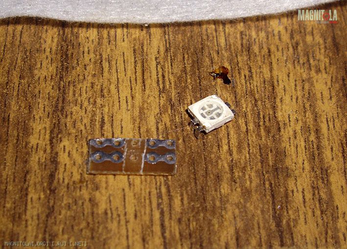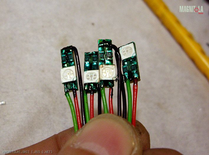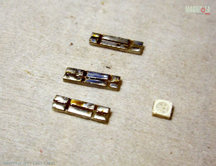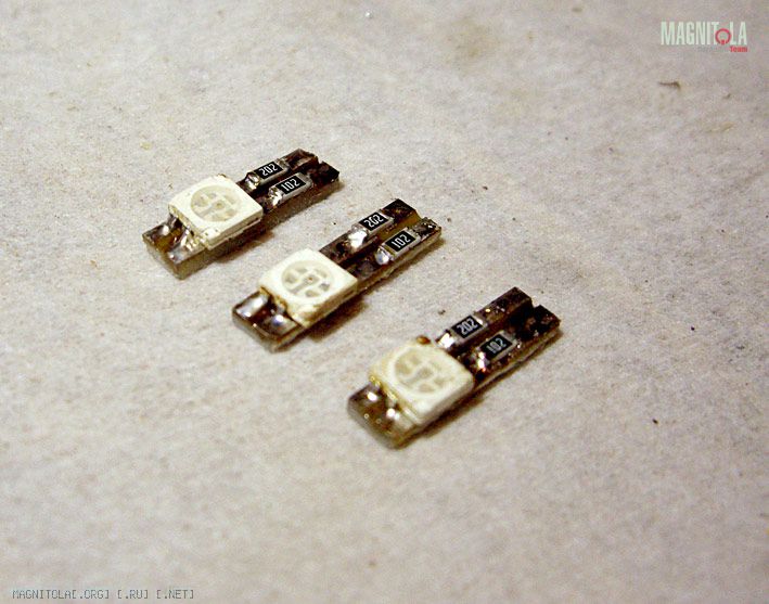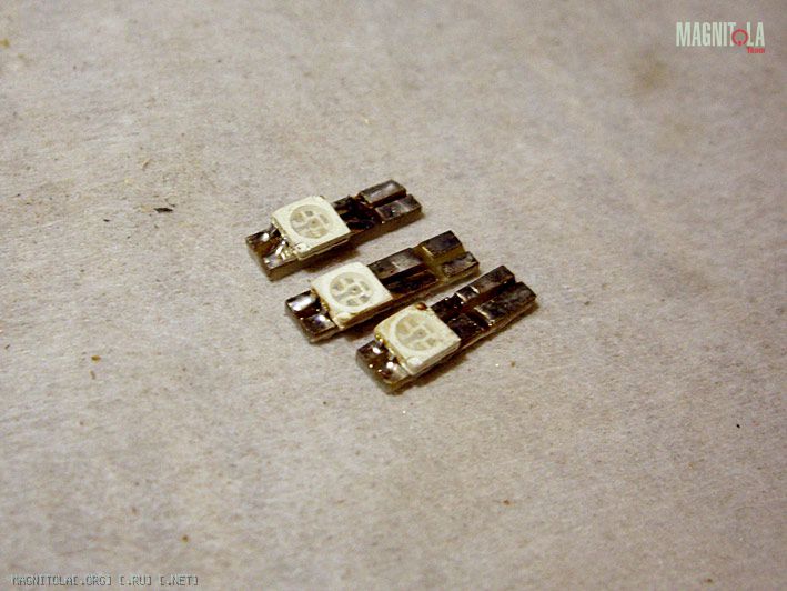 Поскольку Дмитрий захотел зелёно/красную подсветку (у него основная подсветка приборов зелёная), были взяты SMD RGB светодиоды из кусоков сгоревшей RGB ленты.