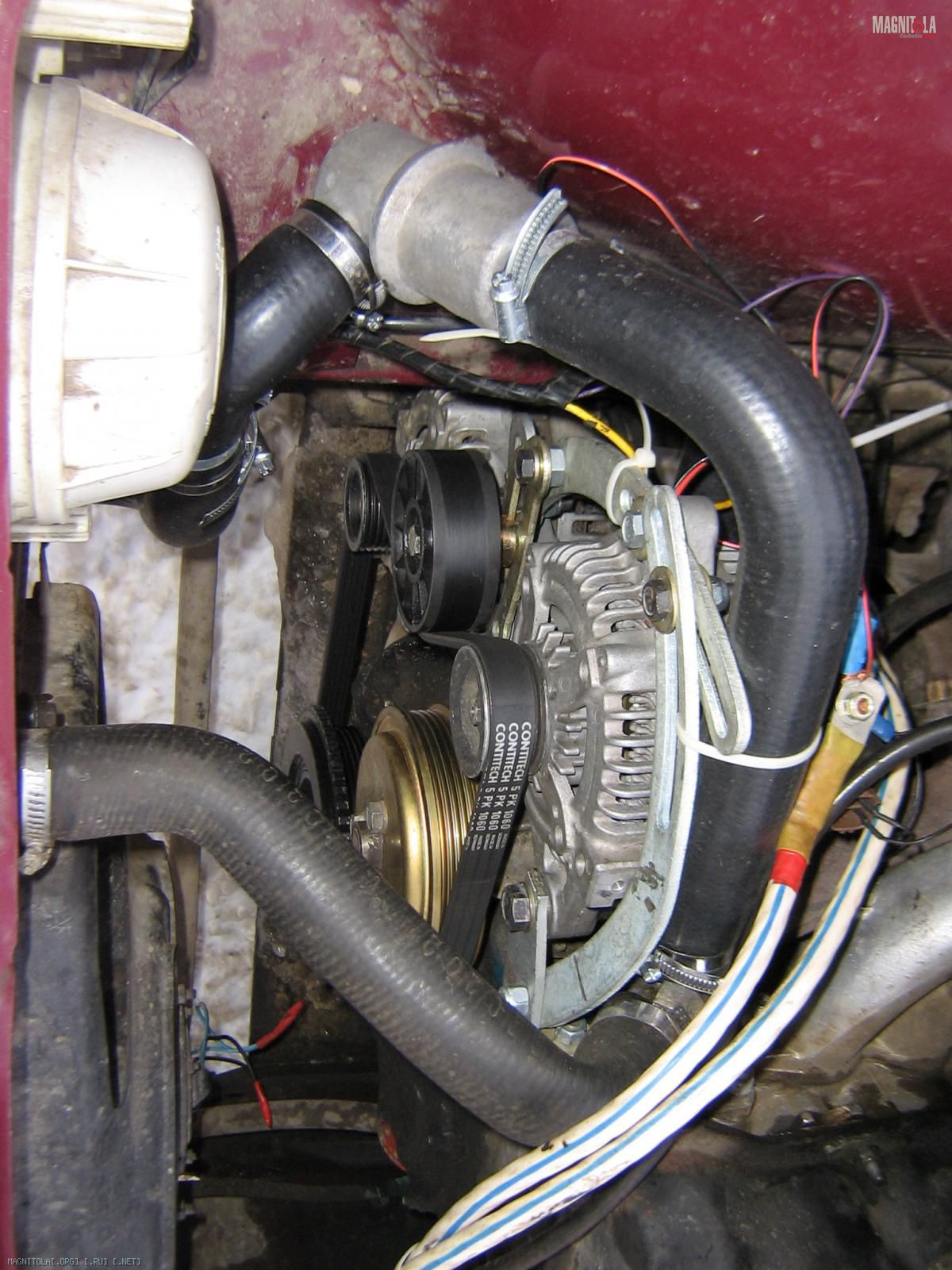 меняем штатный шкив на самодельный.Заодно желательно поменять подшипники гены,если он был куплен б/у (цена вопроса 500-1000р,в зависимости от состояния).В кронштейне гену надо сместить назад на 6 мм.Для этого напильником стачиваем по 3мм в задней части крончтейна и нижней лапы генератора.Вставляем вставку толщиной 6мм (можно использовать пакет плоских шайб М8) впереди нижней лапы (см. фото ниже).После этого ремень привода будет в одной плоскости...