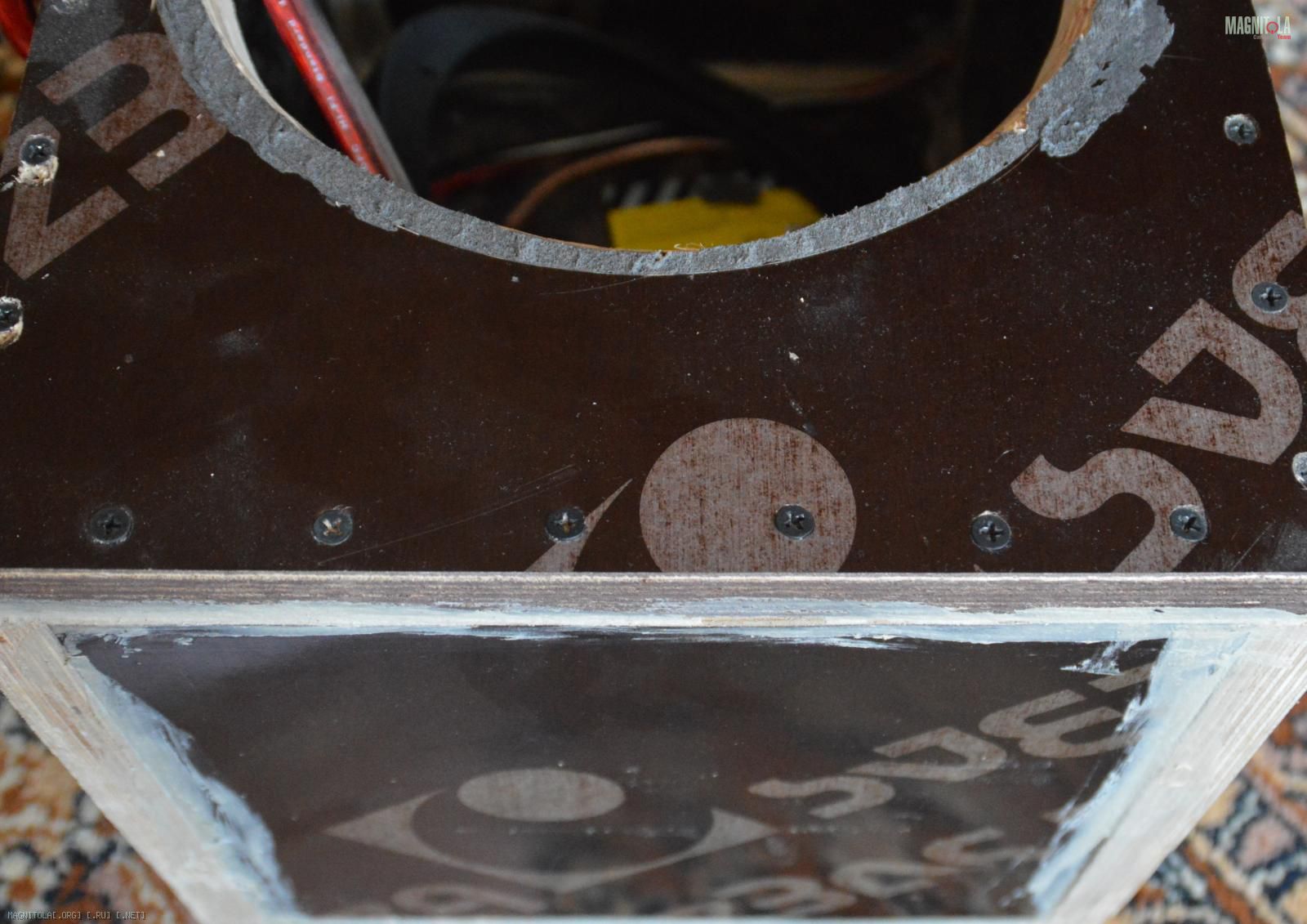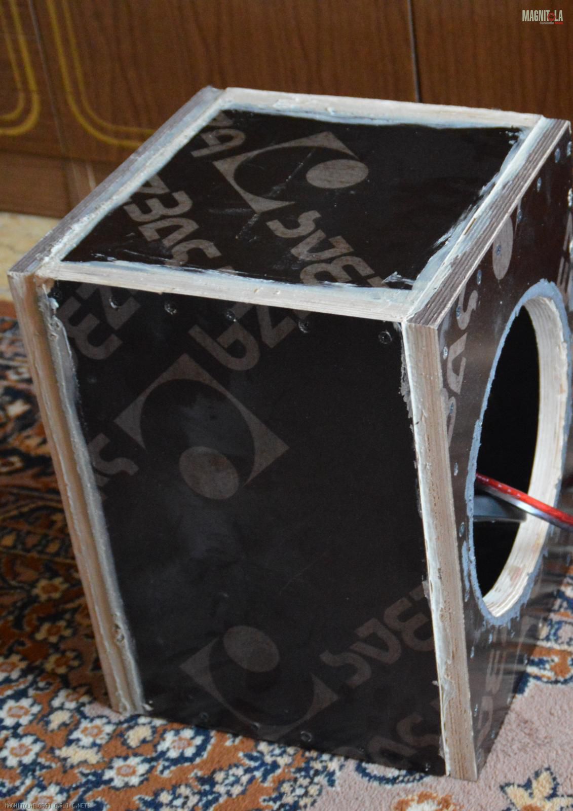 короб из фанеры 20 мм,соморезы каждые 5 см,на стыках силиконовый герметик макрофлекс,акустический кабель premier 2х6.0 кв в монтирован в корпус - длинна 1 м от корпуса к усилителю и 30 см от корпуса к динамику.размеры - 30х40х30.
