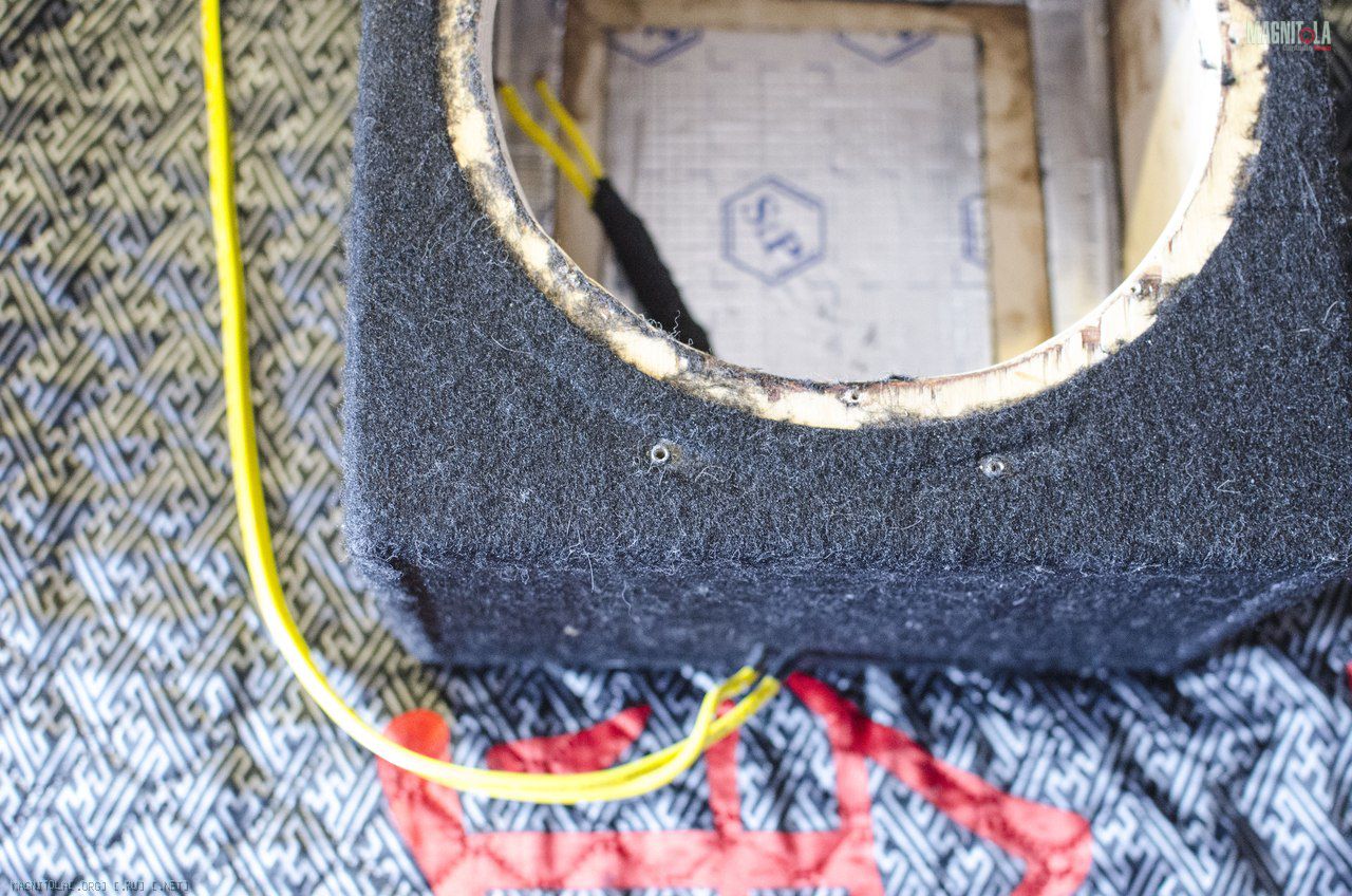 Кабель внутри корпуса помещён через дырочки, диаметром почти равных кабелю (выпиливал натфилями), залито герметиком жирно, вдобавок вставлена иголка от медицинского шприца, что бы от перепада температур сабвуфер не "втягивало" и не "выталкивало")