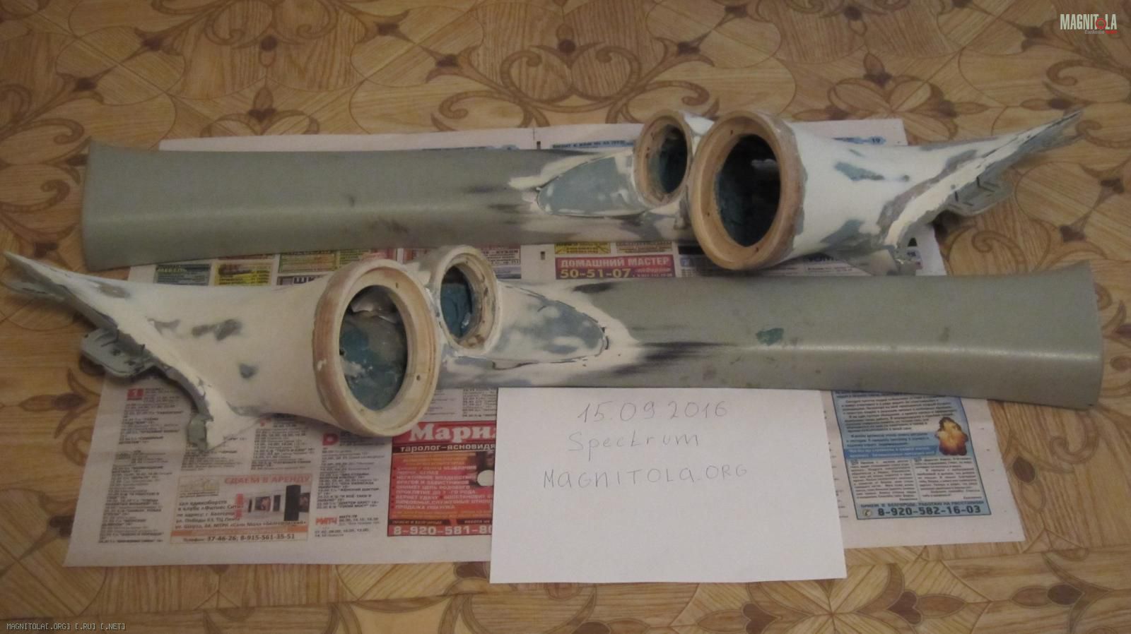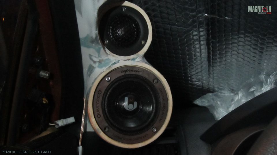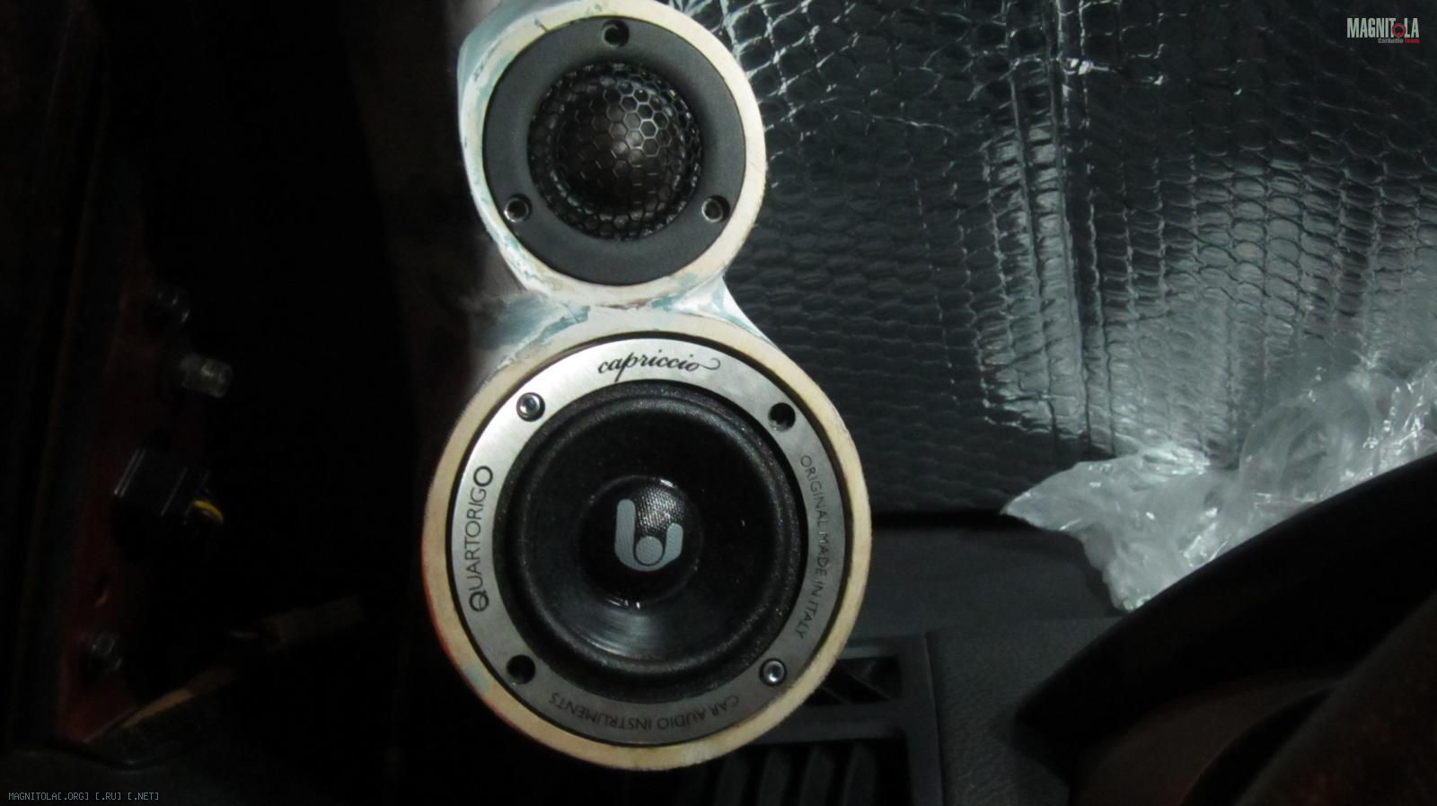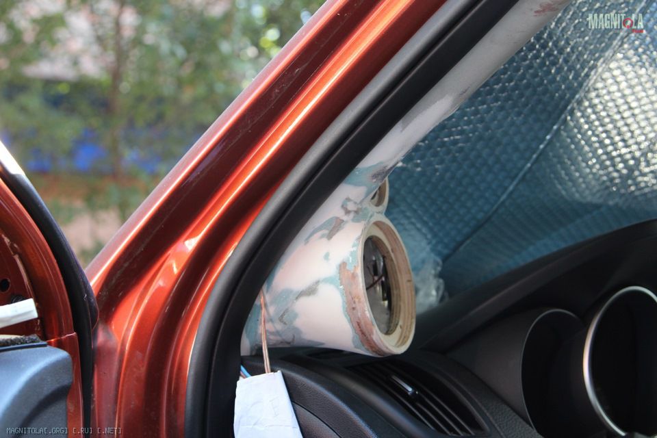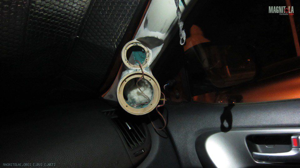 Между кольцом подиума и внешним фланцем СЧ-динамика сделано небольшое расстояние, чтобы вставить самодельные защитные сетки. Направление подобрано для процессорной системы. Левая смотрит в правую бровь водителю. Правая аналогично в левую пассажиру, но с совсем небольшим доворотом в сторону водителя (смотрятся визуально симметрично).