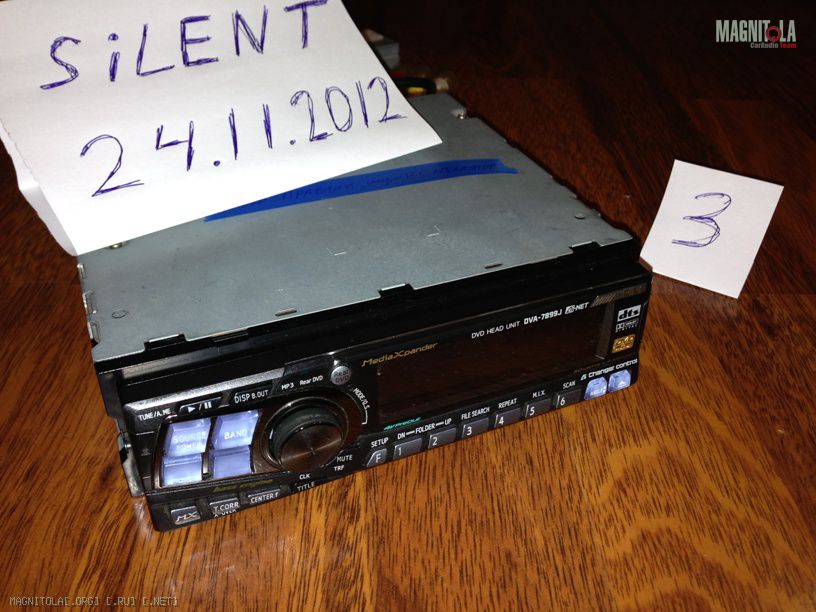 Лот 3. Alpine DVA-7899J Косметически 4-. Шумит встроеный вентилятор, при проигрывании CD/DVD звук есть только в правых каналах, в левых отсутствует, радио работает по левому и правому каналам нормально (Сам DVD привод полностью рабочий, тестировался на другом устройстве) В комплекте ТОЛЬКО ГУ. (рамки, шахты, пульта, жгута проводов НЕТ). Цена 2000р.