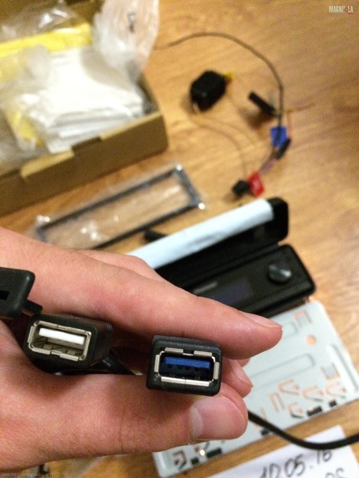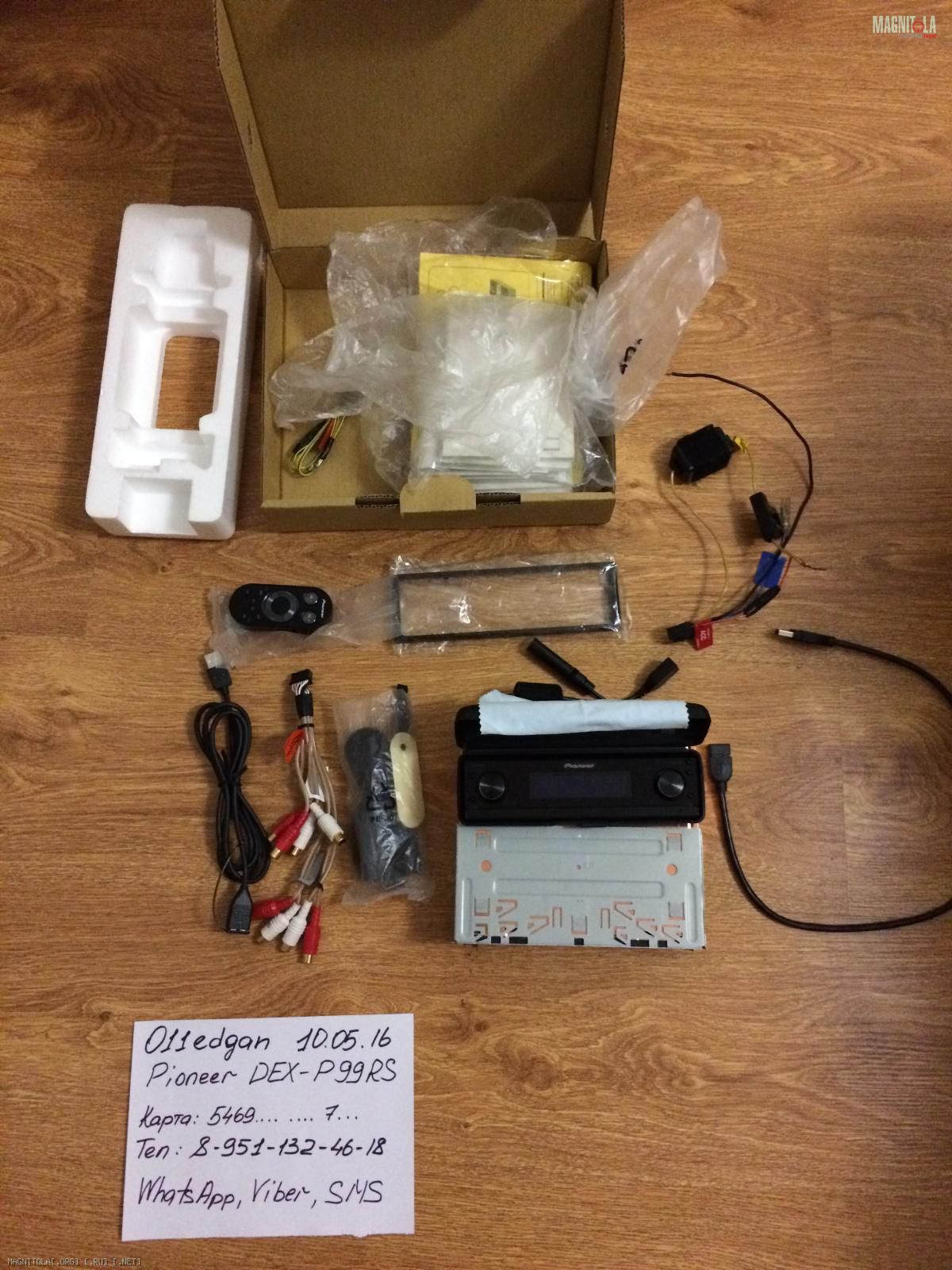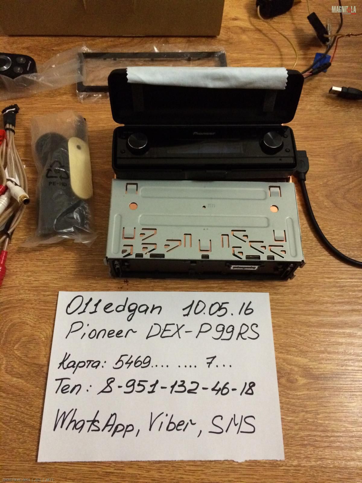 В комплекте все, что и у нового аппарата, даже запасная батарейка к пульту. Плюс к тому, в комплекте дорогой USB 3.0 шнурок, с которым не будет проблем при чтении флешек. Приспособление для монтажа пульта на руль не использовалось. Настроечный микрофон на фото спрятался под мурзилки. Даже хорошую тряпочку для протирки панельки отдам ;-). Из минусов: из косы демонтированы ILL и DOOR MUTE (также в комплекте), коса питания резаная.