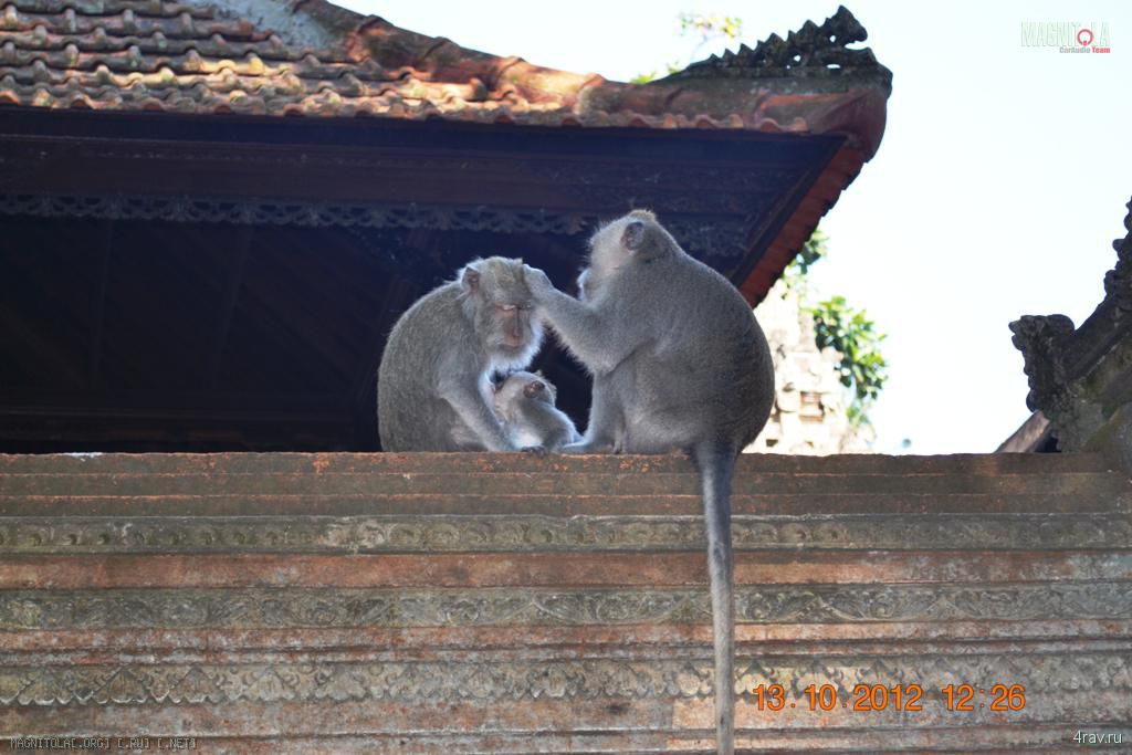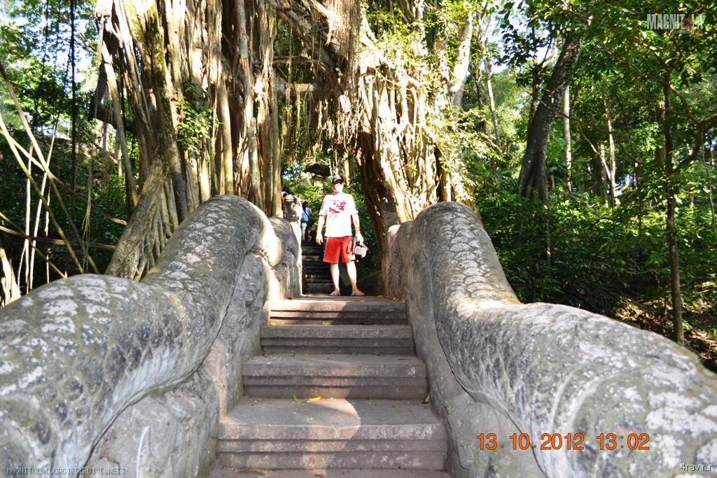 Снимаем очки, цепочки, ни при каких обстоятельствах не лезем при макаках в карманы. Это сигнал что у Вас есть угощение для них и повышенное внимание Вам обеспечено, вплоть до очень близкого знакомства, виде катания на Ваших плечах или голове. Можно взять на входе еду для них, но мы не рискнули. Гид рассказал, что недавно две мартышки подрались за банан, при чем это происходило на плечах солидного дядечки. Обезьяны тут везде, на деревьях, на дороге..Агрессии с их стороны не было, только интерес). Так же на территории есть пруд, куда можно бросить монетку на счастье. Если спуститься вниз по ступенькам и пройти вдоль ручья, найдете священный источник, из которого можно попить.