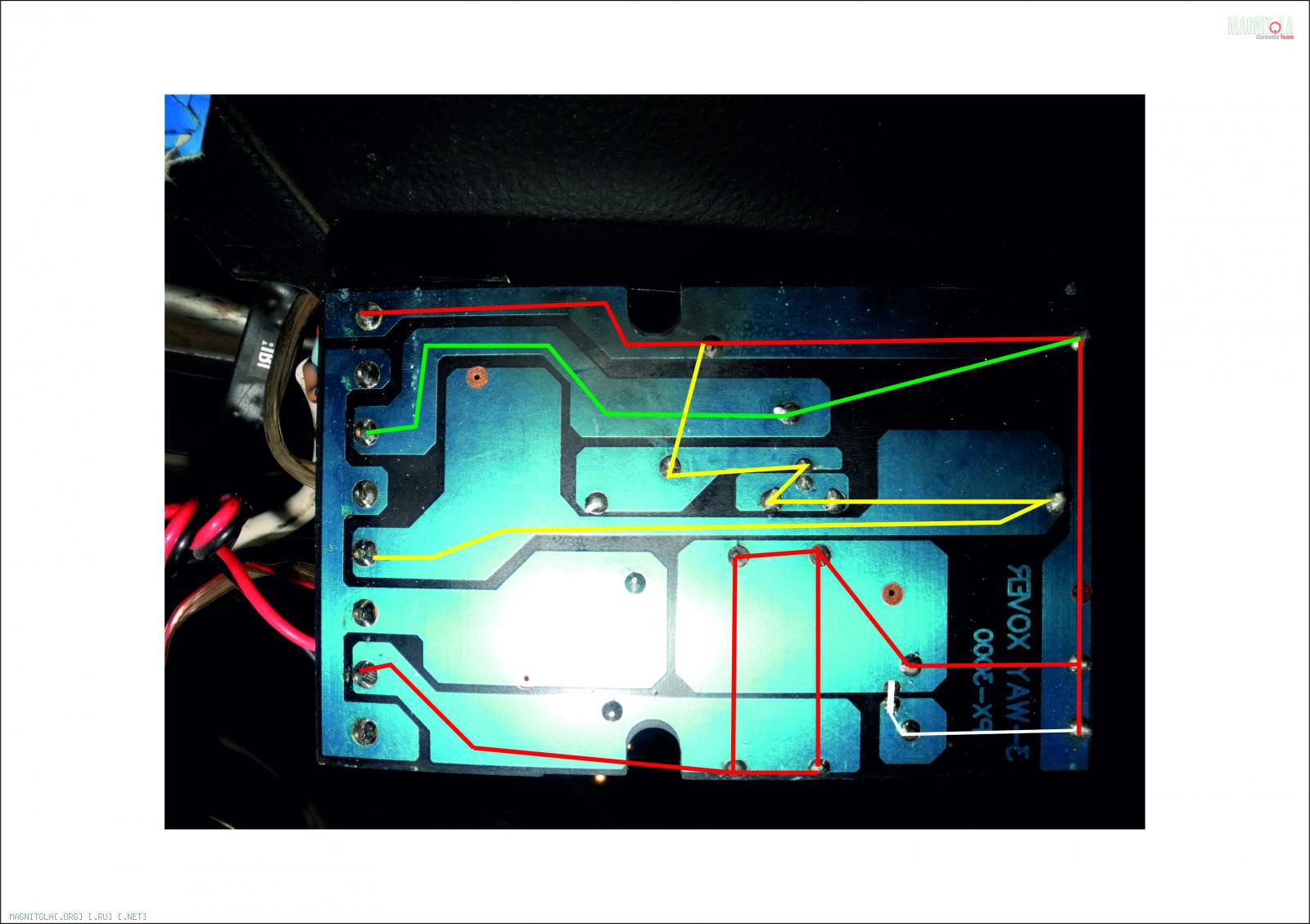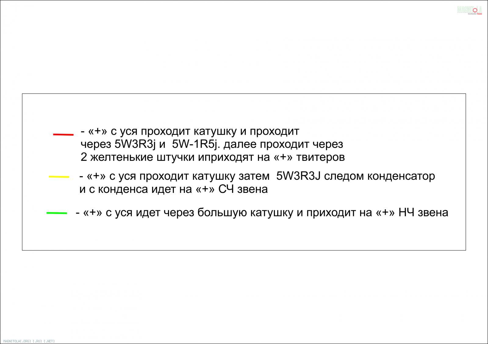 На трешке три входа и три выхода в биампинге. Прослеживаете, куда отходят ответвления от IN+, через какие элементы проходят. Ответвления необязательно отходят дорожками, они выглядят как растущие из общей плюсовой дорожки элементы. Каждое ответвление закончится плюсовой клеммой какого-нибудь динамика. И наоборот, каждая плюсовая клемма в итоге, пройдя через обрезающие элементы, соединится в общую клемму IN+. На минусы забейте, они соединены сразу при входе.