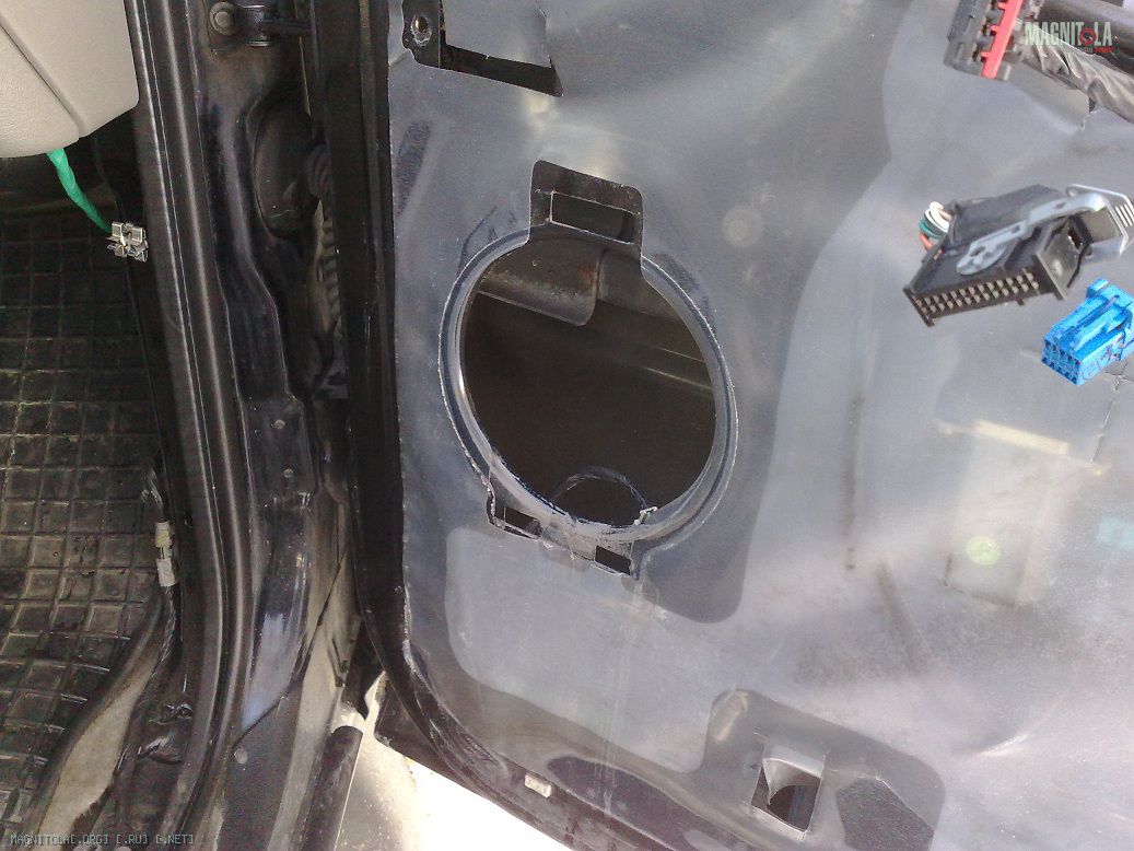 Вот так вот выглядит посадочное место в передней двери. Я когда увидел - у меня все желание оставить штатную акустику отпало. А без обшивки сегодня прокатился, так вообще как на улице или как с открытой дверью.