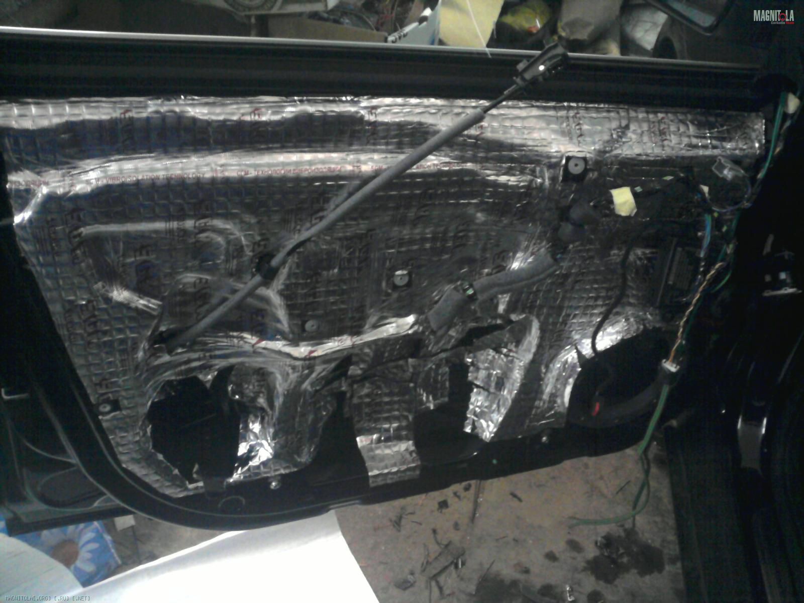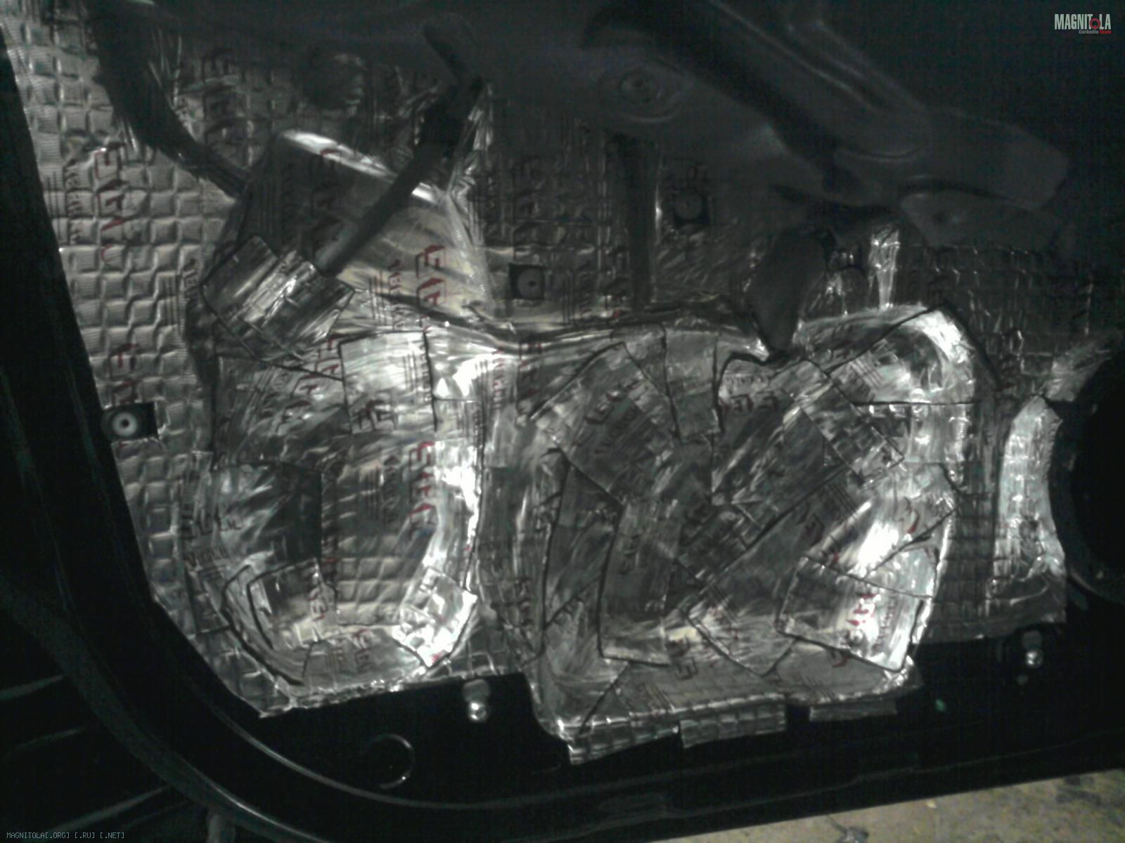 Там снизу по двери 2 больших отверстия, и обшивка заходит в дверь, т.е. даже вибру ровно не приклеишь, приходиться выгинать, а люминь бесполезно. Там только есть из стеклопластика лепить. :)