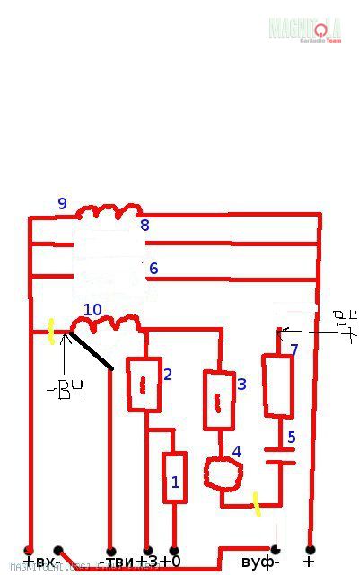 судя по вашей схеме на входе для понятности имеет смысл поменять плюс с минусом! Тогда на ВЧ у вас будет вход (+) на элементе 7[COLOR="Silver"] и левый выход 10 катушки... Соответственно выход на ВЧ останется прежним, только вот "тви-" надо будет разорвать с прежней цепью и соединить с левым концом 10 (это где у вас желтая полосочка). Эт по ВЧ... Теперь по НЧ!