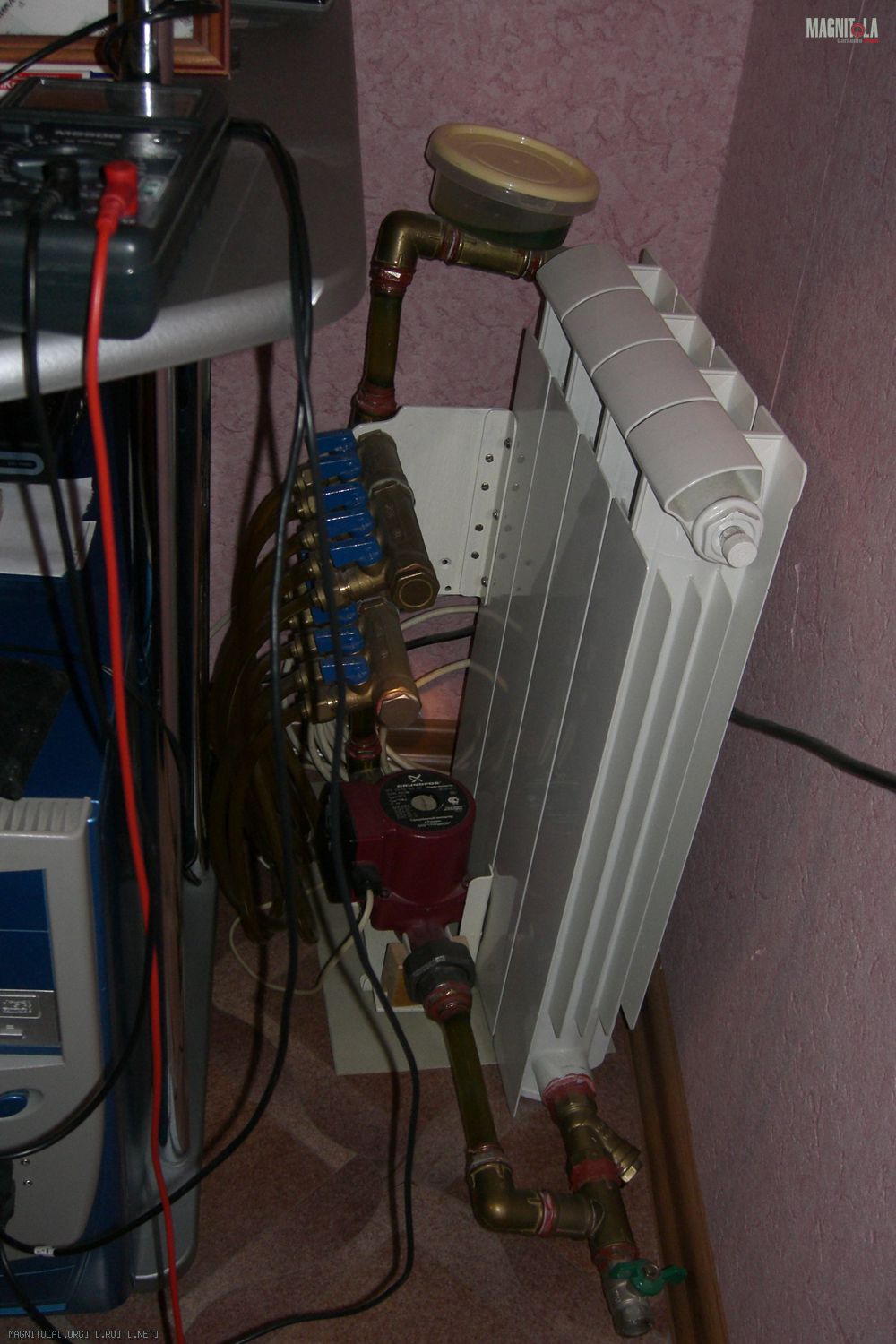 биметаллическая батарея, распределитель для теплых полов (каждая ветка на свой потребитель) и насос Grundfos, его не слышно, совсем.