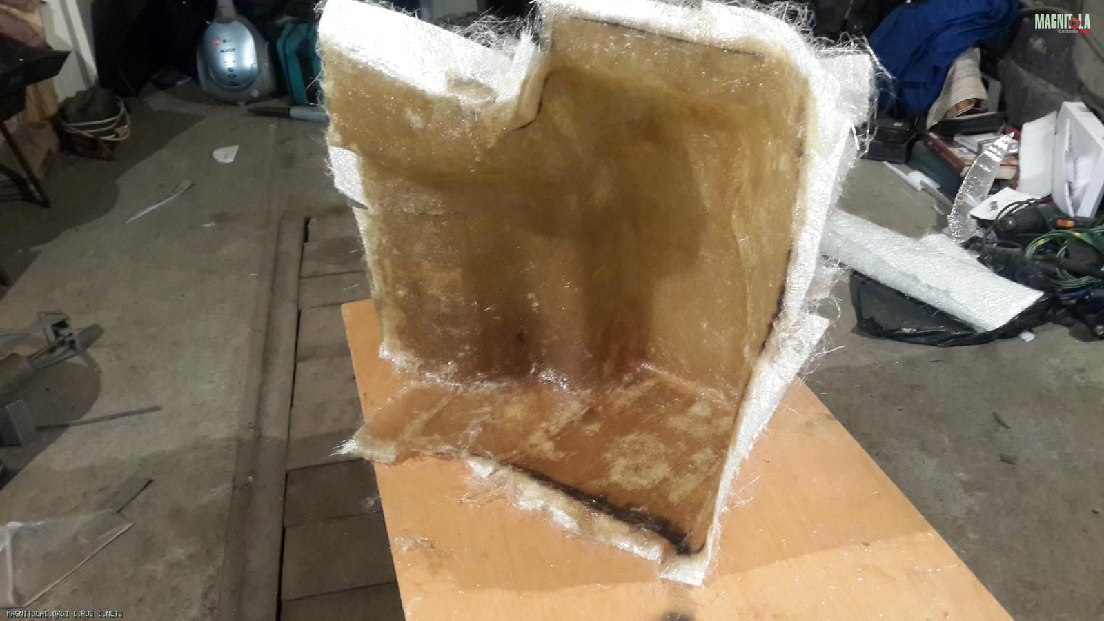 Заклеил в багажнике на 1 слой малярным скотчем предполагаемое место-неудобно. В итоге снял обшивку и дальше все движения делал на верстаке-гораздо удобнее!! Обшиву снимал 7 минут. Побоялся клеить в 1 слой маляркой, сверху во 2ой слой наклеил упаковочный скотч. Нарезал стекломат, разложил по скотчу и наносил на мат. Сперва развел 50 мл смолы- израсходовалась за 2 минуты (работали с женой в 4 руки). Дальше буторили по 250мл:) Уложили 2 слоя, вывели все пузыри и оставили сохнуть до завтра. С завтрашнего дня собираюсь набирать толщину. Хотелось бы поинтересоваться: сколько времени дать смоле подсохнуть между слоями? И второе если переднюю стенку делать из смолы- как ухитриться и задать форму?