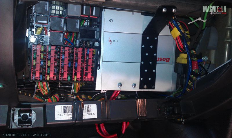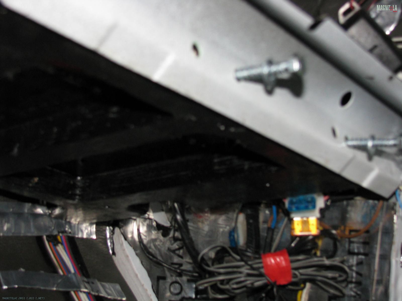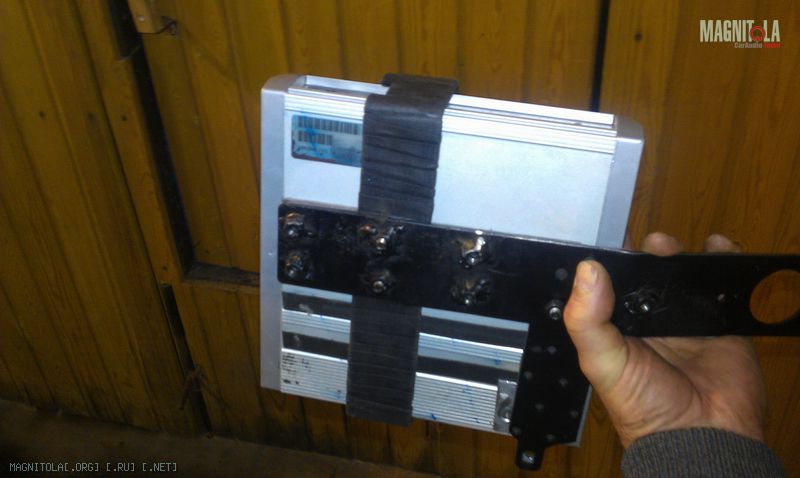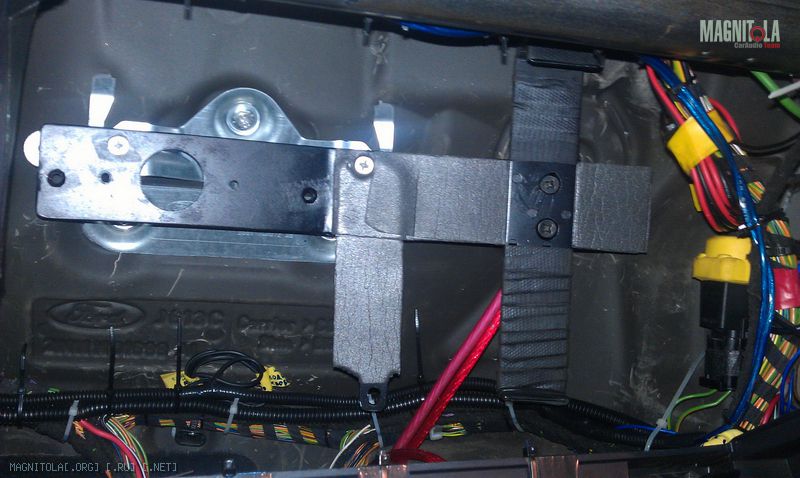 Ford Fusion. Усилок под торпедо, ноги пассажира. Изготовил раму 2-х мм железо. Перенес блок предохранителей на 3 см влево. Подготовил крепежные элементы на самом усилке. Дополнительно крепится к поперечной трубе (в торпедо). Крепление получилось очень прочное. Усилитель работает на пищалки, никаких наводок, проводка короткая, не видно, не слышно.