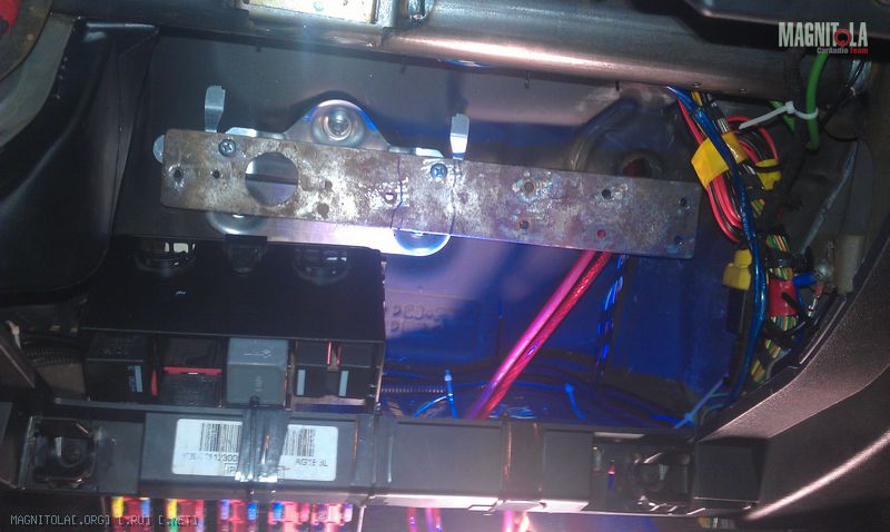 Ford Fusion. Усилок под торпедо, ноги пассажира. Изготовил раму 2-х мм железо. Перенес блок предохранителей на 3 см влево. Подготовил крепежные элементы на самом усилке. Дополнительно крепится к поперечной трубе (в торпедо). Крепление получилось очень прочное. Усилитель работает на пищалки, никаких наводок, проводка короткая, не видно, не слышно.