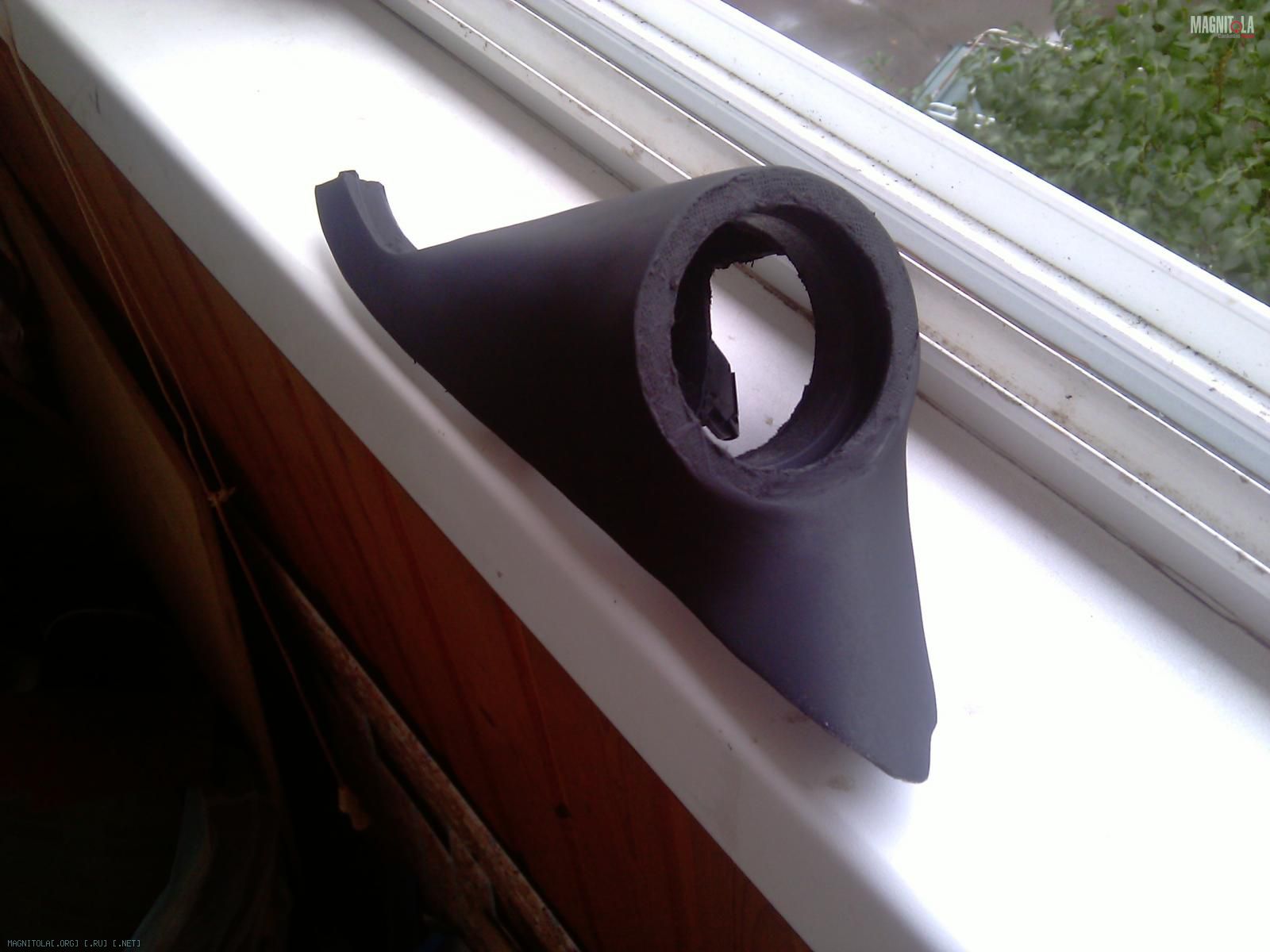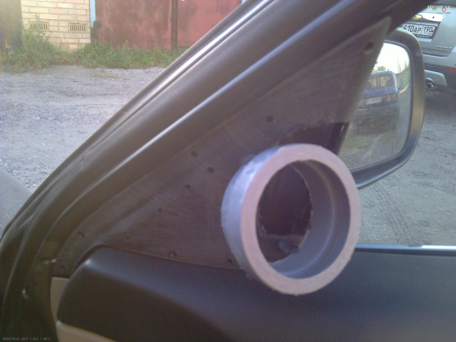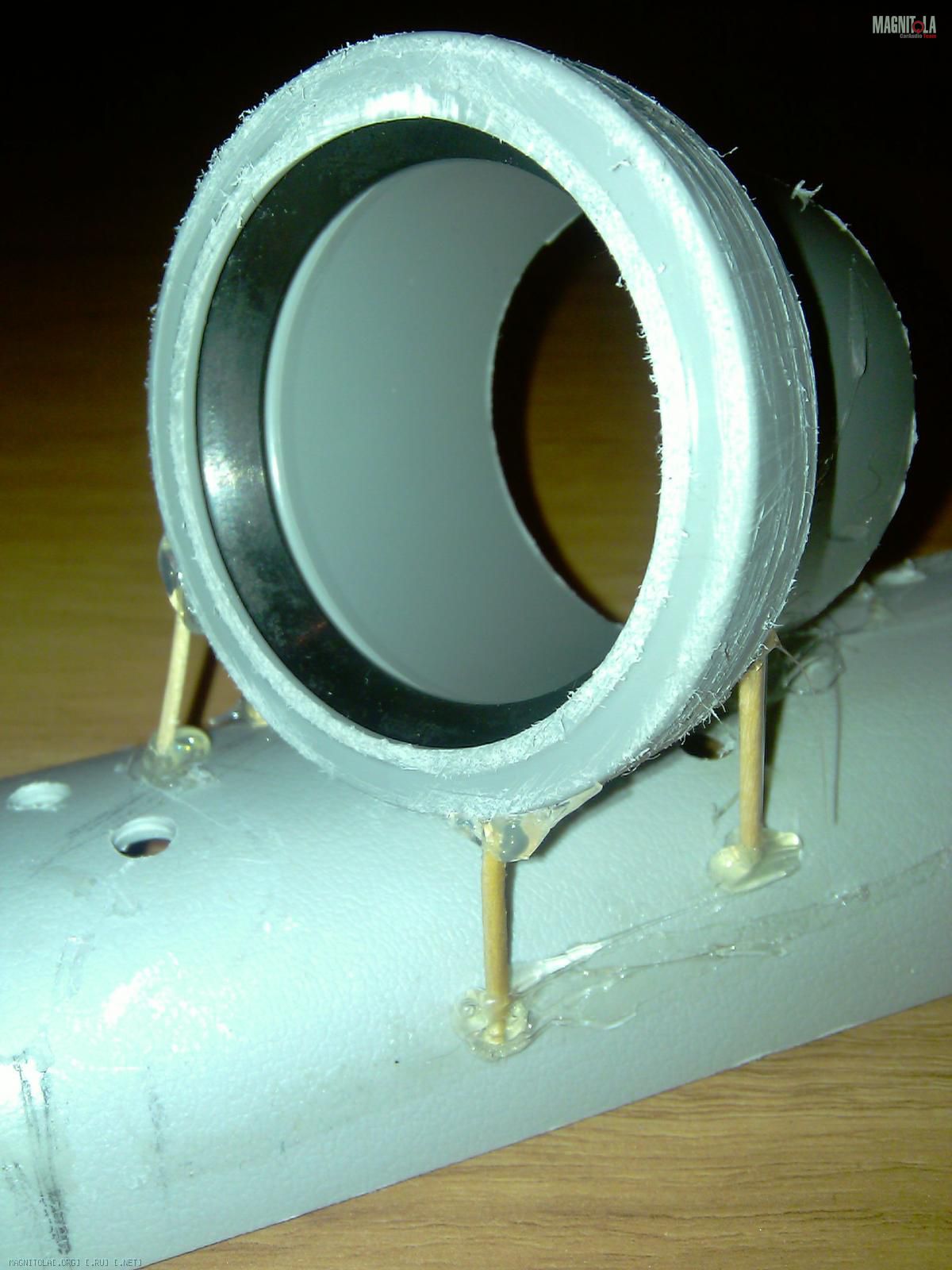 Первым делом отрезаем от трубы кольцо, по глубине ВЧ, труба оказалась чуть большего диаметра ВЧ, по этому пришлось вырезать из кольца сегмент и склеить его, естественно надо учитывать толщину материала которым будет оклеиваться стойка.