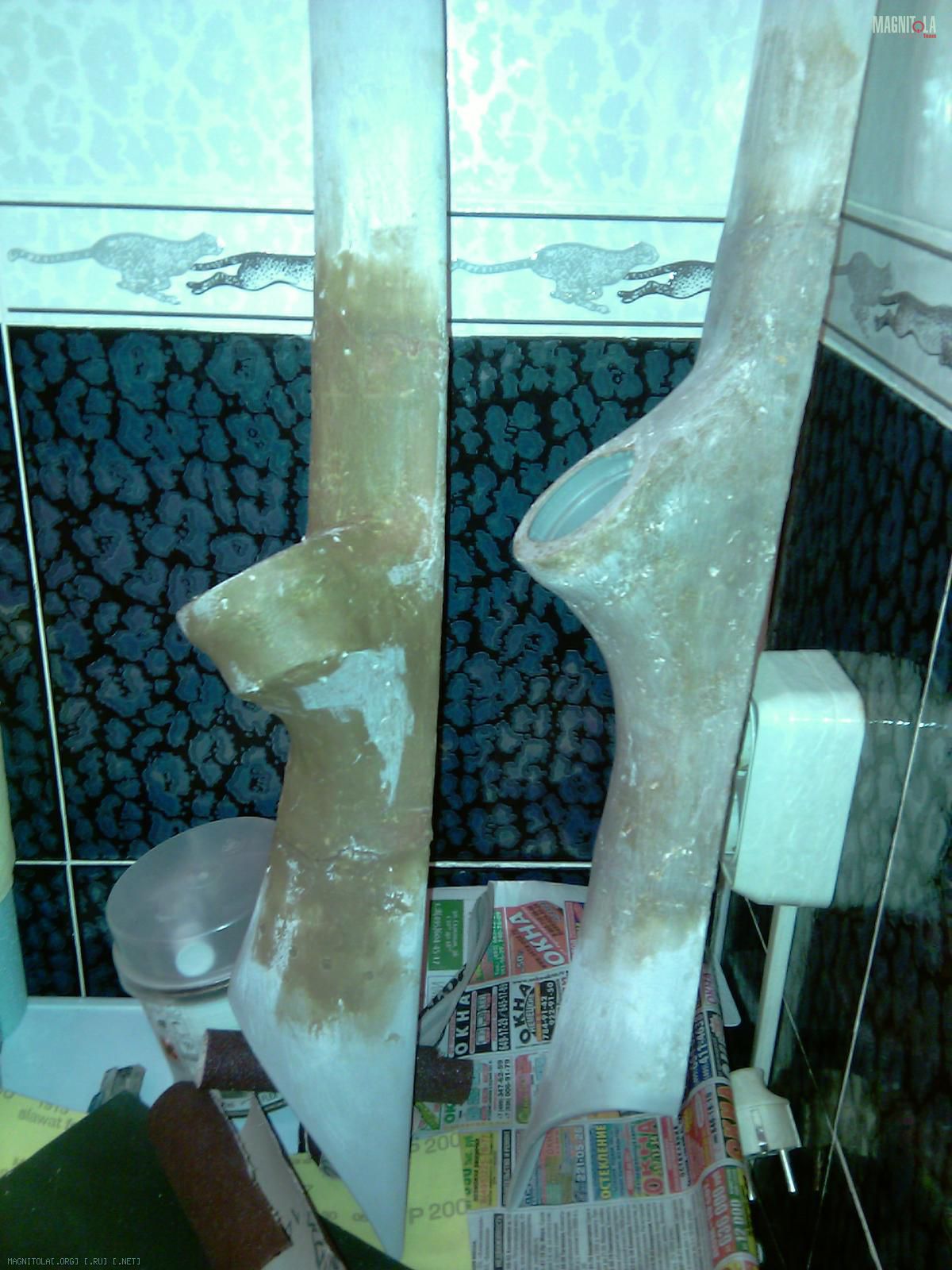 Далее, всё лишнее убираем наждачкой, ещё раз наносим клей на стыки,с двух сторон. После высыхания клея пропитываем картон полиэфирной смолой. Сушим-получилось бетонно.:yes4: