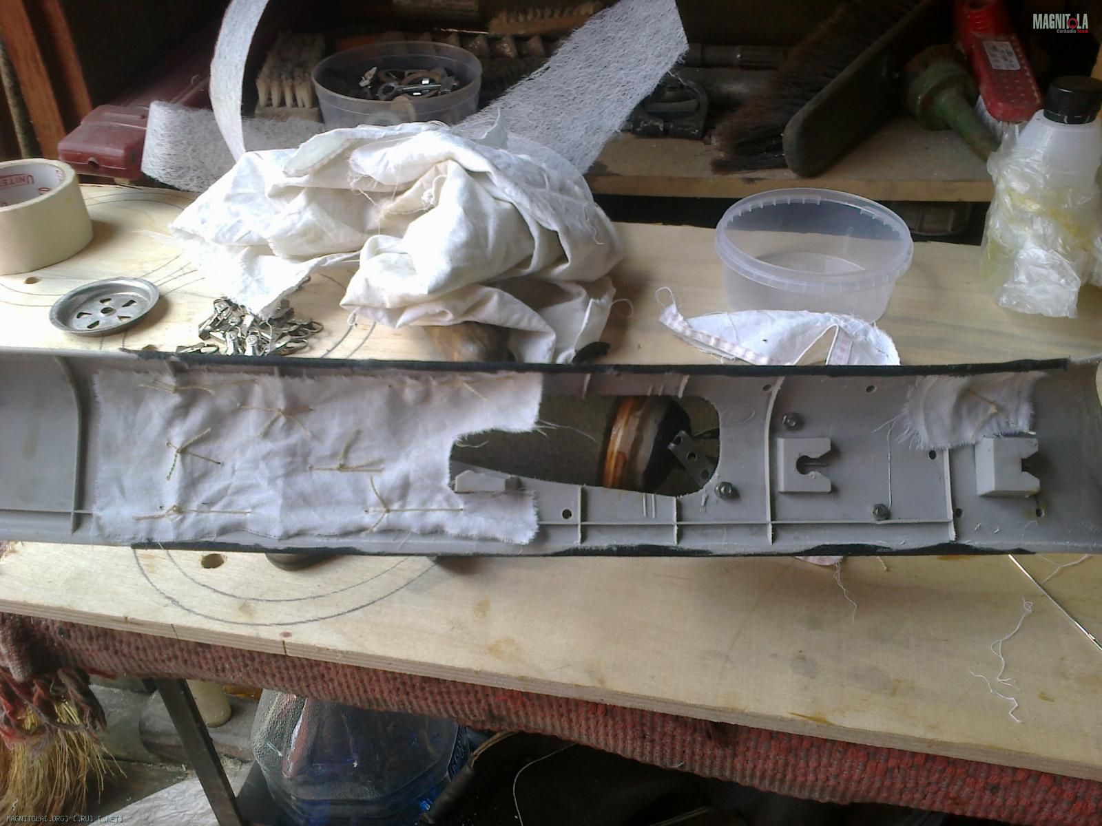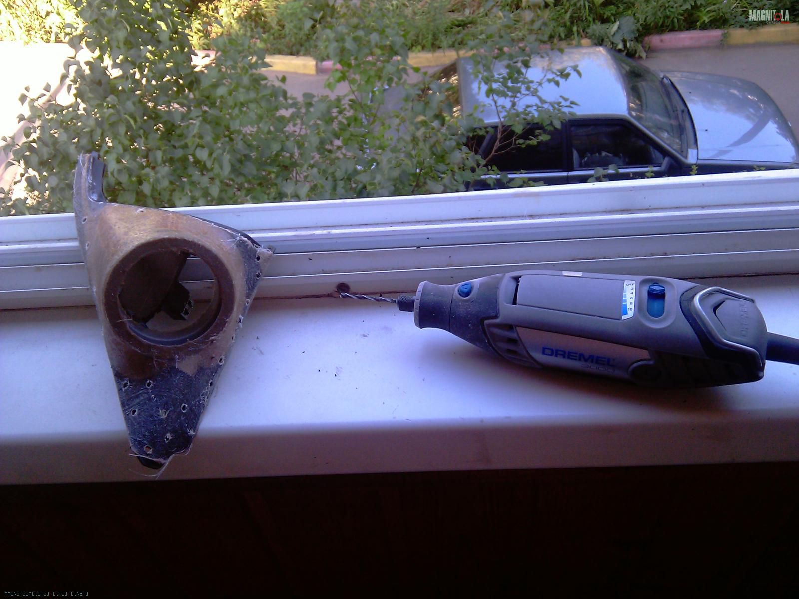 Размечаем на стойке место, где должно быть установлено кольцо под ВЧ и делам под него пропил дремелем. Вклеиваем кольцо на космофен.