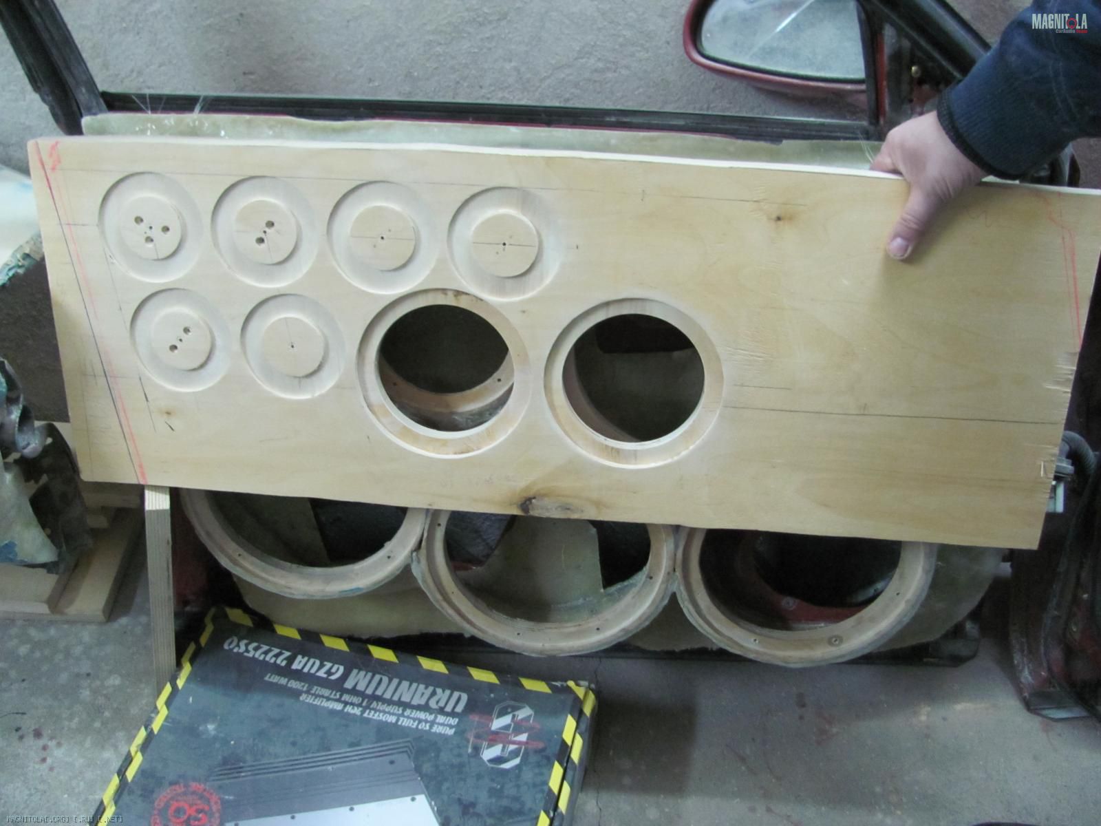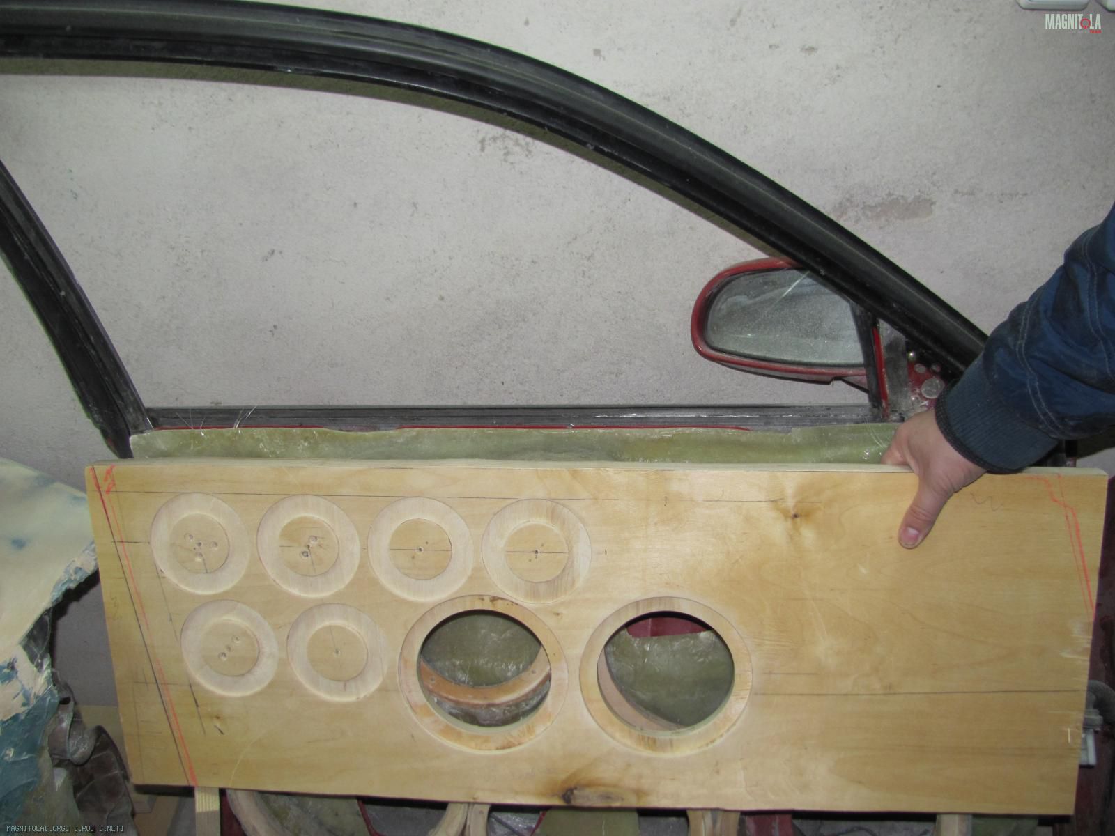 Не понравился итоговый внешний вид. Конечно у 99% громких машин он не лучше внешне, но мне захотелось какой то красоты, понятной видимо одному мне. Щит на дверь заново лепить слишком затратно и долго, поэтому решил срезать что есть и использовать остаток как основу для новой версии щита.