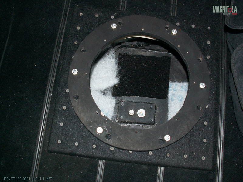 Короб в нише запаски. Прикручен на штатные болты крепления запаски. Квадратная нашлепка (на жидких гвоздях и саморезах) - наследие адаптации короба под саб Морель 12".