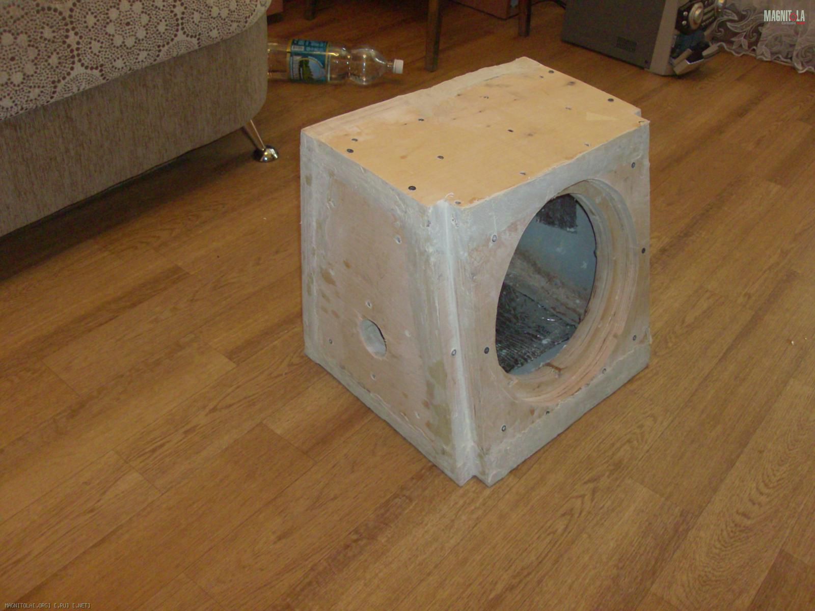 фанера толщиной 12мм, все стенки в 2 слоя, передня в 4. Слои между собой склеил "моментом столяр" + саморезы. Стенки между собой на жидкие гвозди + саморезы. Дополнительно изнутри швы промазаны эпоксидкой. Короб был полностью покрашен антигравием. После контрольной поверки на герметичность :laugh1: водой течи не обнаружены. Чистый объем получился 19л. (Помоему многовато для rw10, он не приятно гудит на некоторых композициях)