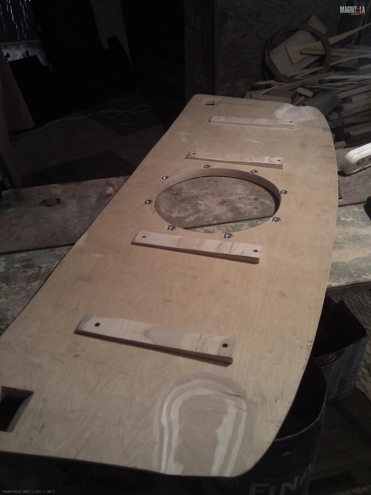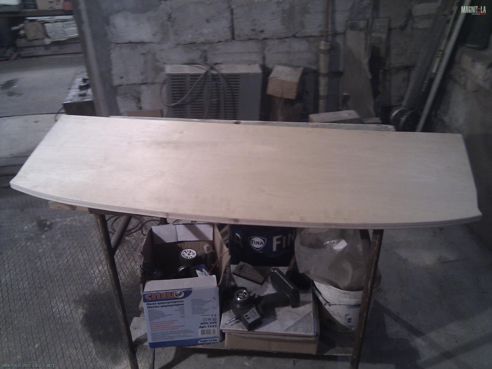 Была взята половинка листа 21 фанеры, и по лекалу, в роли которого выступала штатная полка из картона, была выпилена черновая основа полки.