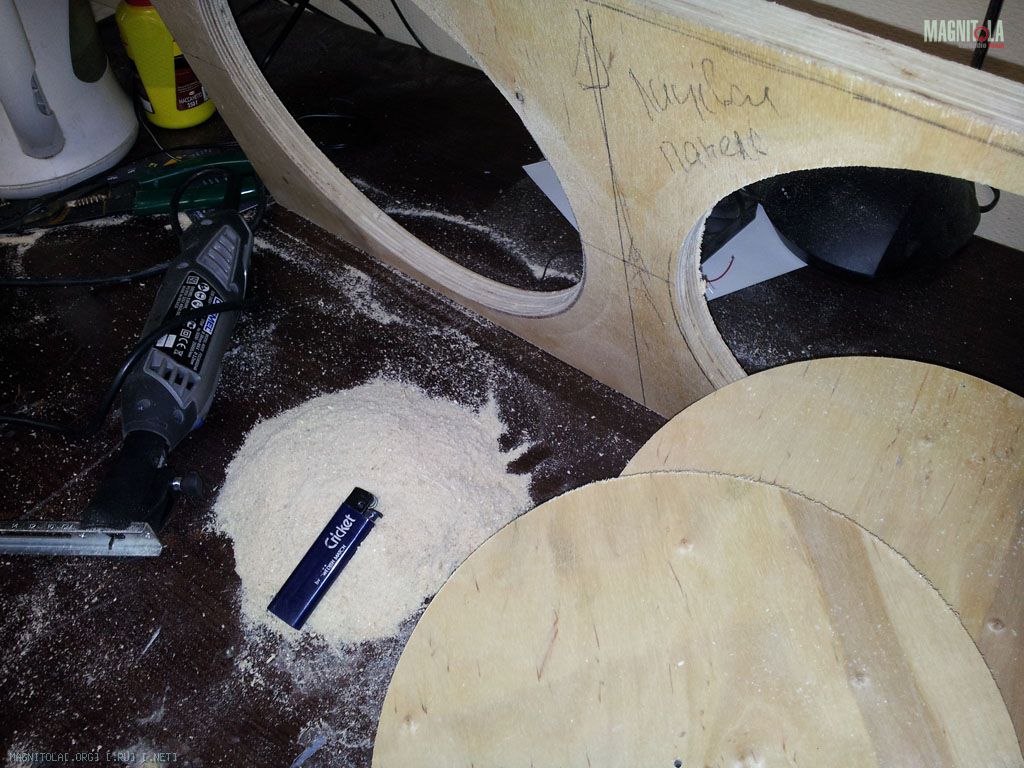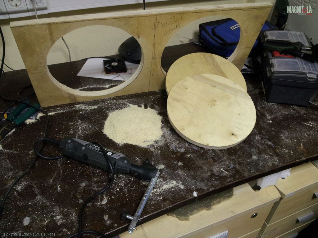 Далее делаем отверстия под динамики. Есть у меня фрезер, хороший такой фрезер, RYOBI, в пластиковом чемодане. Чемодан размером примерно как я на четвереньках. Доставать его, раскладывать - целая история, очень редко им пользуюсь.