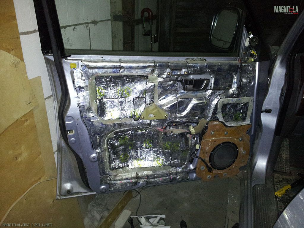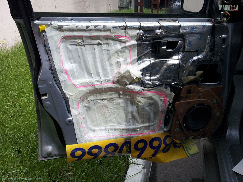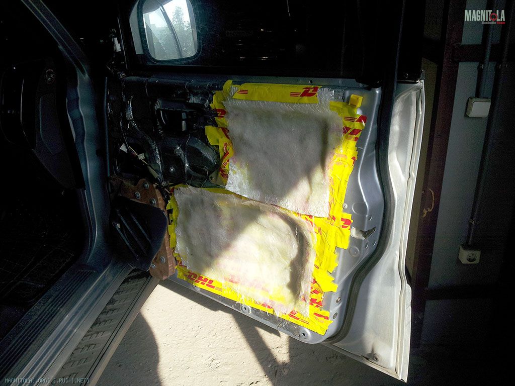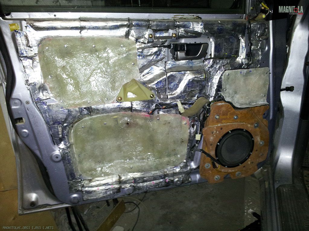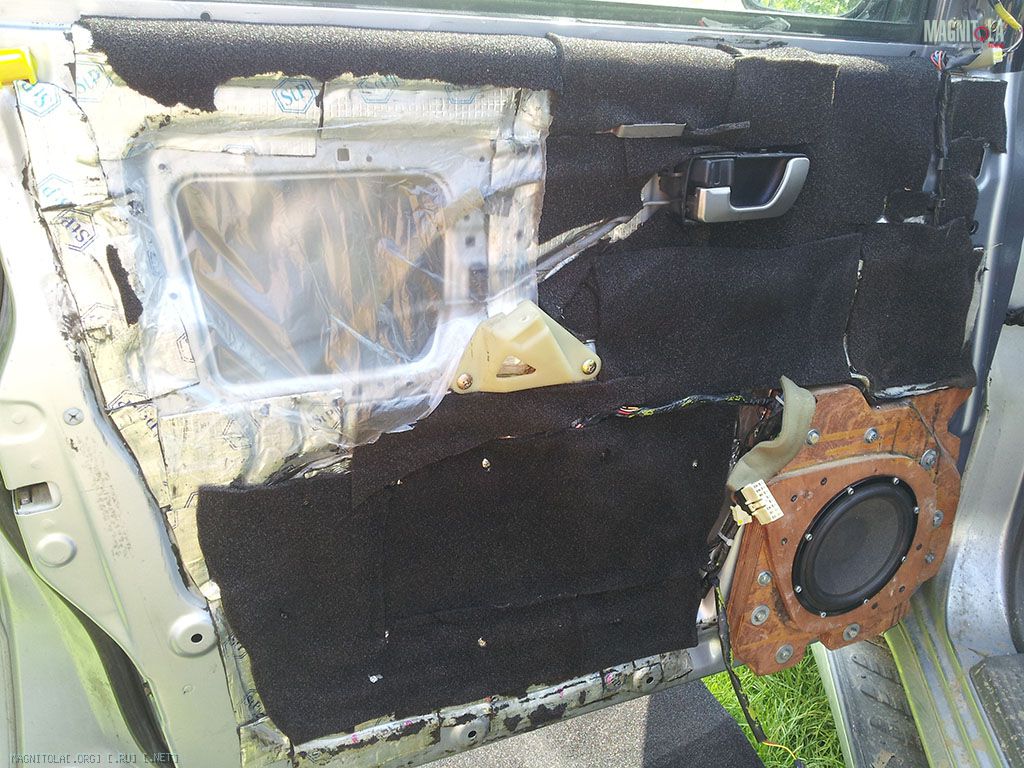 Лепота. Ща думаю как соберу двери, как послушаю - и офигею наверняка. Тут то и ждала меня красивая розовая птица обломинго. Верхняя часть пластиковой обшивки заходит внутрь филенки. Пришлось верхнюю заглушку снимать. Делал потом еще несколько попыток - фигульки, зазоры совсем децильные. Пока вехнее отверстие закрыто самым идиотским способом - пленка чтобы вода не затекала и два слоя битопласта прижимаются обшивкой. Ни о какой жесткости разговор не идет.
