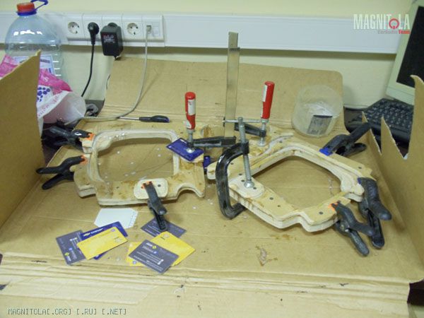 Наконец обшивка легко встает на место, можно собрать вместе. Эпоксидка, струбцины, все как у взрослых.