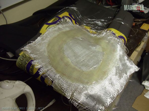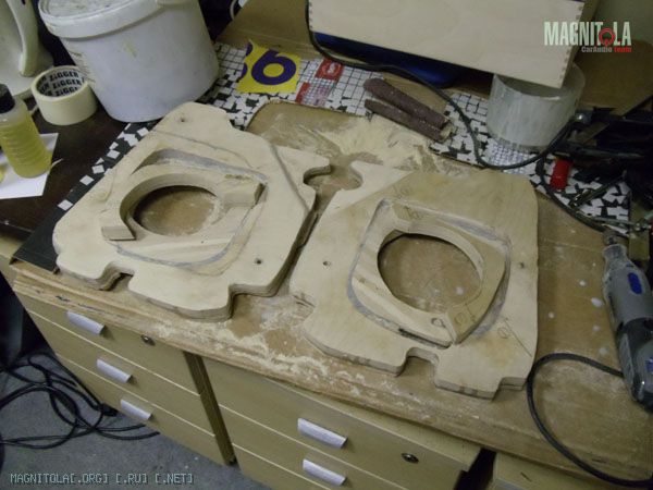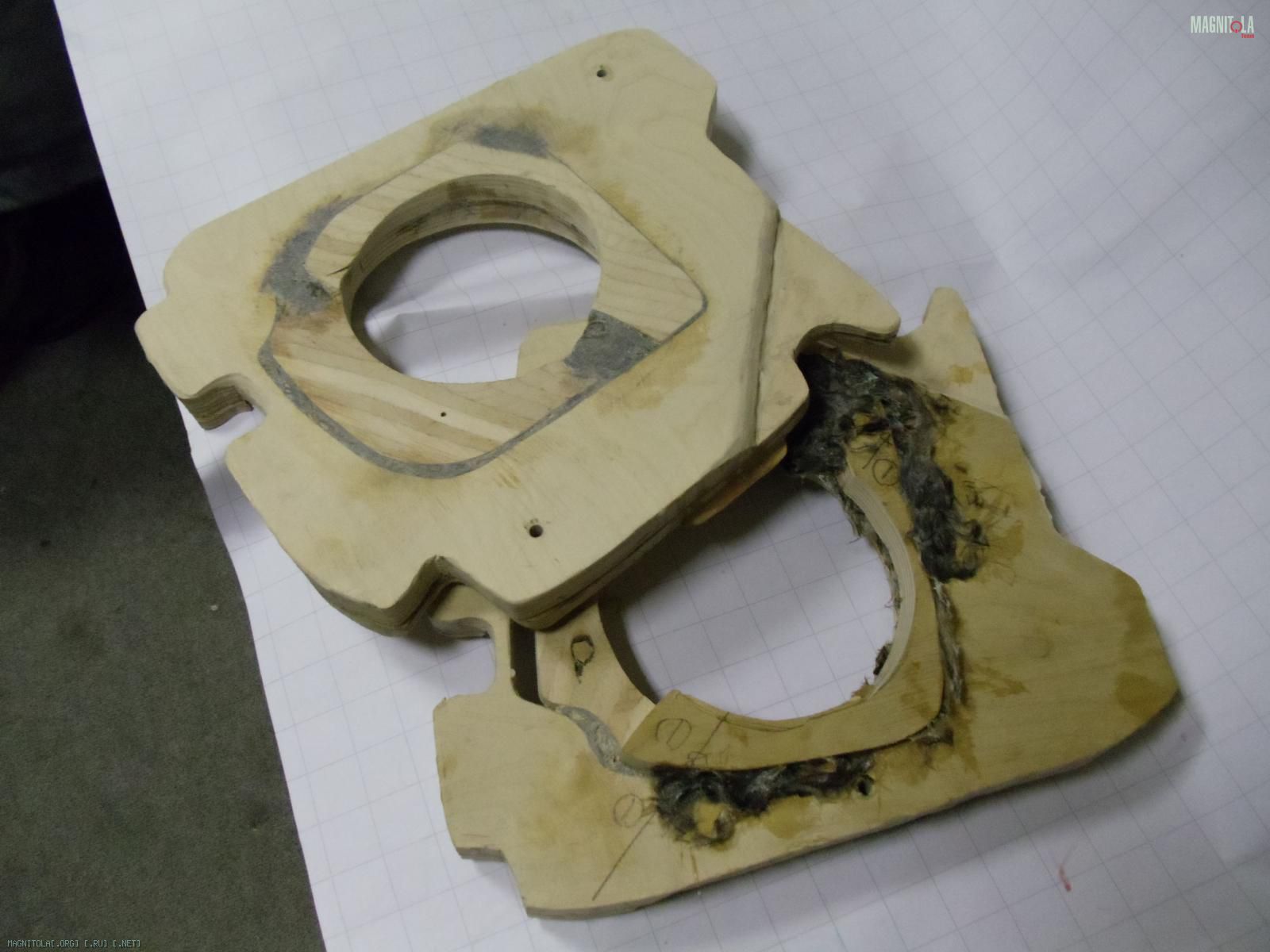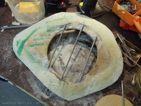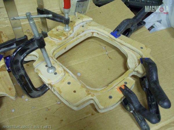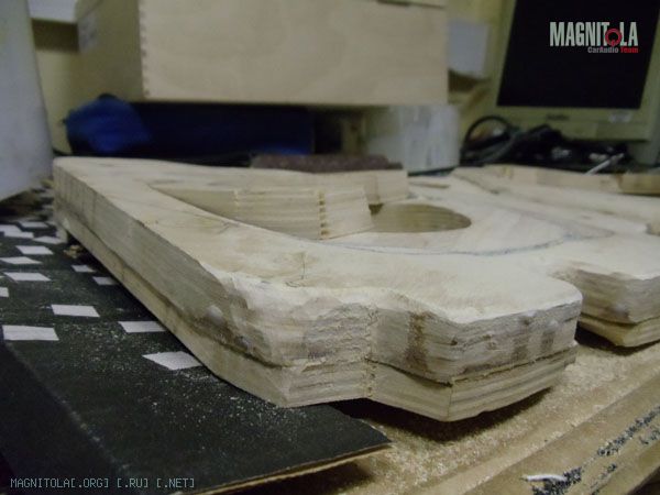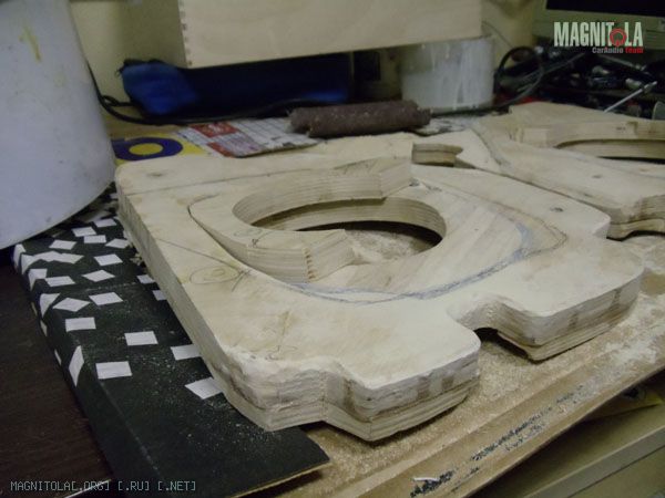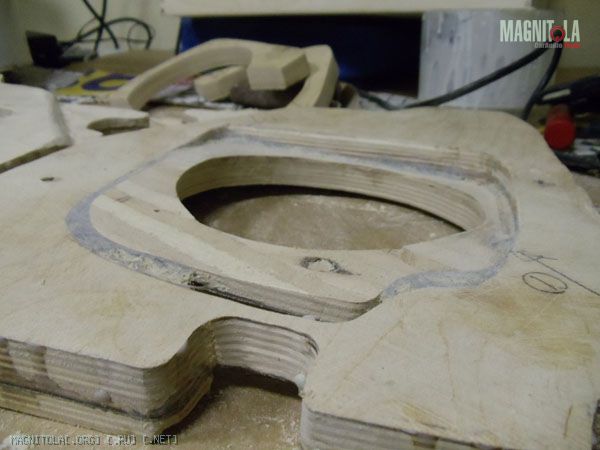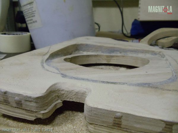 К основанию подиума допиливаю еще по два слоя фанеры 10тки. Один будет посадочным местом динамика (естетственно посажен на смолу), второй слой станет частью гриля.