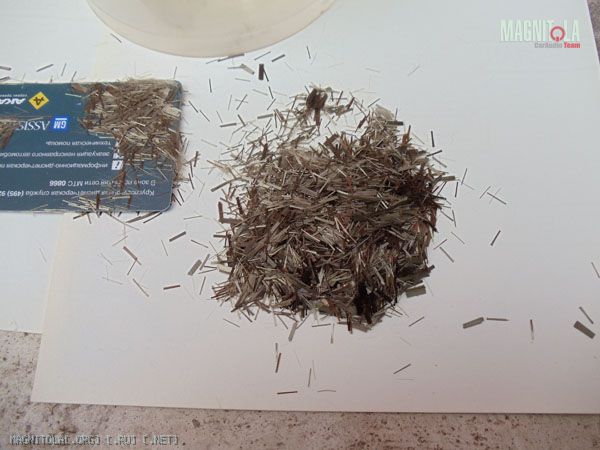 Это рубленное стеловолокно. На самом деле такой штукой пользоваля на прошлой машине, когда стелс под саб делал. При размешивании волокна размокают, разбухают и получается густая такая масса. Я бы даже сказал комок, который можно даже чутка формировать. Когда смола встает, получается очень прочный монолит. Обрабатывать сложнее чем например шпатлевку со стекловолокном, но оно того стоит с моей точки зрения.