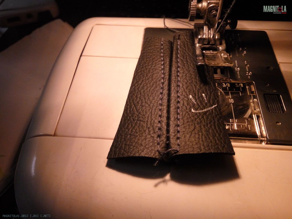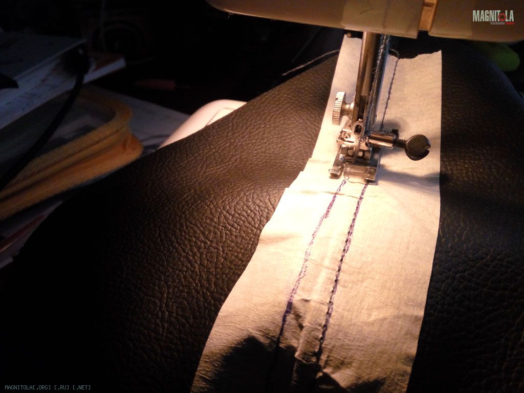Долго мучился с автомобильным швом, у меня самая обычная бытовая швейная машинка, когда сшиваешь куски с изнанки, все хорошо, тканевая подложка – одно удовольствие, знай на педаль газа жми, да нитки новые заправляй. А вот с боковой отстрочкой хуже, получается снизу и сверху винил, лапкой прижимается и податчик материал уже не может проталкивать как положено, застревает, стежки получаются мелкие и разной длины.