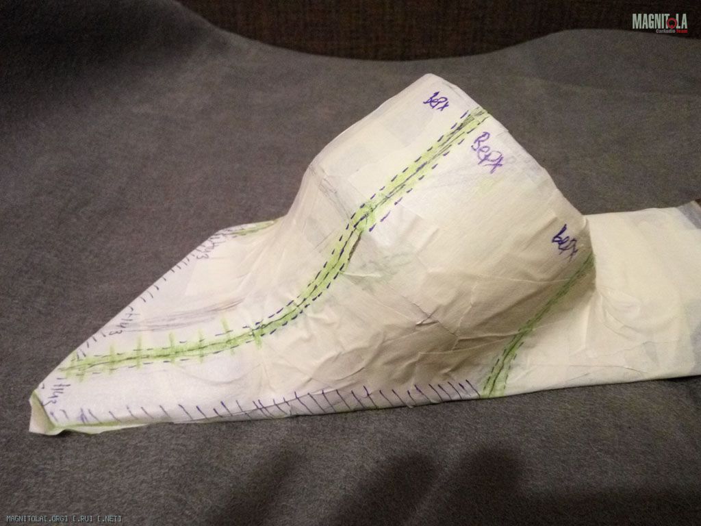 Отработал шов, начал мучиться с выкройками. Залепил скотчем, стал фантазировать. Было несколько вариантов, и как то нарисуешь – и чувствуешь, не то. А потом как то так взял, нарисовал и понял – оно ))