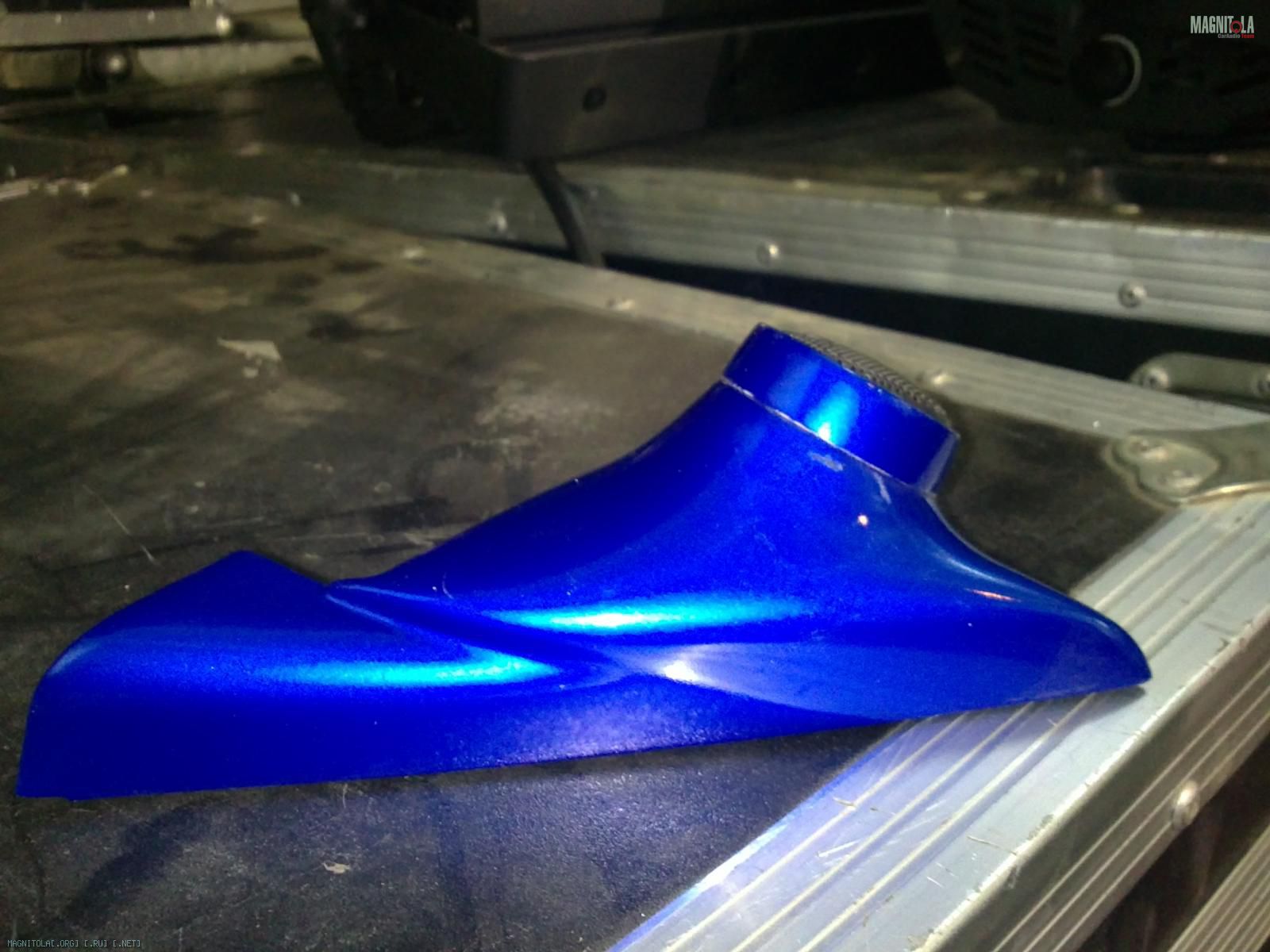 Саб-Стэлс - на его возведение потребовалось пара вечеров, лист фанеры, картон и горсть саморезов. Изначально излучателем низких частот была головка 12" калибра от Pioneer, вмонтированная в этот ящик. Он получился весьма "музыкальным" и в какой то мере привлекательным (модный синий "субару-карпет"=)), но с недавних пор пришла идея перейти к "стерео-сабу", для чего были изготовлены новые стэлсы, уже по другой технологии (стеклопластик), и переход с 12" калибра на 2х10"(об этом позже).