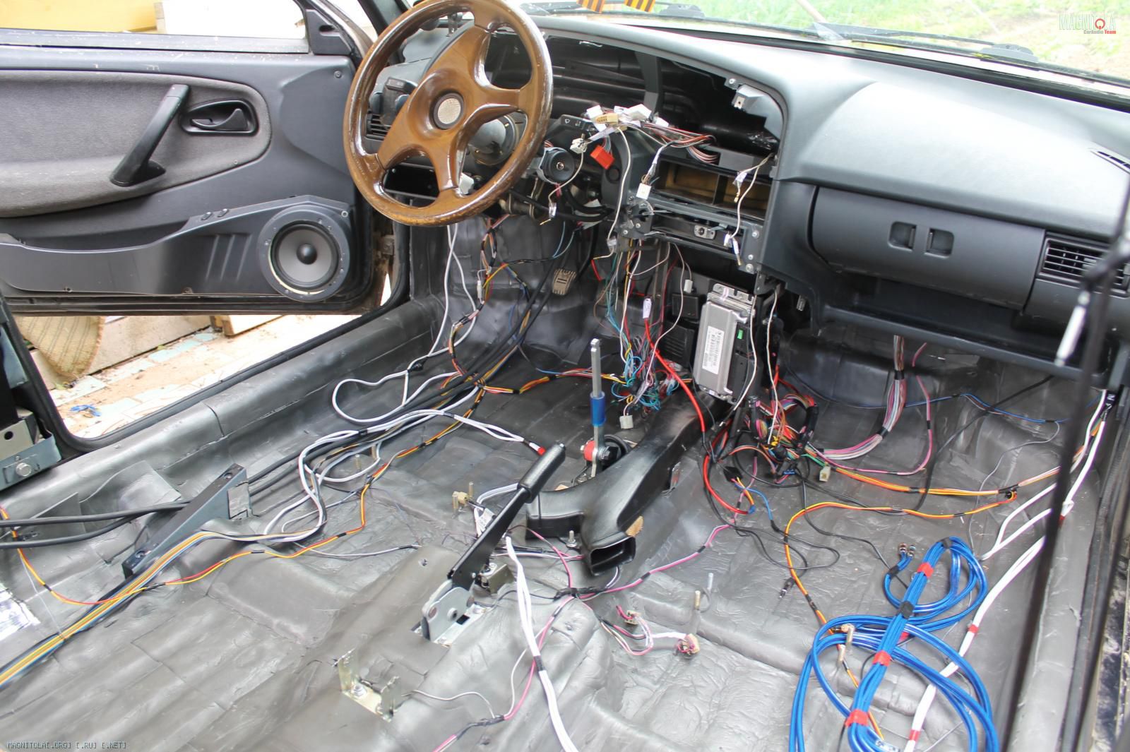 Все провода изначально решил упаковать в гофру и саморезами намертво прикрепить к полу. Впринципе так и было сделано, за исключением межблоков - каждый провод довольно объемный и плоский, поэтому более целесообразно было составить из них единую шину и отказаться от гофры.Таким образом сила легла по левому борту (запихнул оба провода в одну трубку), левый канал по центру, правый канал с межблоками по правому борту: