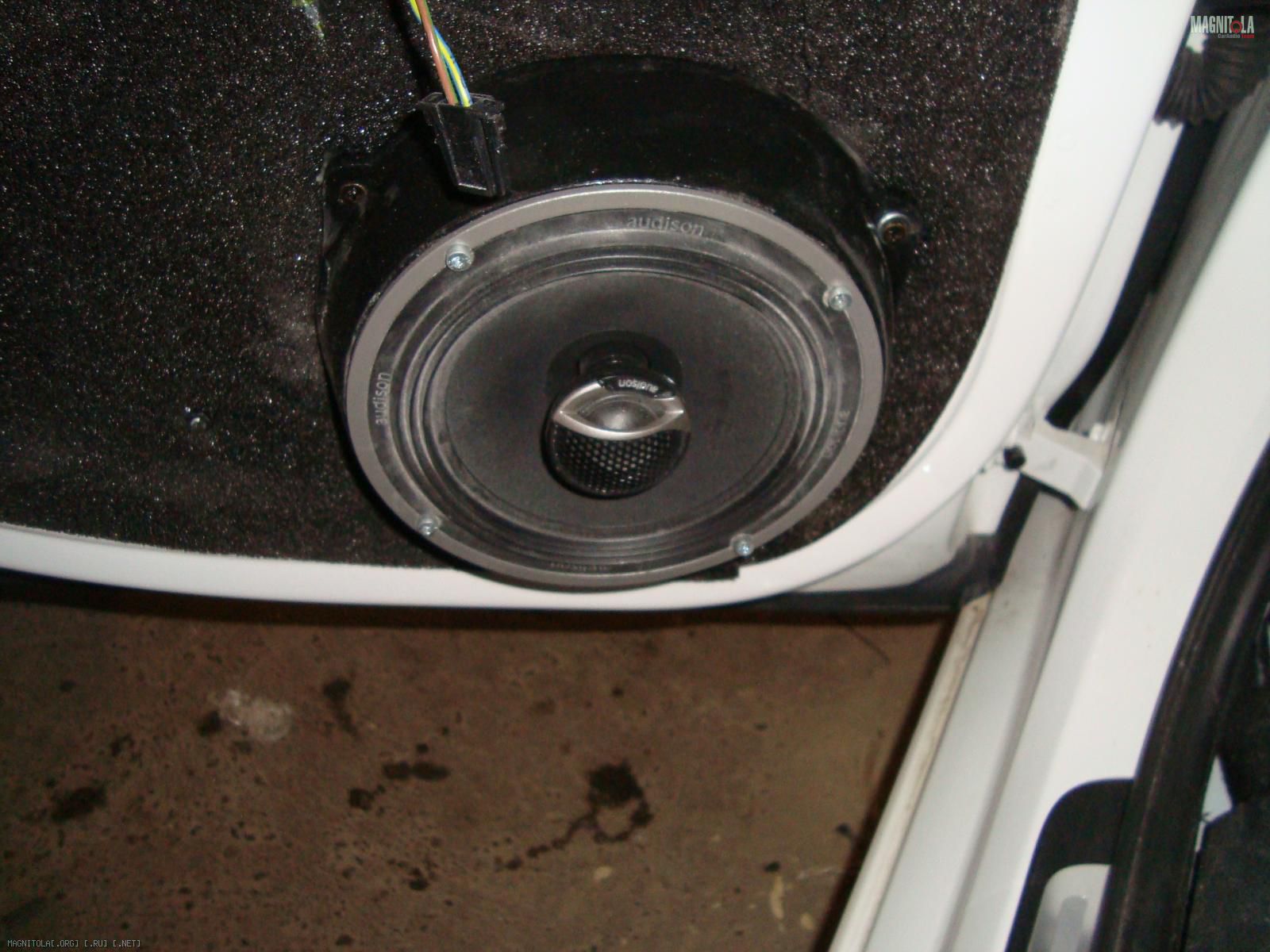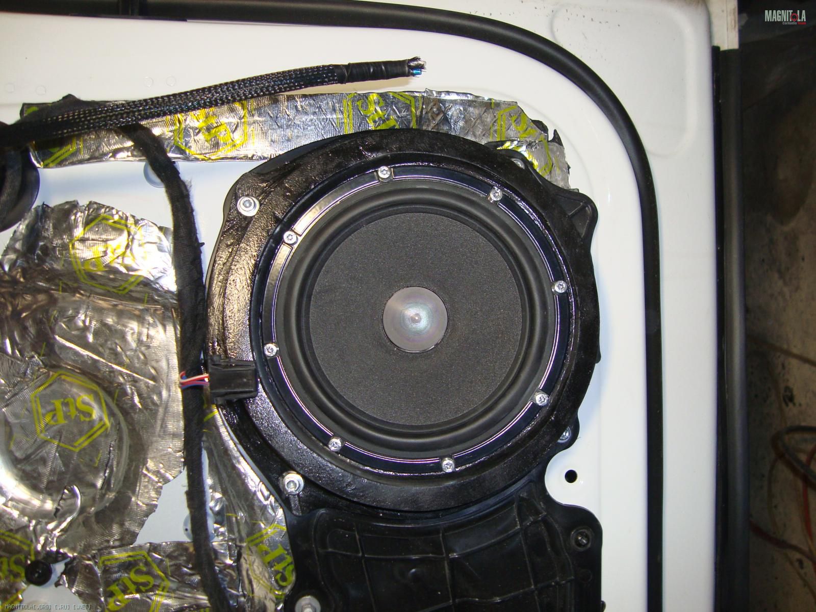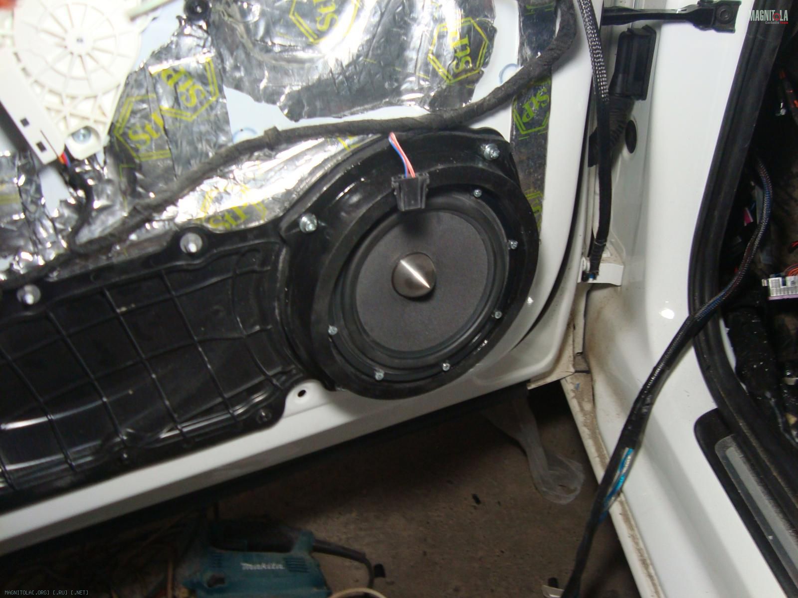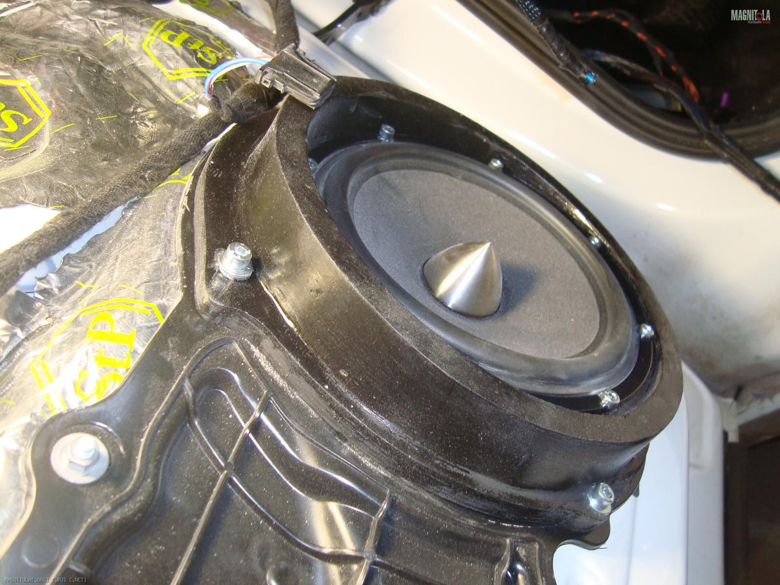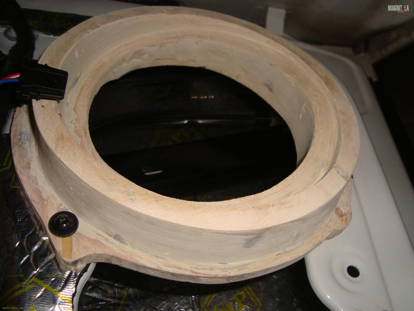 Проставочные кольца под фронтальные мидбасы изготовлены с доворотом. посадочное место проставки идентично штатному динамику,закручено на 4 болта м5 в родные дырки. за динамиками наклеена акустическая линза.