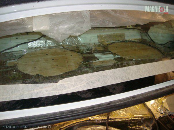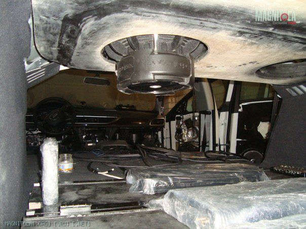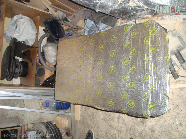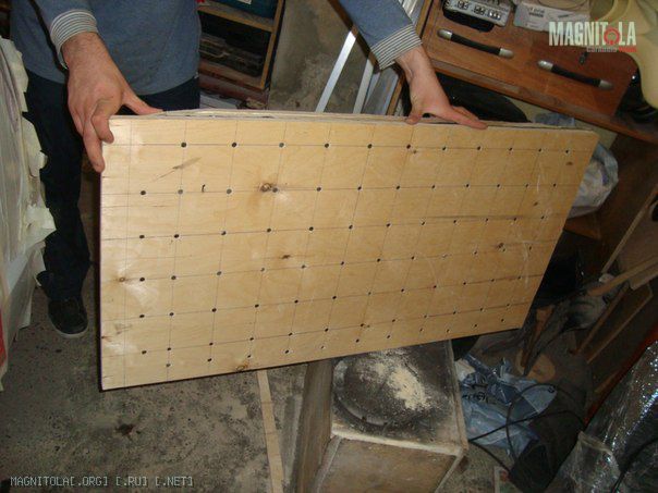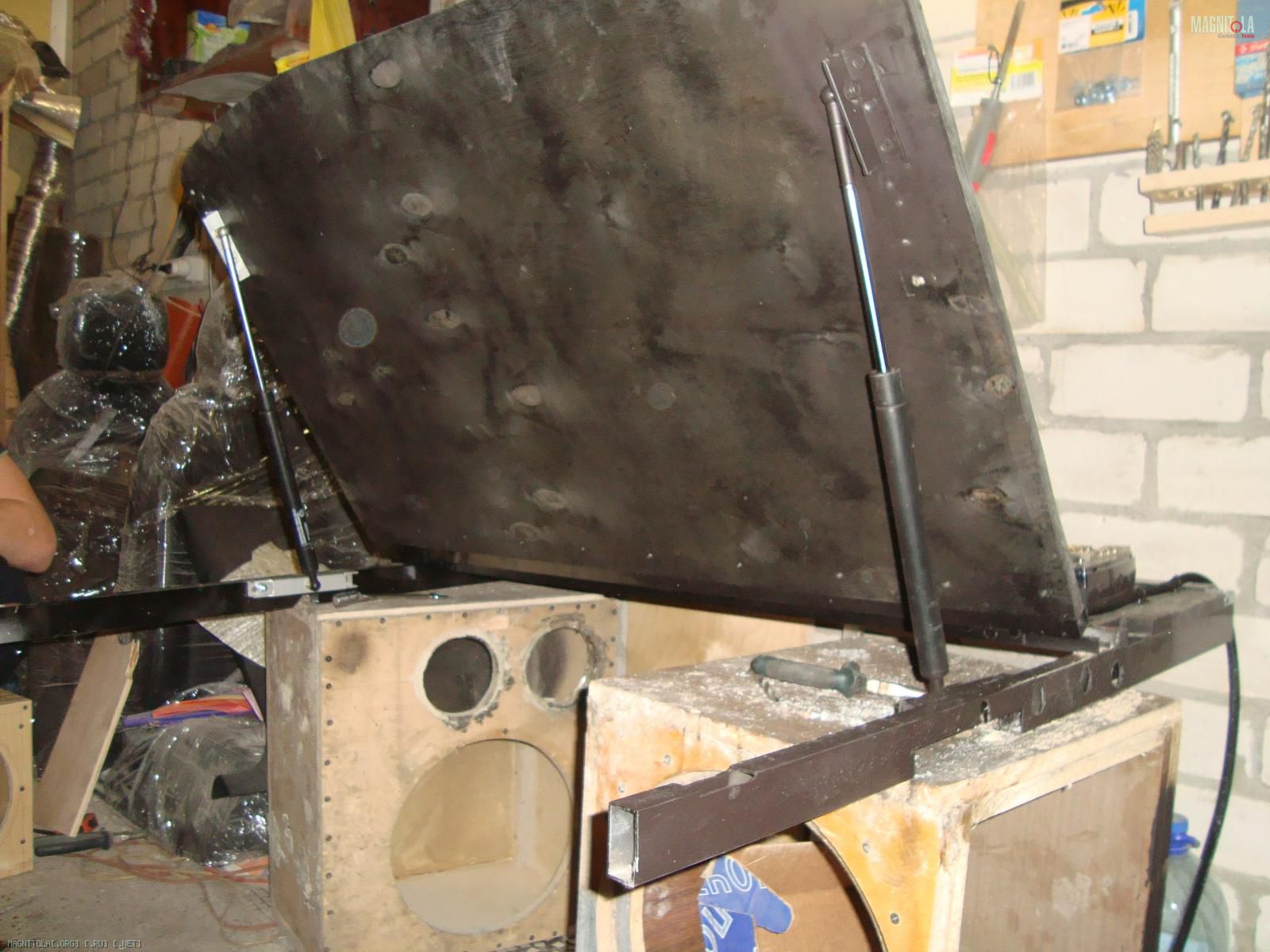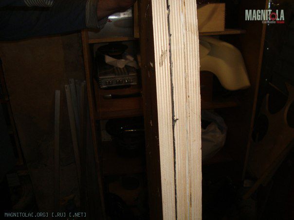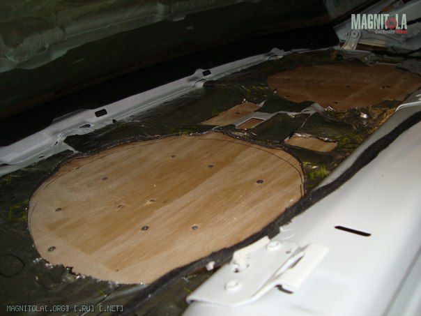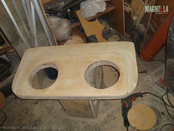 Полка под сабвуферы изготовлена из фанеры(толщина 53мм)и крепится на 13 болтах к металлической полке автомобиля. между слоями фанеры уложена вибоизоляция и стянута на саморезах, другие слои склеены.