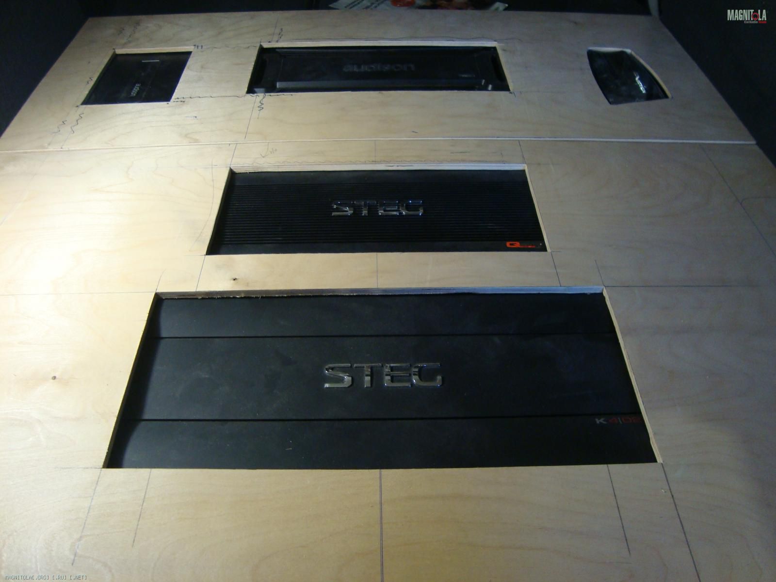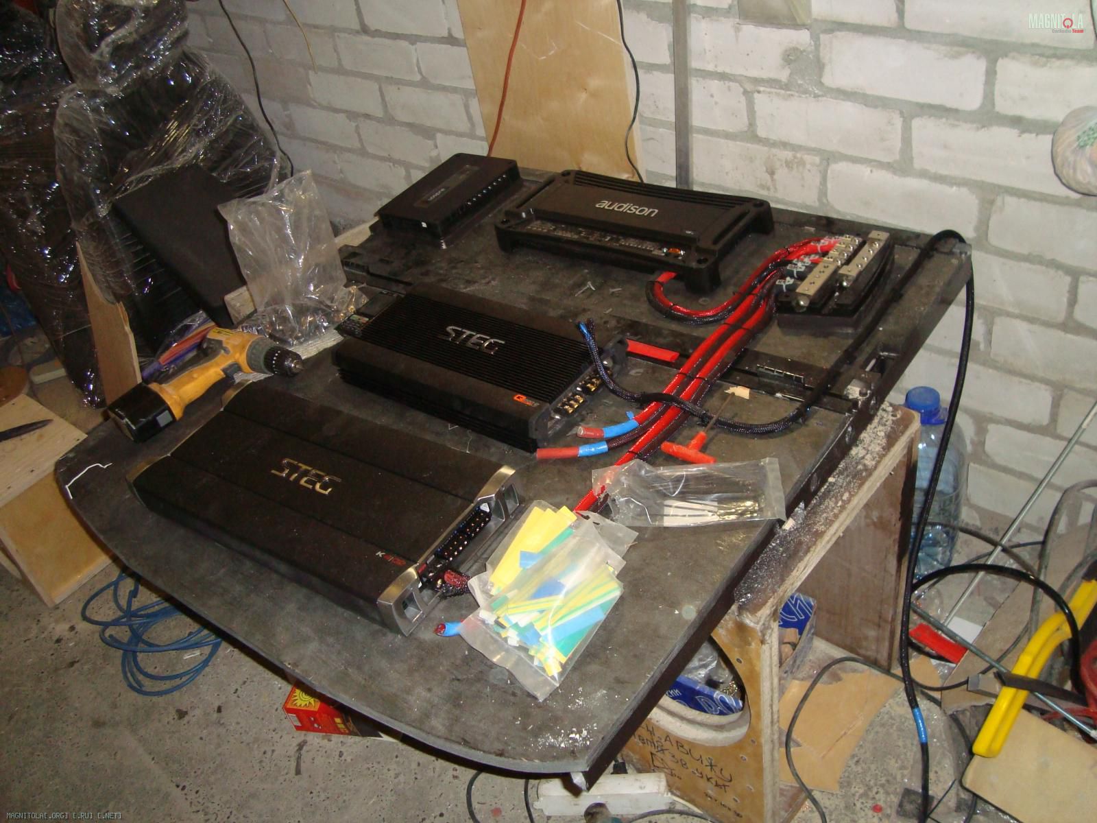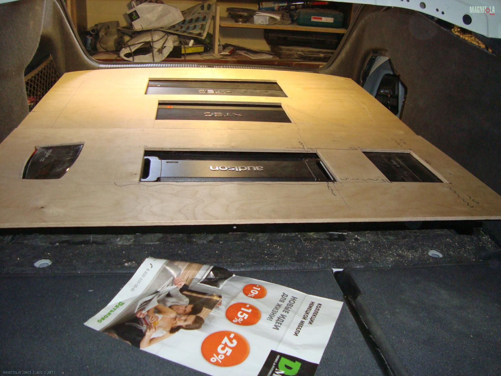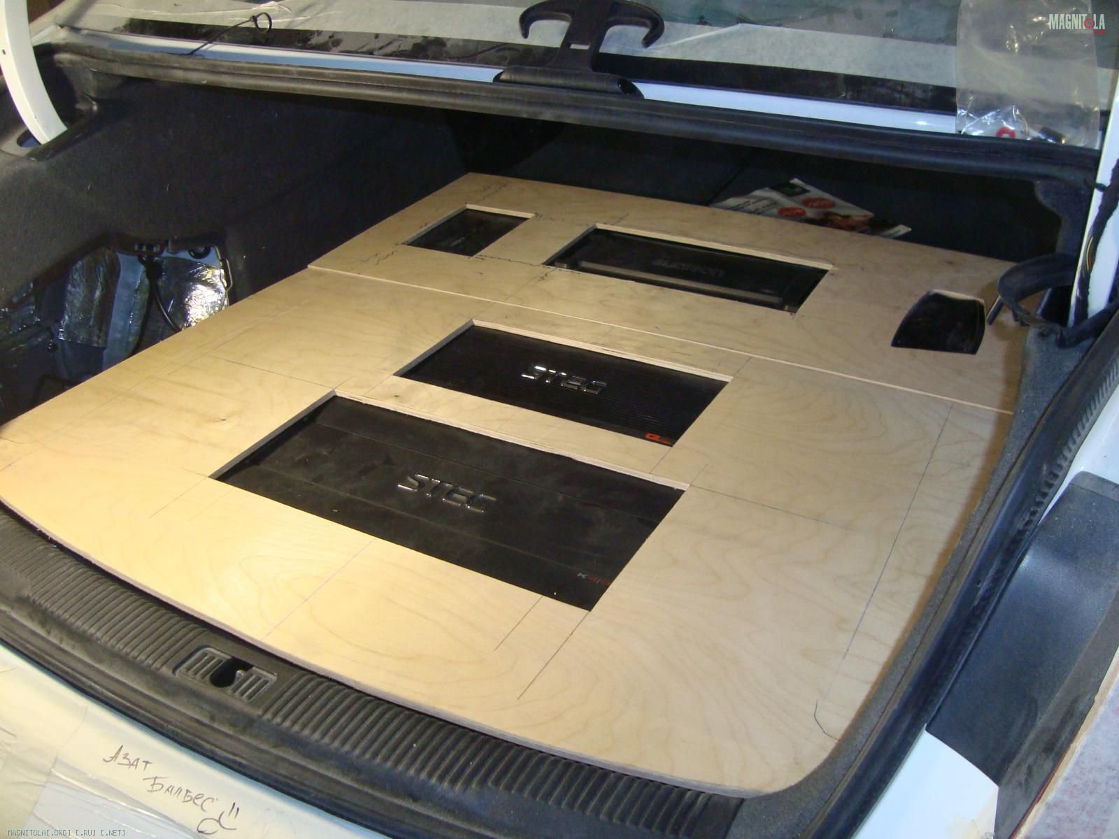 Багажник-здесь дана воля фантазии. Изготовлен фальш-пол из алюминиевых профилей и фанеры. на котором расположены все компоненты. весь багажник так же затянется алькантарой. усилители с процессором пойдут под стекло с подсветкой.