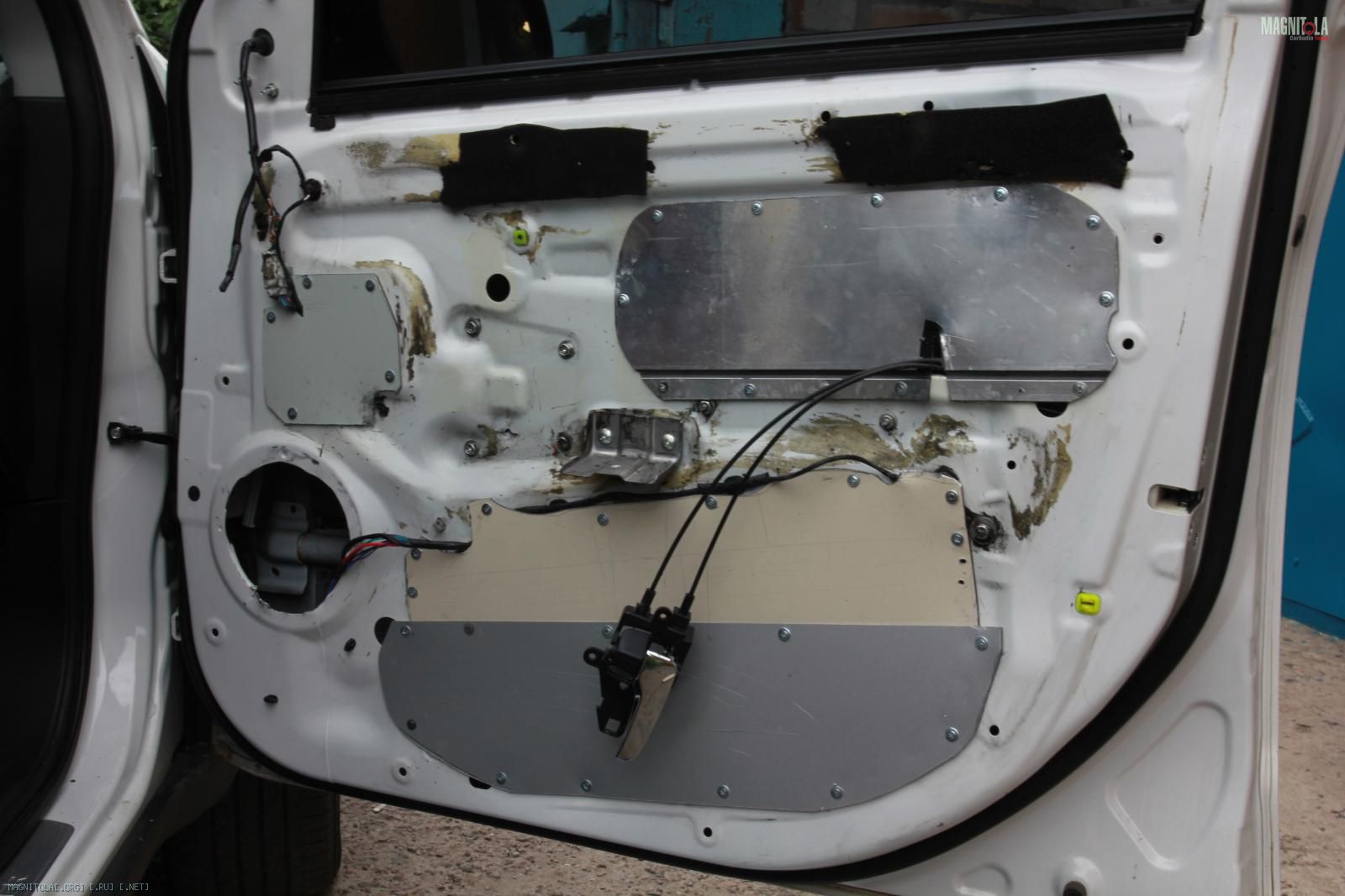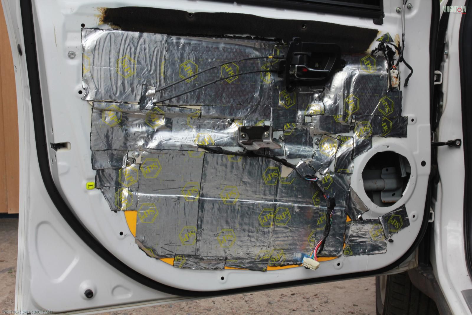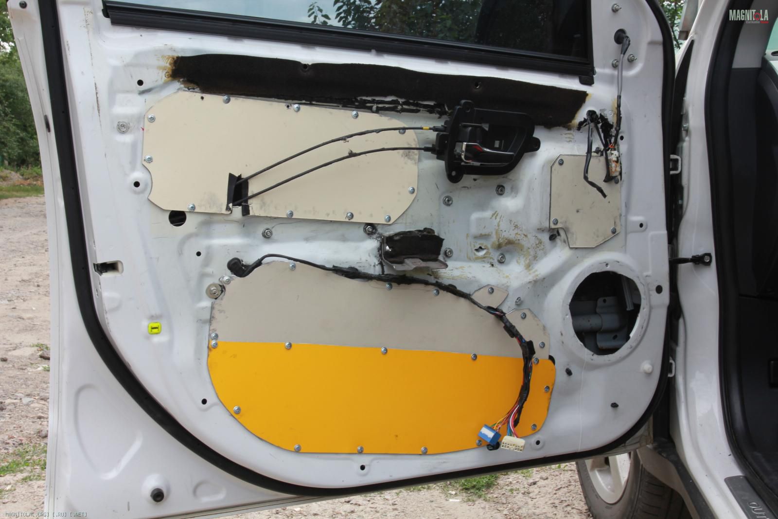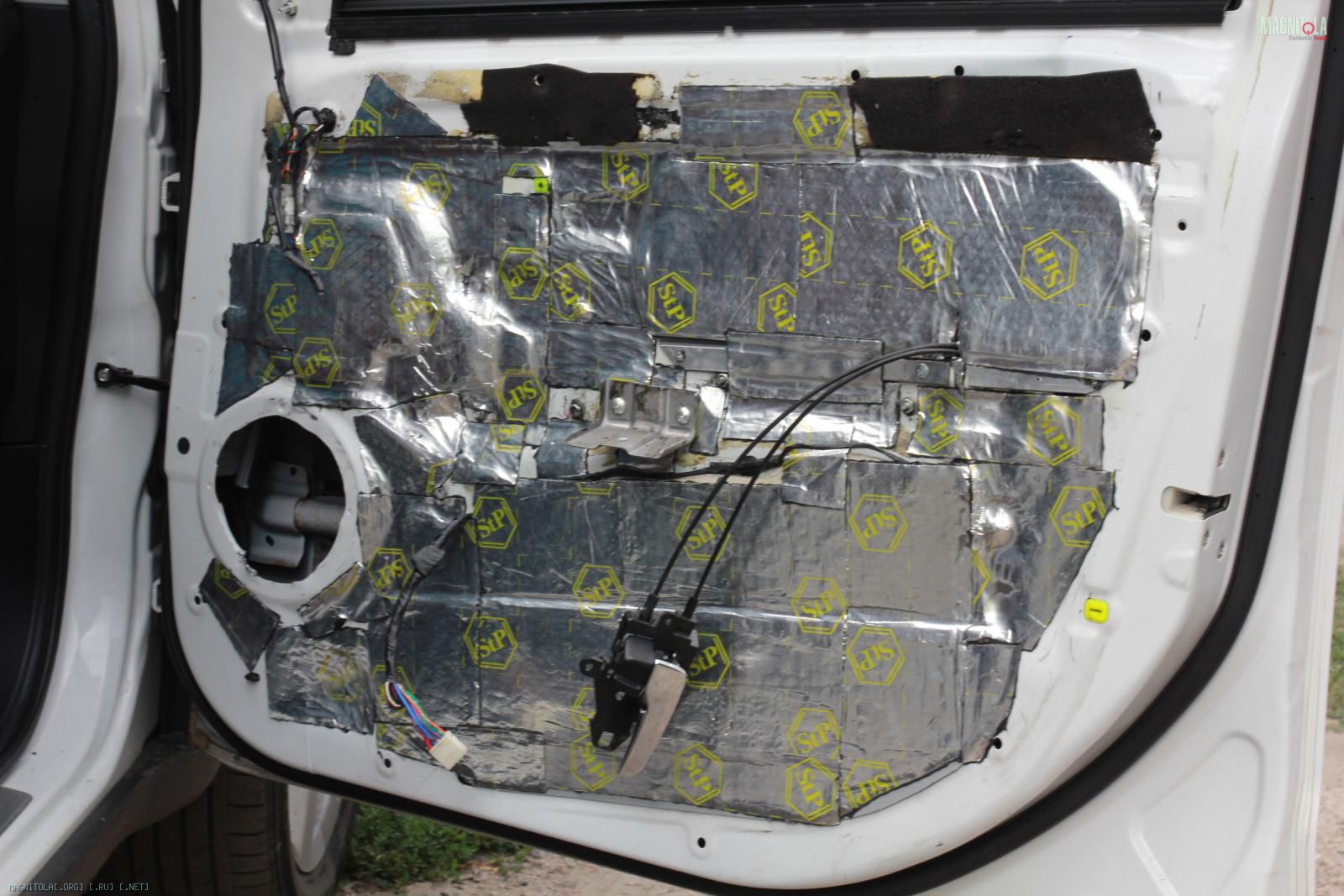 В общем, мои давние опасения подтвердились (двери подозрительно глуховато закрывались): открутил карты передних дверей, а там..... шумка.... Точнее - жалкая ее пародия: КИКС ноискиллер на внутренней стороне наружной части, технологические отверстия филенки тоже им же заклеены (на металле филенки - ничего), а сверху - просто Битопласт5. Карты голые. И вот вся эта вибра как волны играет в заклееных отверстиях... Может, кому для акустического комфорта и годится - но нам, автозвуковикам, этот вариант не катит... То есть надо всё отрывать, отмывать и делать по уму. По моим расчетам, я планировал за день заклеить обе двери (надеялся ведь, что они голые) и на второй поставить миды, протянуть провода.... Ага, щазззз! :)