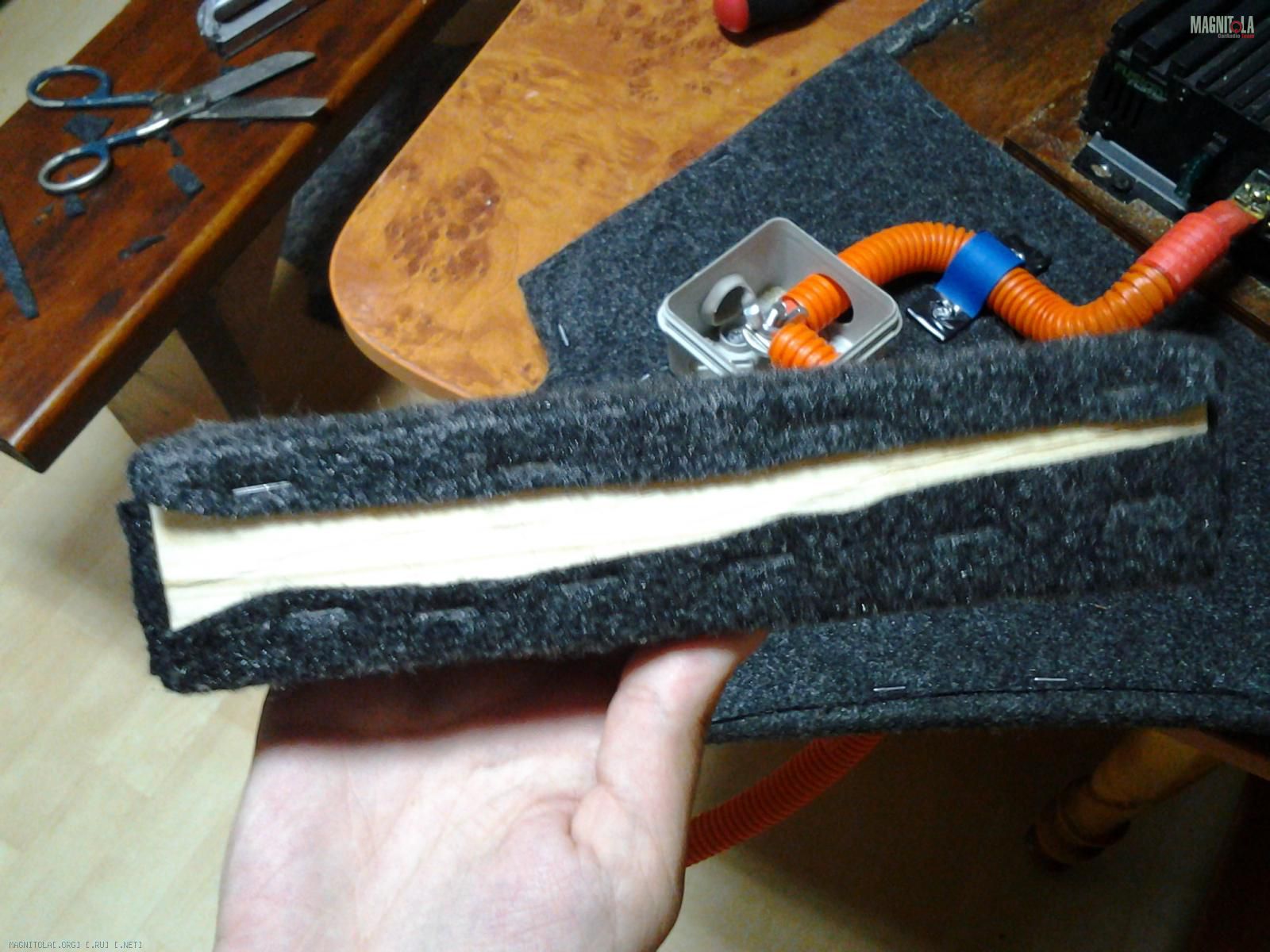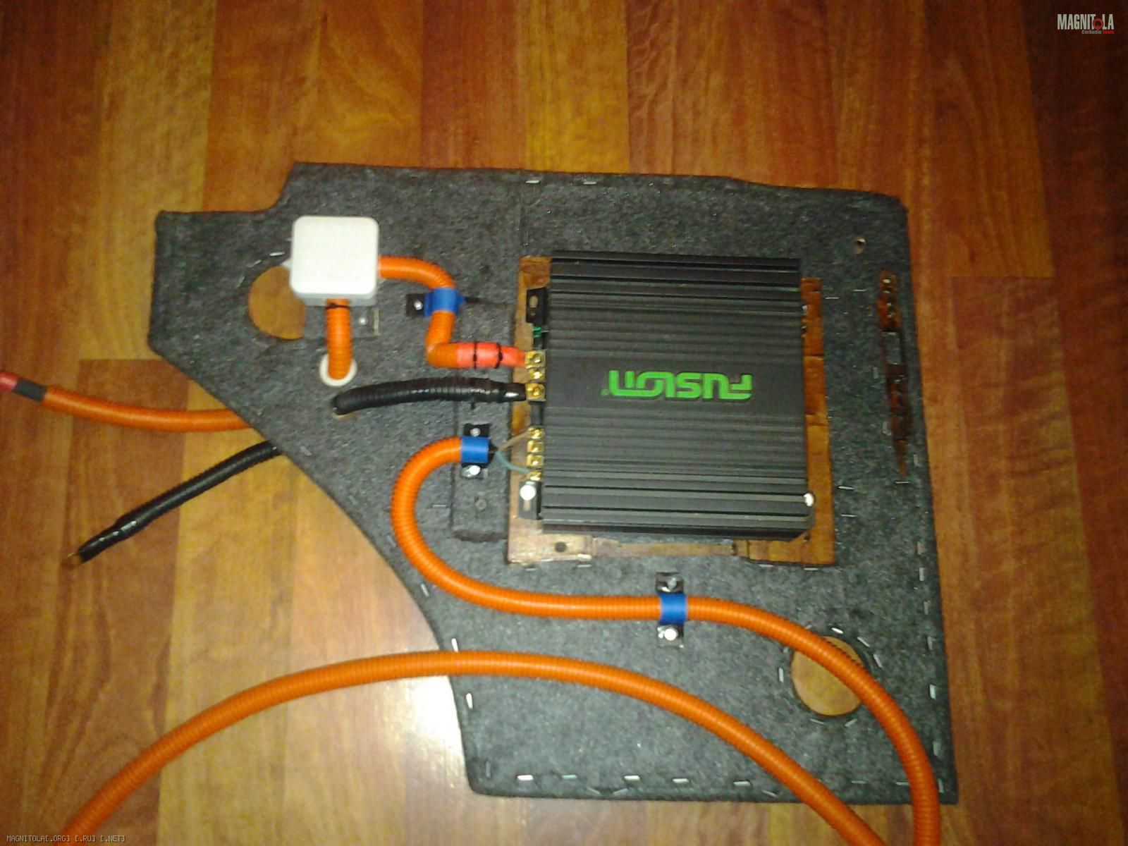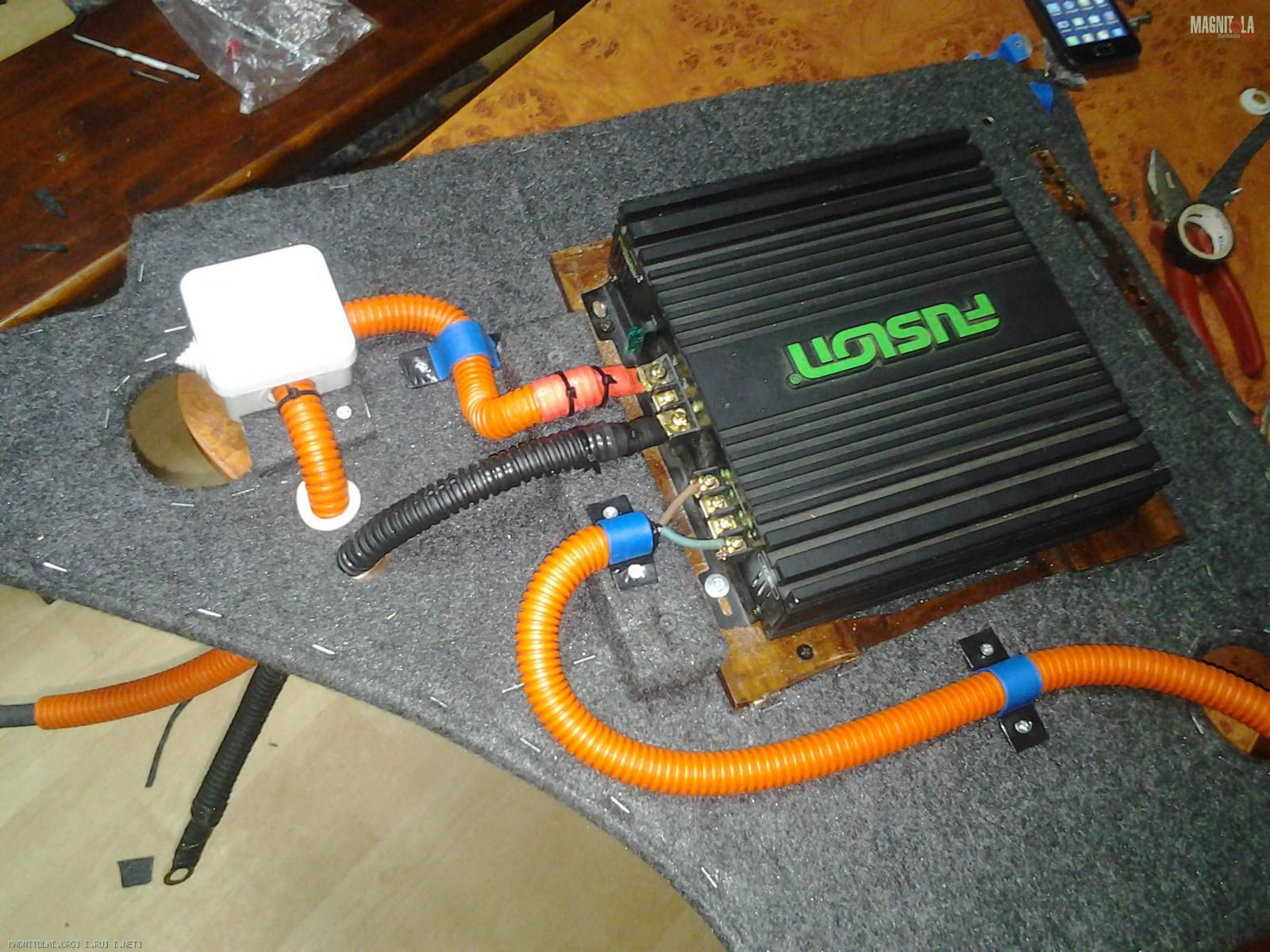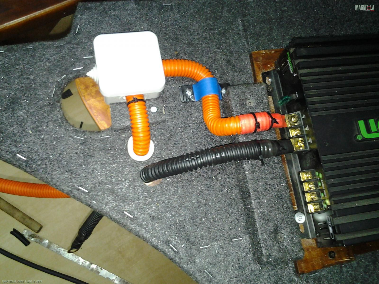 Гофра от коробочки до Фьюжена, может, и не обязательна, а на то, что не скрыто двумя листами фанеры- так вполне.Хотя бы, помимо всего прочего- для единства стиля- метить плюс оранжевым. И предохранитель на реле- обязателен, на 1-2А. Можно олдскульный радиотехнический.