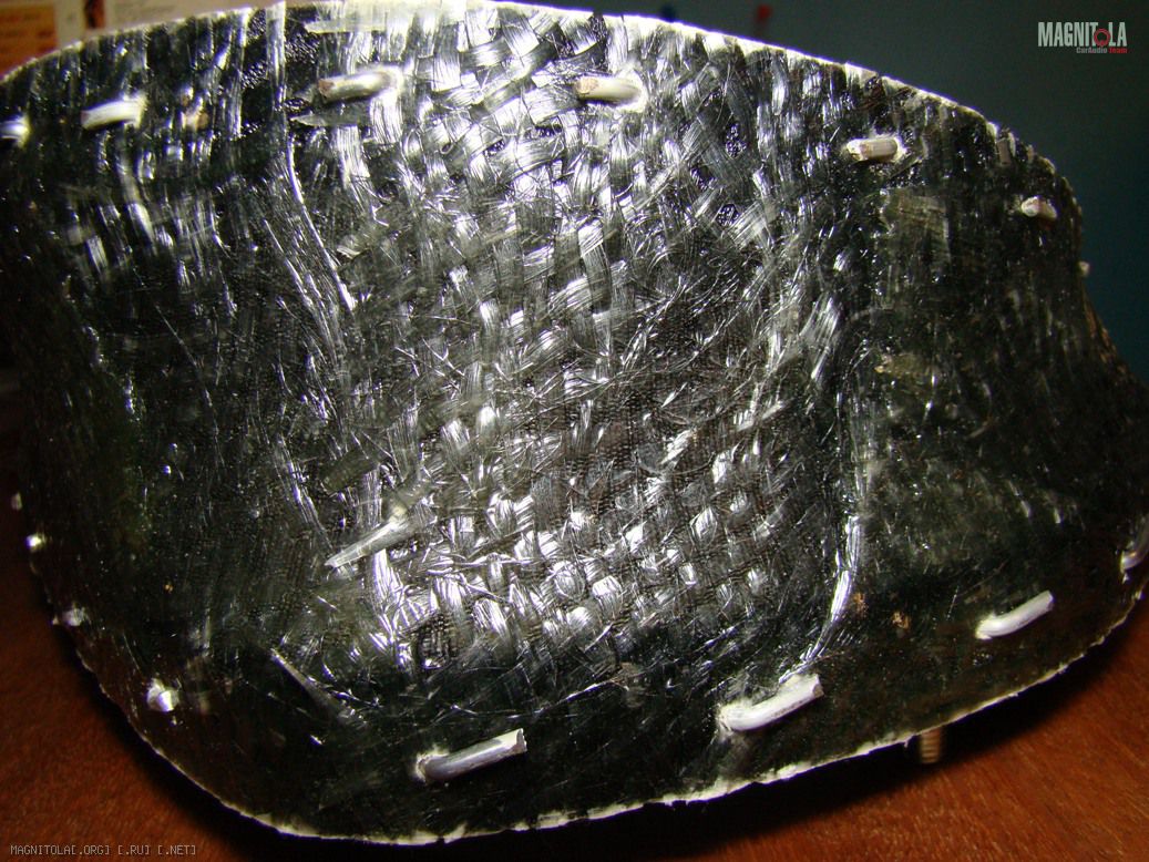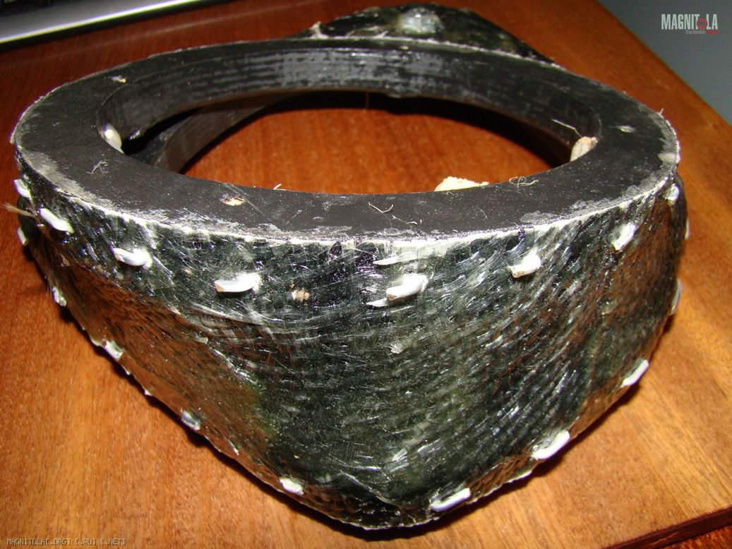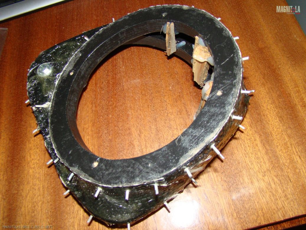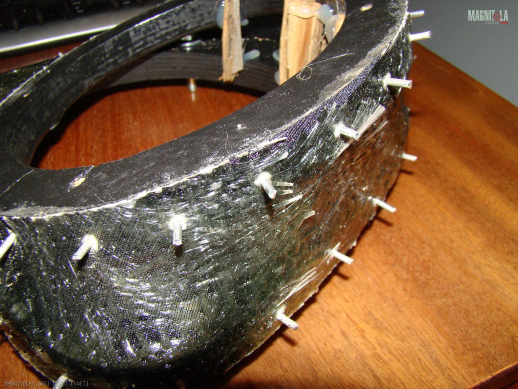 После наложения первого слоя стеклоткани было решено основательно закрепиться за кольца. Насверлил отверстий тонким сверлом, забил штырьки из алюминиевой проволоки. Затем молотком загнул их. Поверх еще ляжет слой стеклоткани.