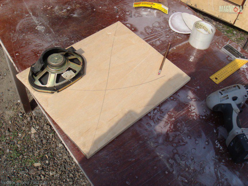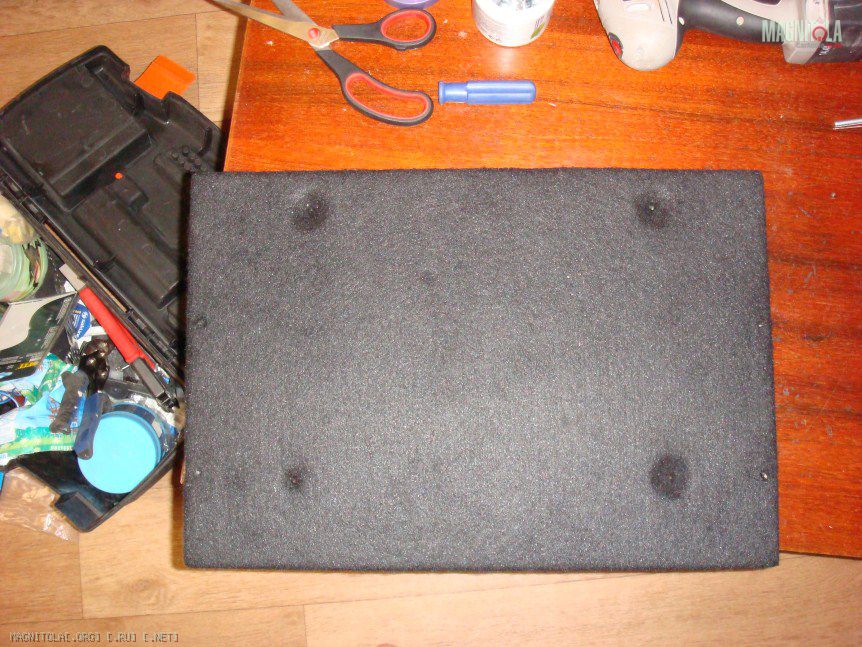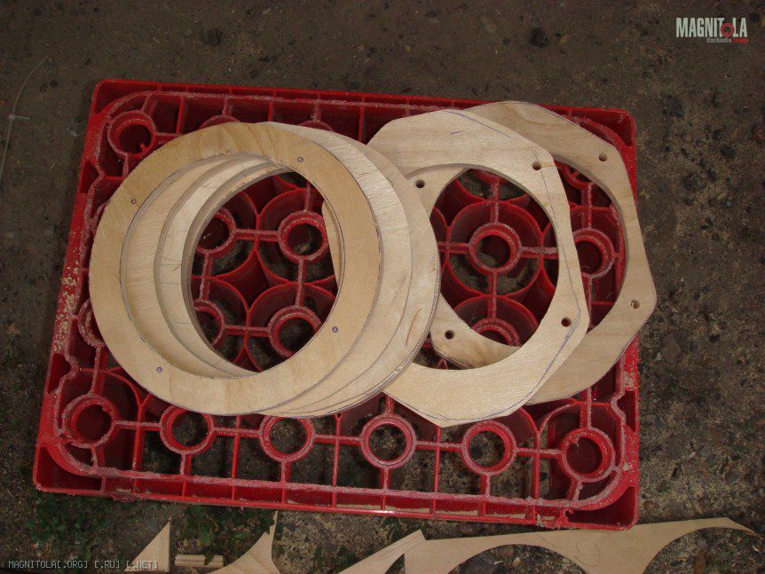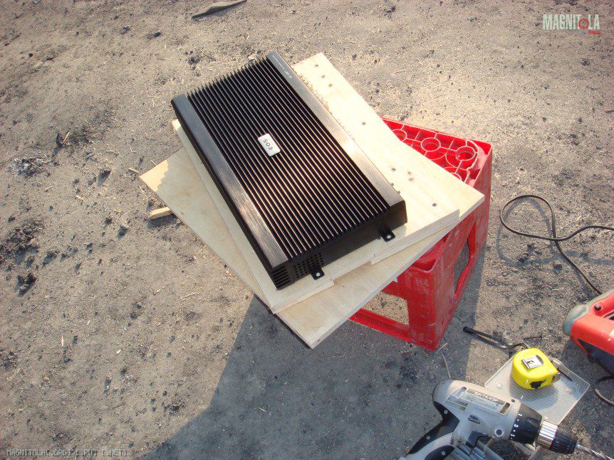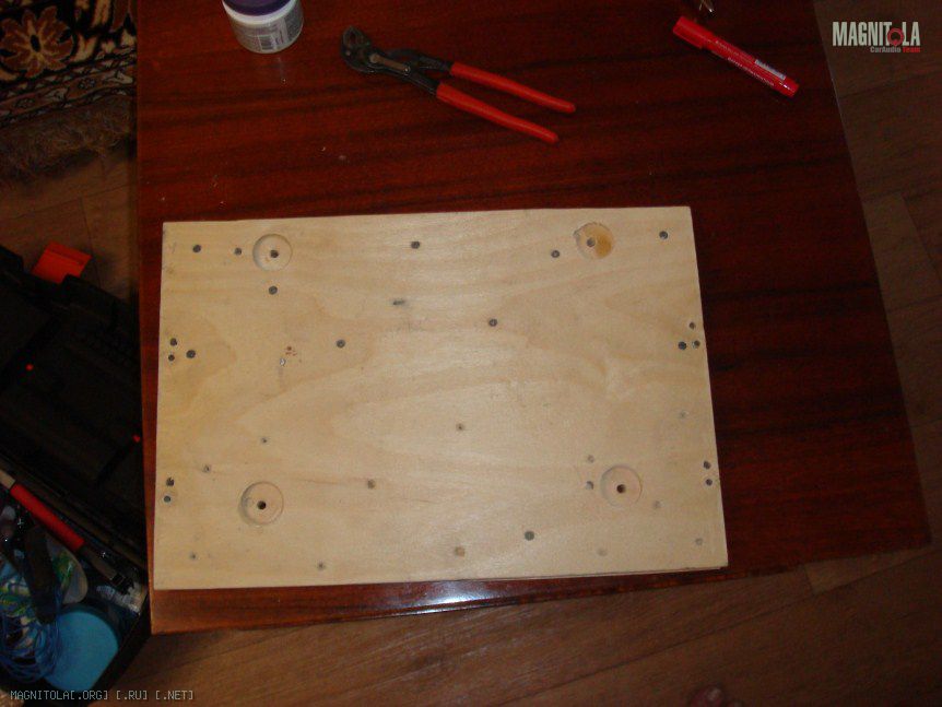 Да кстати, фанерко на площадку усилителя нашел у соседа в гараже. Кривая как сабля. Пришлось намочить её немного и на ровную поверхность под пресс на двое суток.