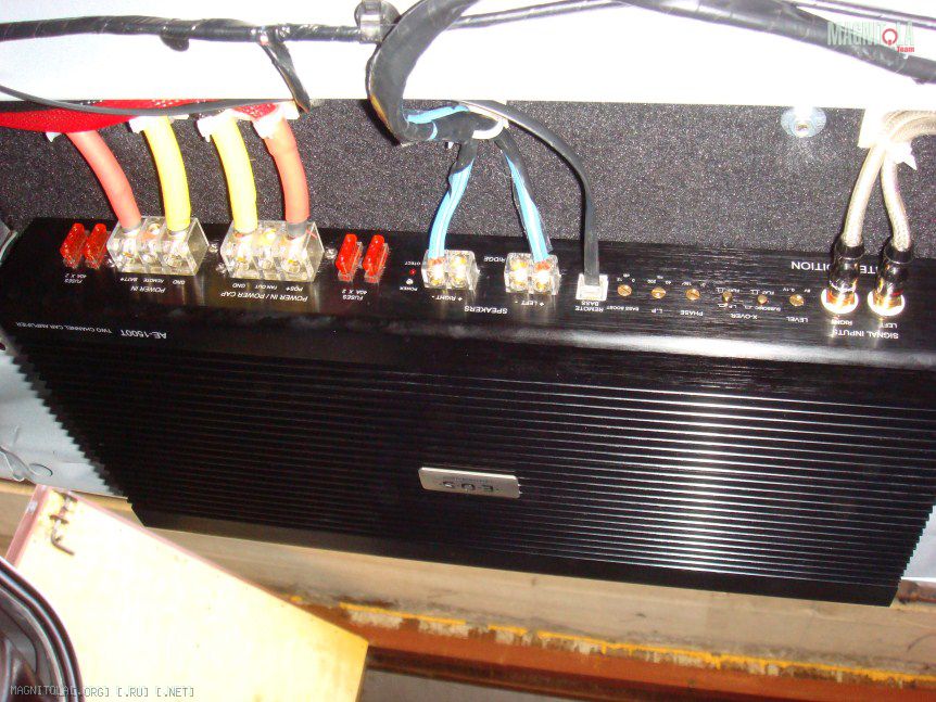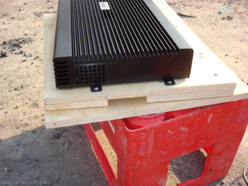 Креплений от усилителя в багажнике у меня остались от прошлого усилка, а вот площадка стала маловата под EOS 1500. Сделал площадку из 14 мм фанеры - 2 слоя. С усатами гайками, чтоб ecm крепить не на саморезы а по нормальному на винты М6. Только вот смущает крепление усиоителя, жидинькое оно какое-то , 2 кранштейна прикручены к усилителю ( торчат как ушки) а эти ушки в свою очередь прикручены к площадке. Буду посматривать за ним. Начнет првисать перетяну ещё широким жгутом.