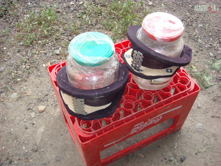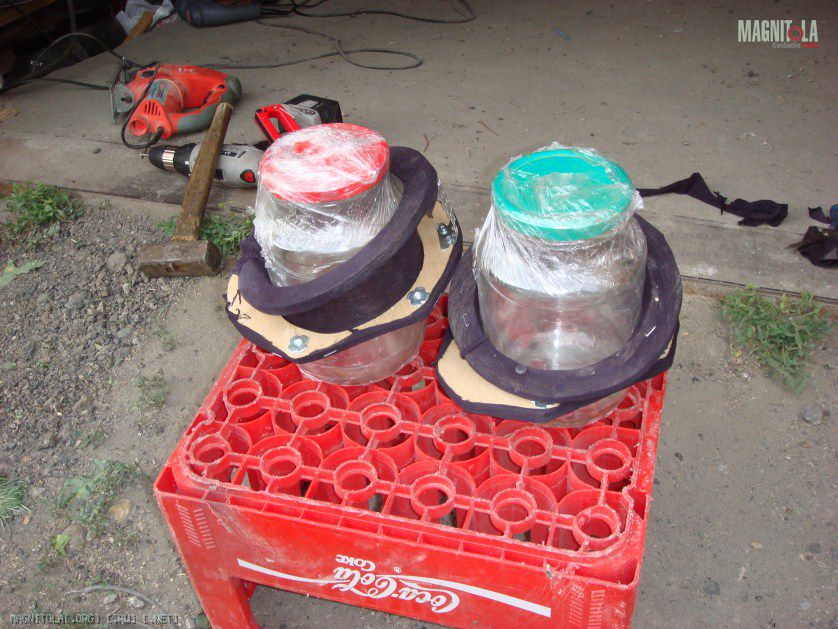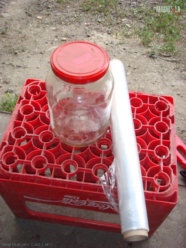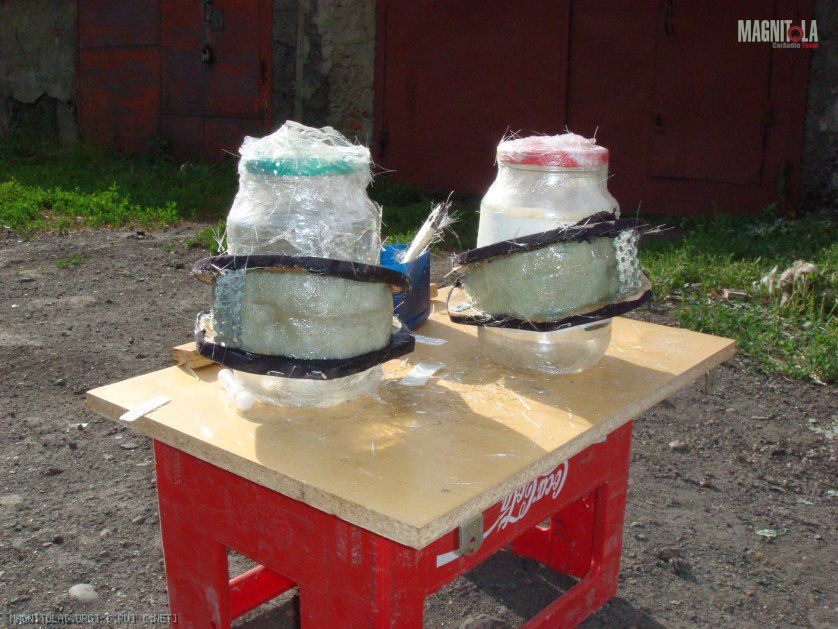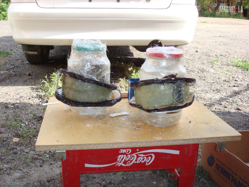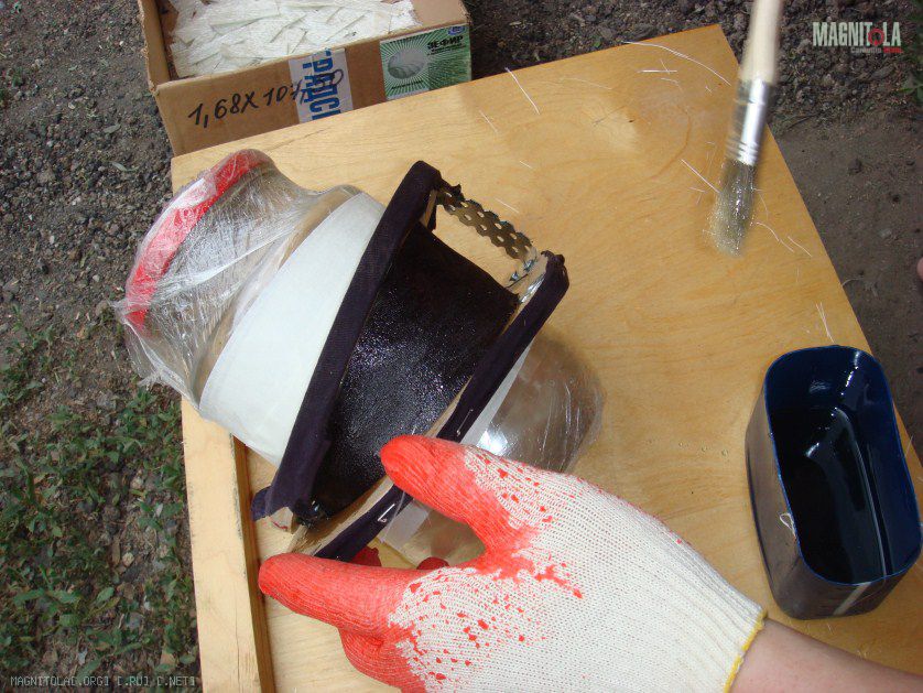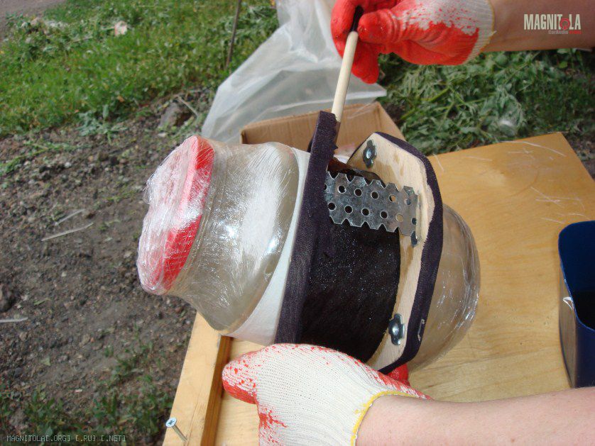 Чтоб можно было сразу положить несколько слоев стекломата с полиэфиркой, просунул банку 2 литра в отверстия. :laugh1: Предварительно банку обернув в пищевю пленку. Они нам ещё пригодятся, огурцы солить бум на зиму.