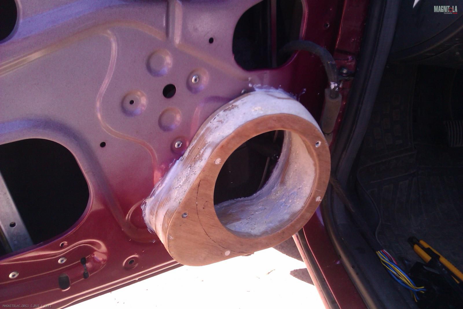 Самое нижнее кольцо это часть подиума которая "приросла" к двери, к среднему (где болты видны) крепится динамик, ну и приклеенный бортик. А этими болтами, которые видны потом вся конструкция, а это смола, кожзам, притягивается к подиуму, а смола/кожзам придавливается к карте. Ну у меня так, он накладной. Но от этого смысл не меняется. В твоем правда придётся делать всё прям на двери. Пока не будешь уверен что не поведет, если снимешь карту.
