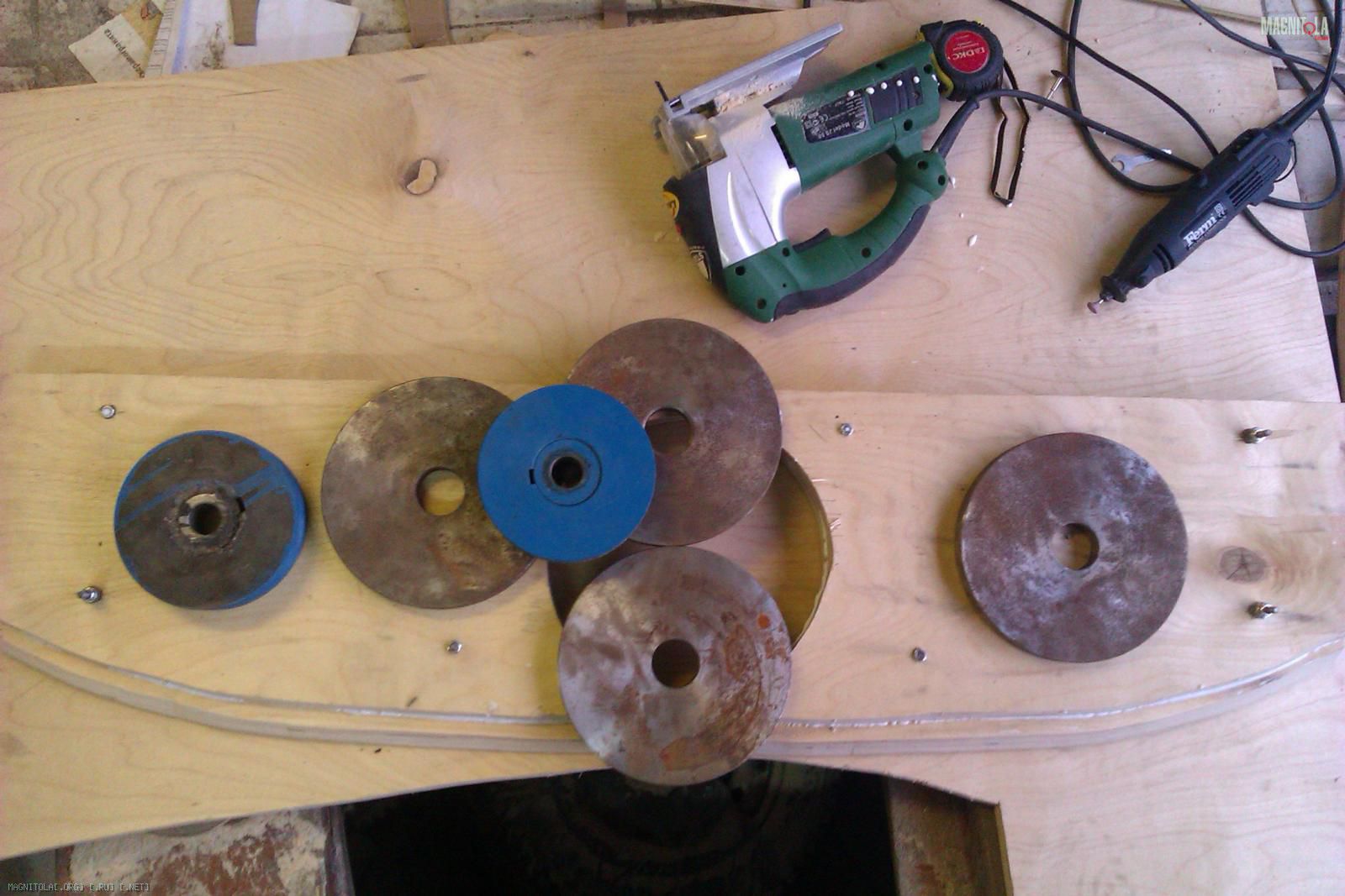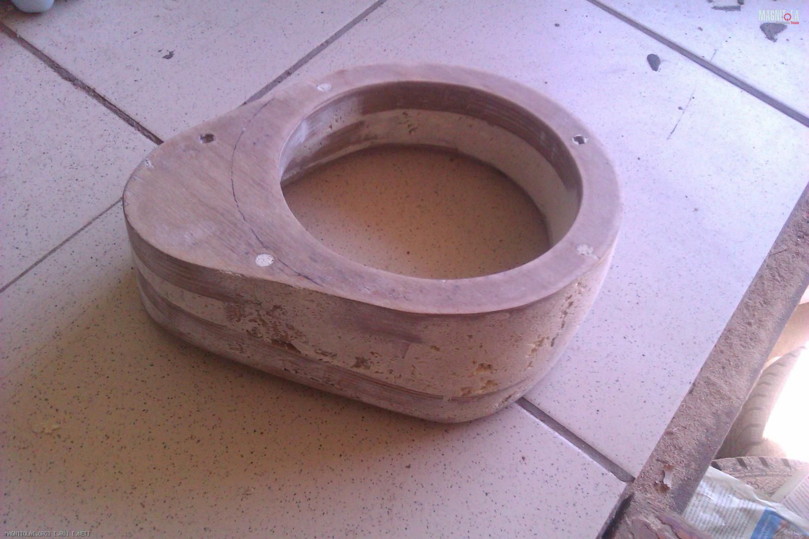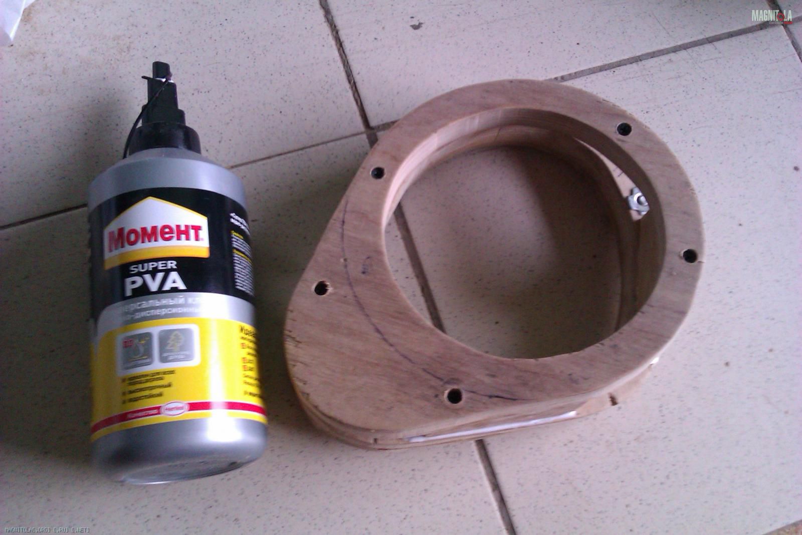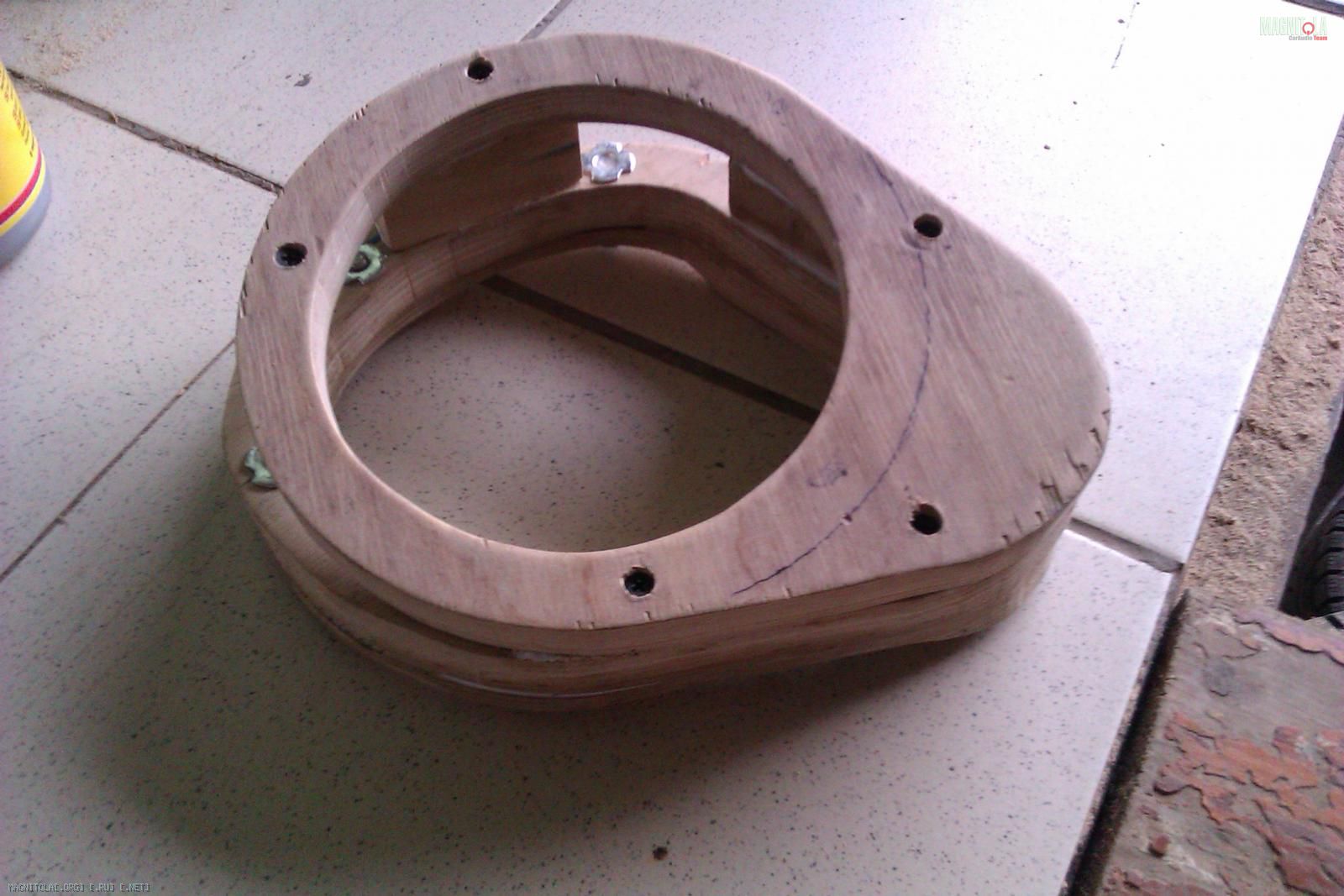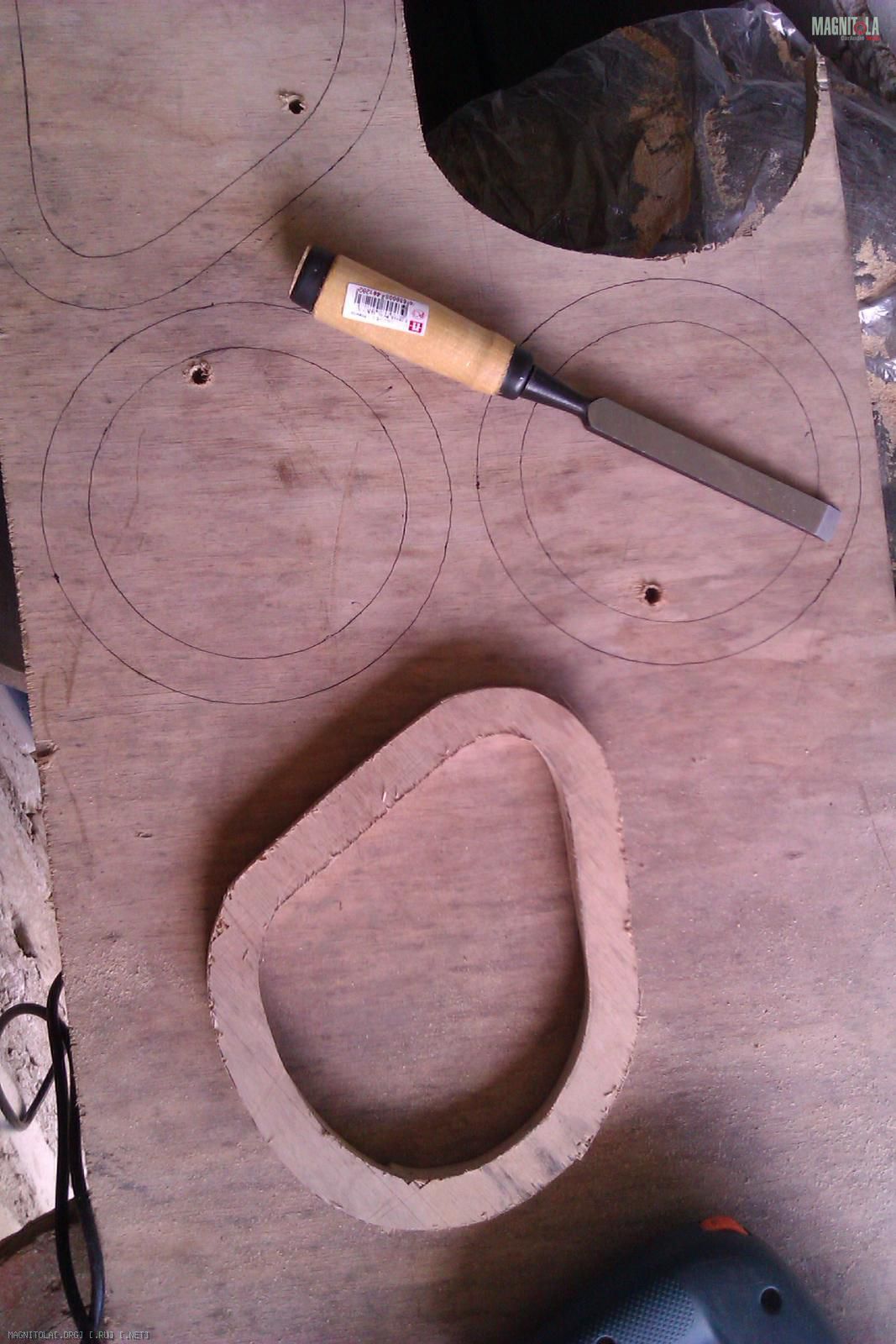 Как видно из предыдущего фото основание будущего подиума имеет не ровную поверхность. Поэтому вырезав электрическим лобзиком из 18мм фанеры основание подиума, оно было доработано долотом до более плотного прилегания с металлом двери. После этого толщина фанеры в самой тонкой части оказалось около 7мм и было принято решение усилить основание вторым слоем фанеры: Вложение 248840