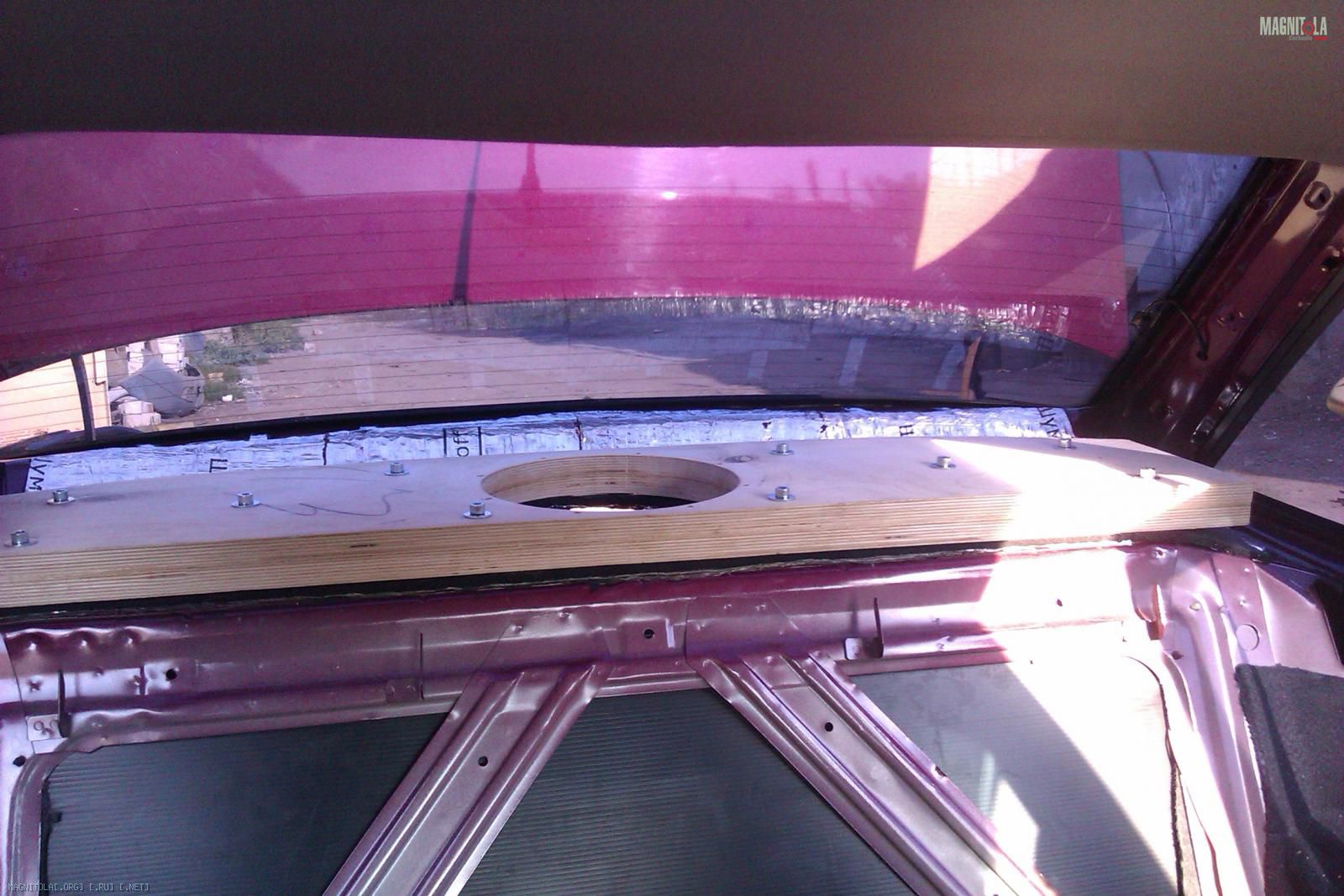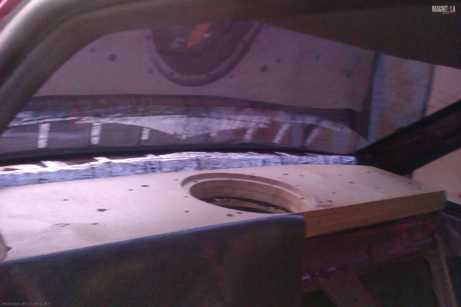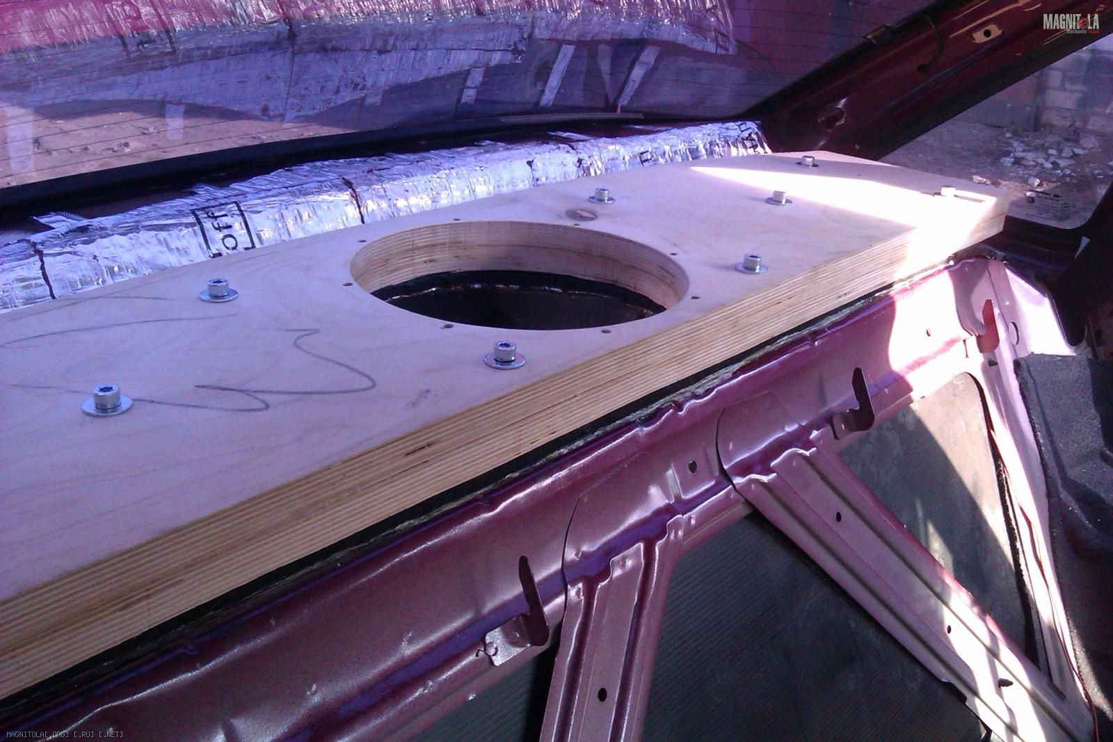 Так как полка имеет сложный профиль - ребрами жесткости, то изначально попытался выровнять общий уровень с помощью Шумофф М4 (1 лист). Так же был вырезан лобзиком отверстие под саб: Вложение 256474Вложение 256478