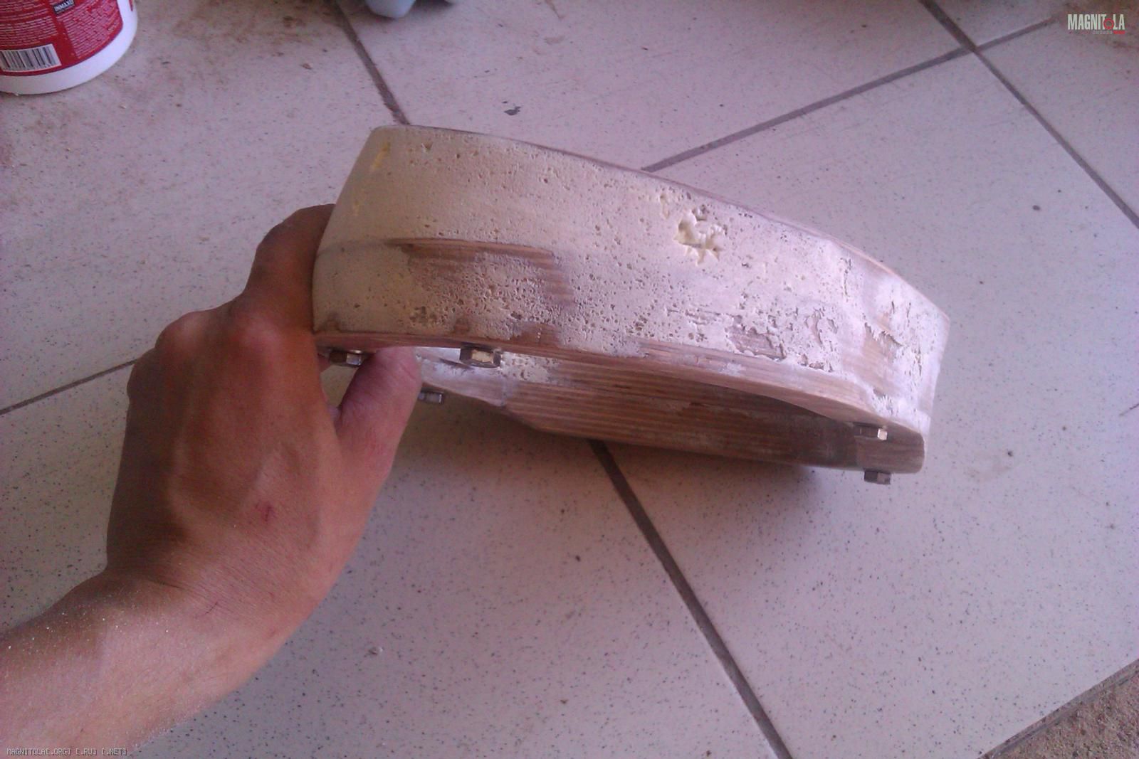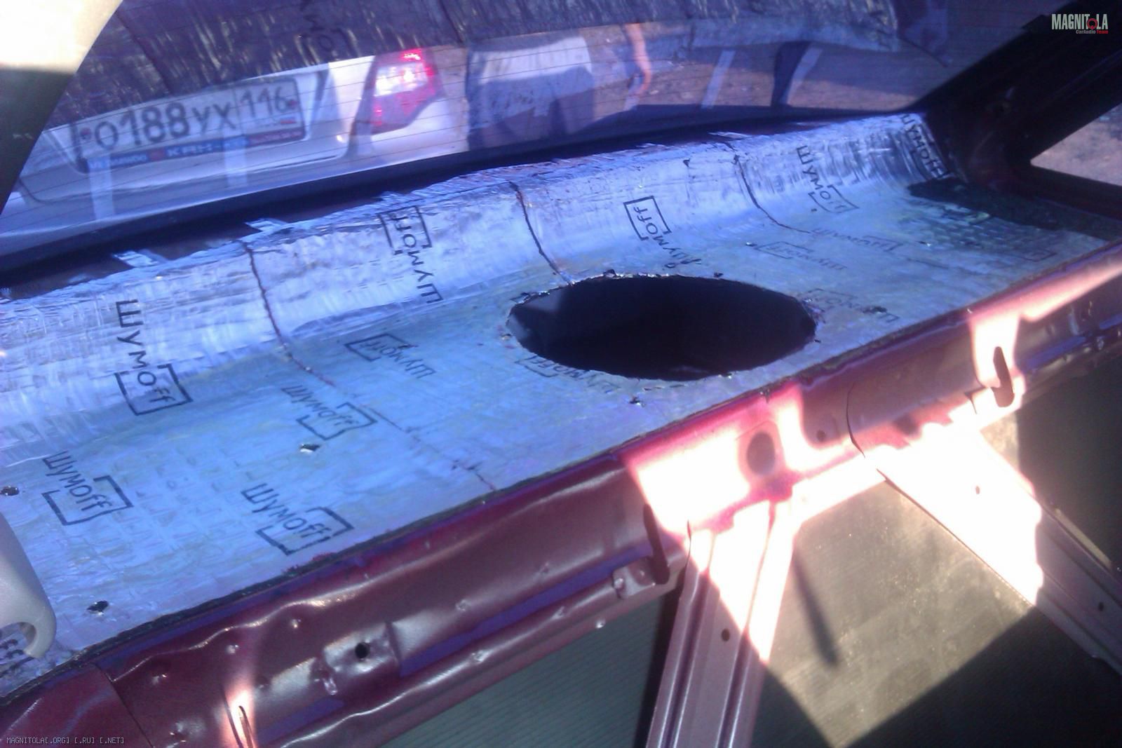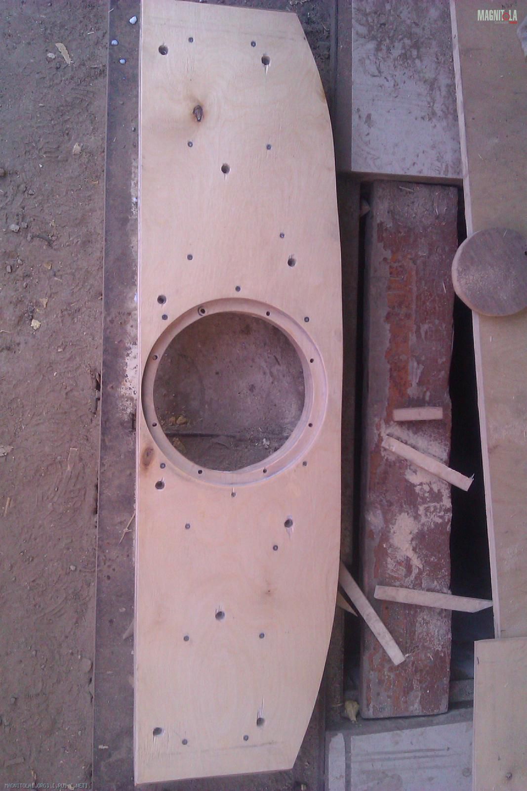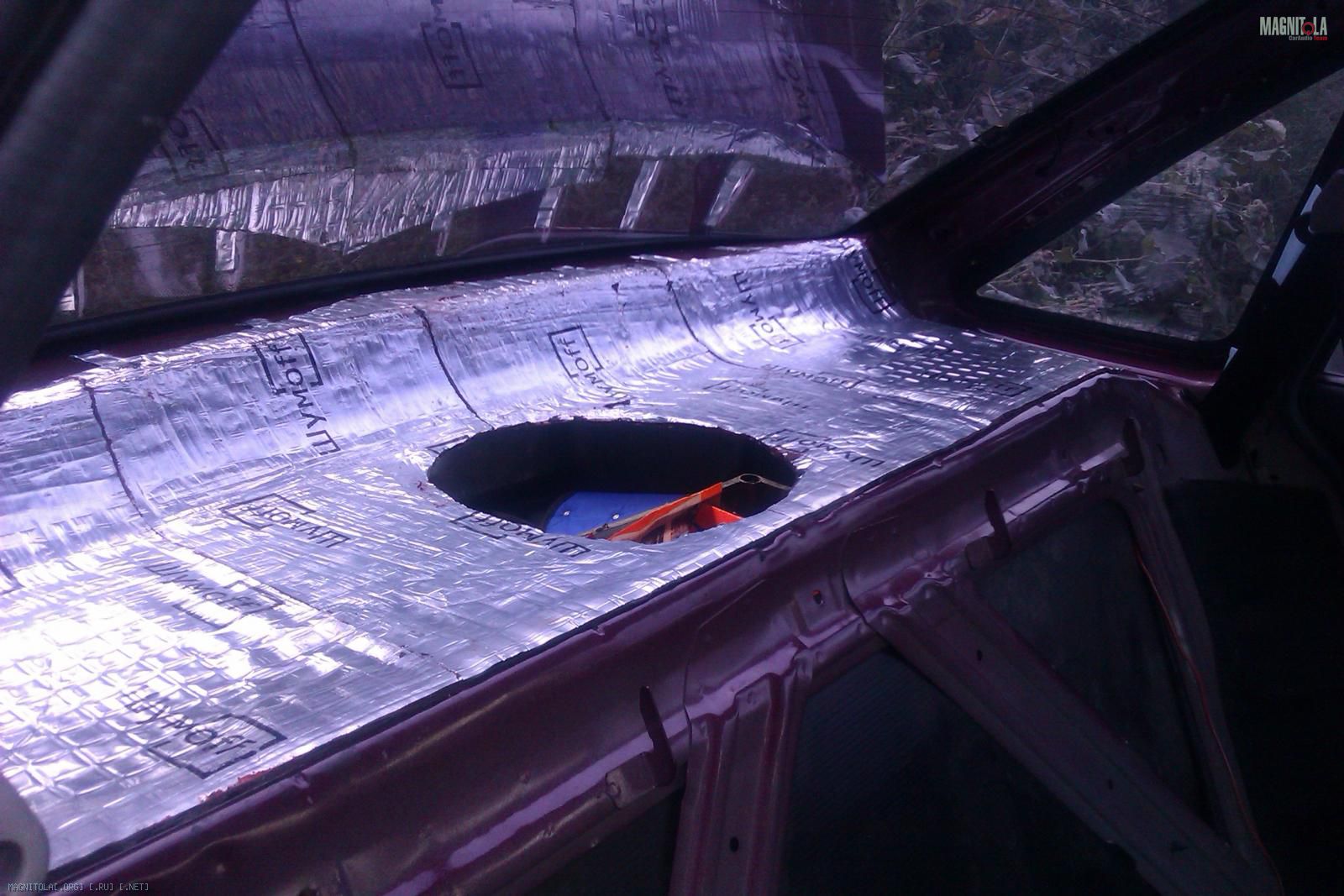 Так как полка имеет сложный профиль - ребрами жесткости, то изначально попытался выровнять общий уровень с помощью Шумофф М4 (1 лист). Так же был вырезан лобзиком отверстие под саб: Вложение 256474Вложение 256478