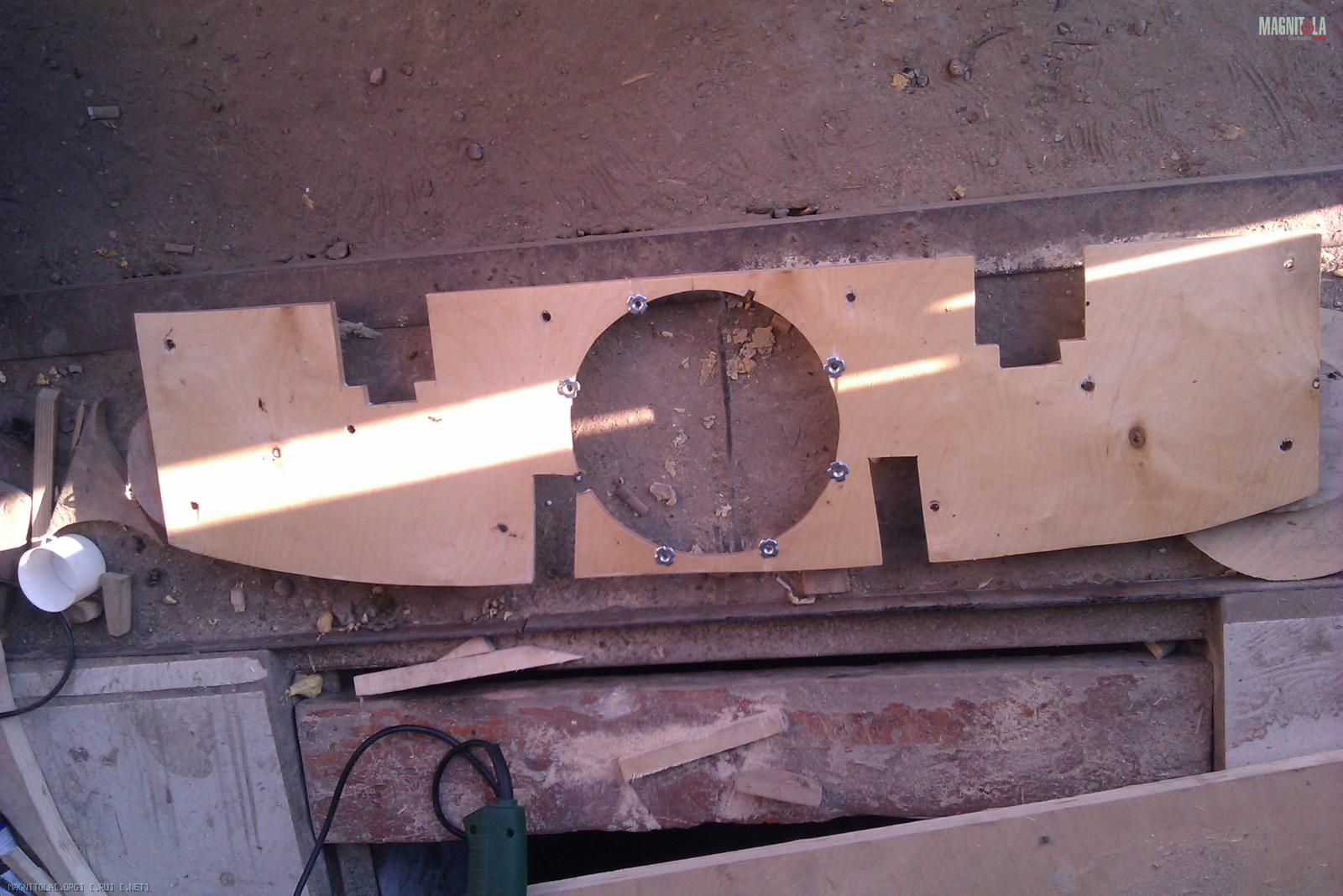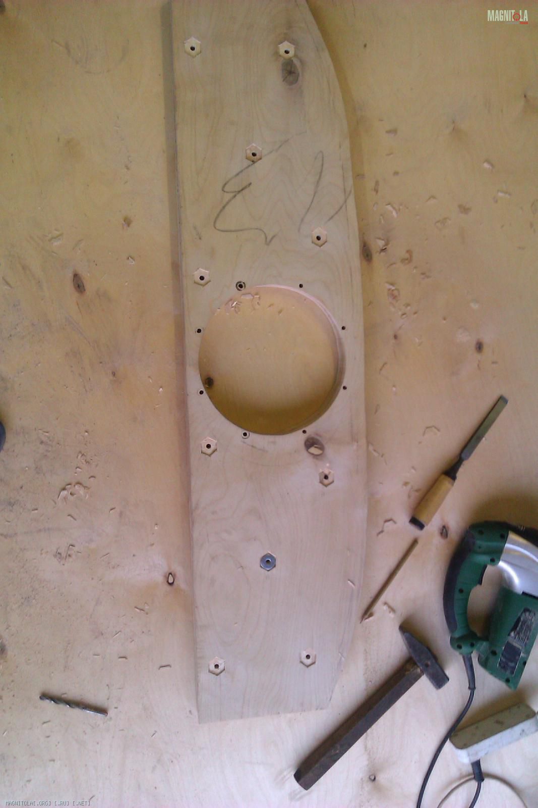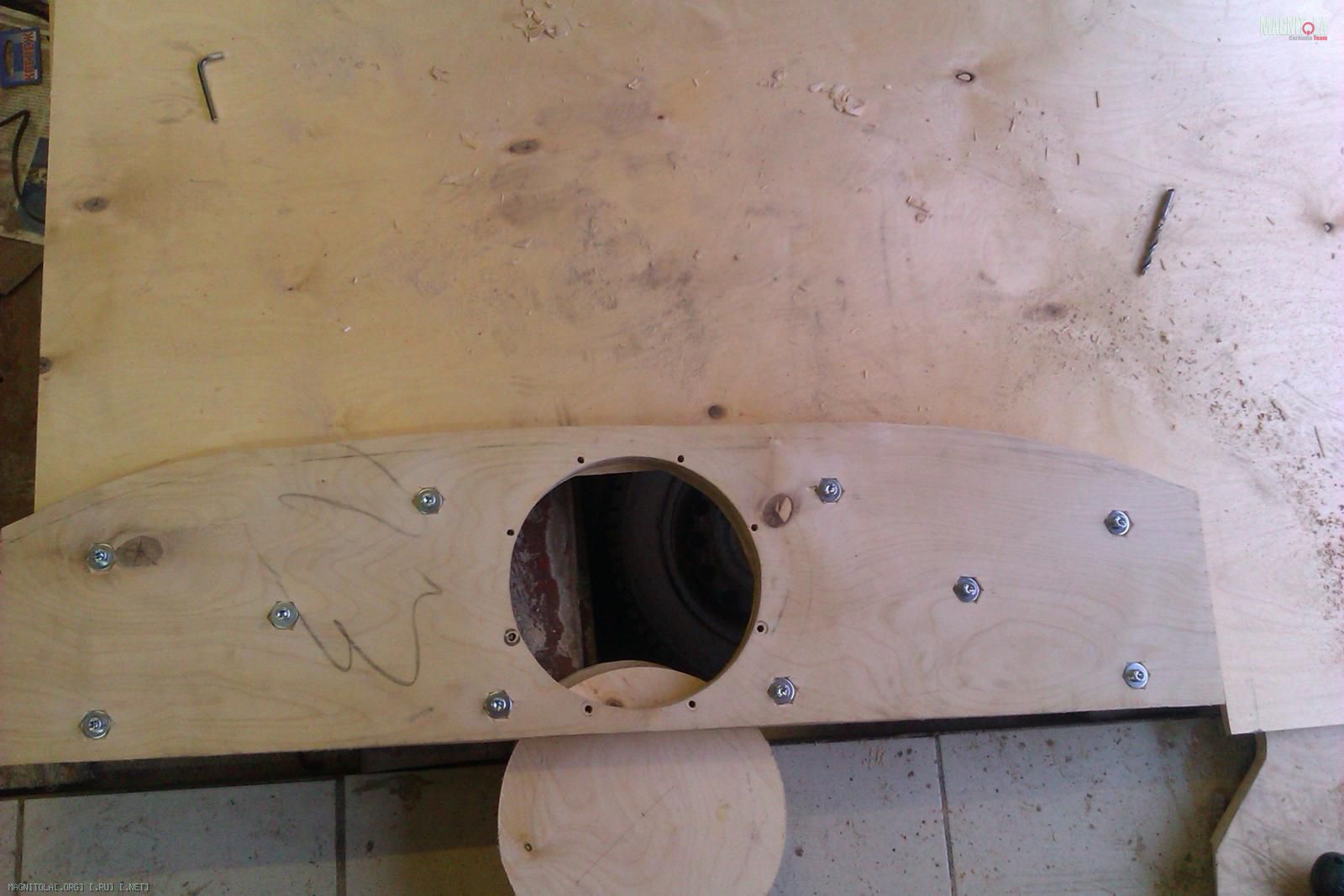 Вырезается последний слой полки из 12 мм фанеры, который будет крепиться со стороны багажника. Лишнее вырезается, забиваются мебельные гайки: Вложение 256518Вложение 256520