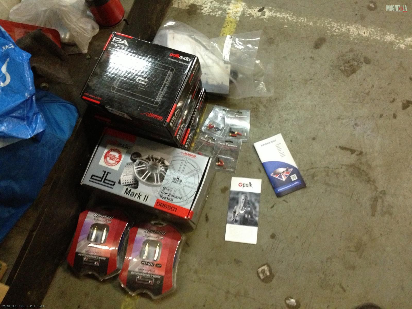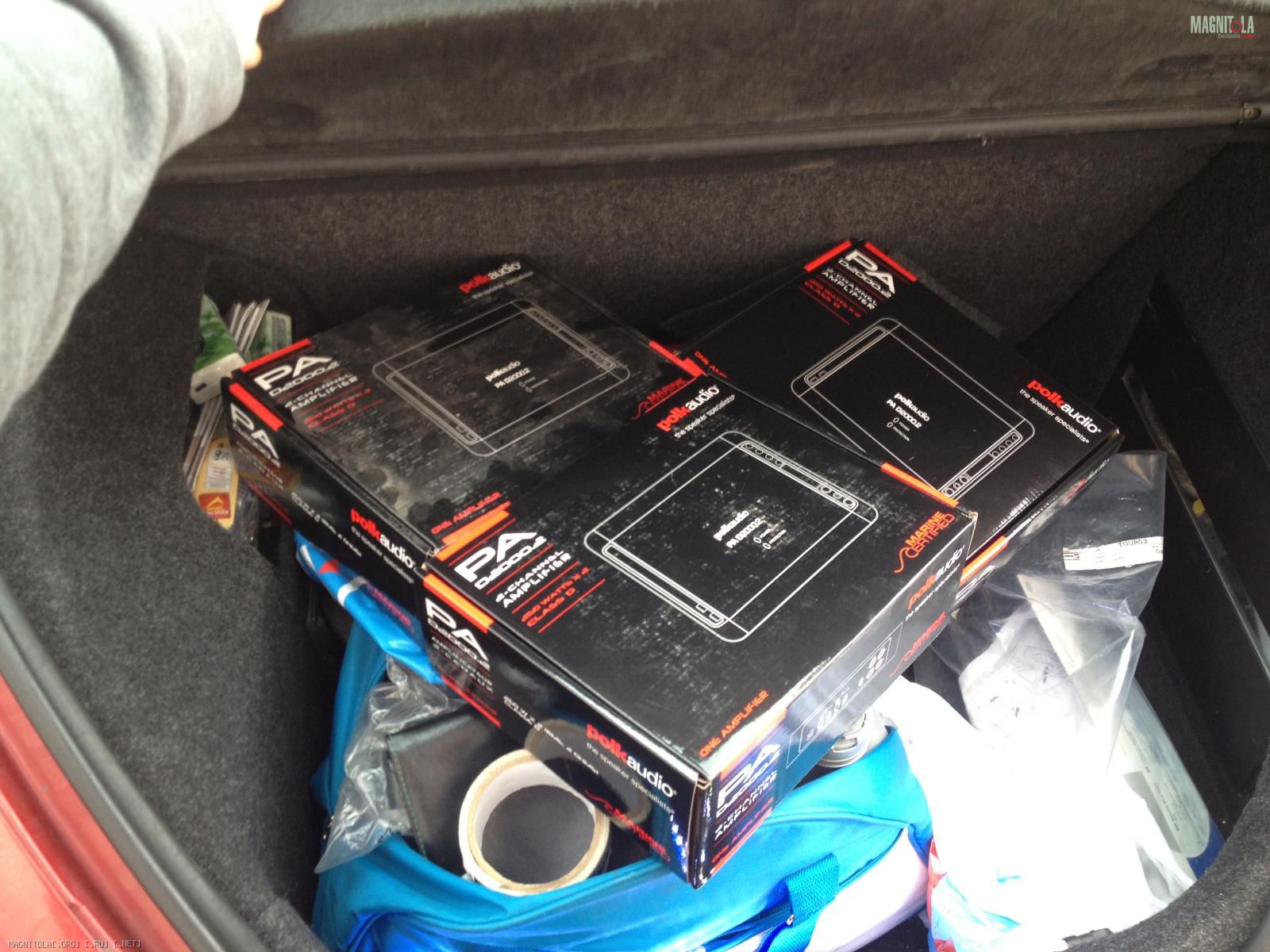 По "сговору с группой третьих лиц" (среди них не было ни одного автоаудиофила, техспеца и прочих грамотеев) я определил состав системы, который сможет показать хороший звук при демонстрации максимума возможностей: три двухканальных цифровика Polk Audio PA D2000.2, два коротких межблока Neotech NEI-5002 (по 0,5 м), мидбасовые динамики Polk Audio DB6501. Внедрение всего хозяйства было поручено ребятам, упомянутым в самом первом посте. Веселухи было немало: срок - только сегодняшний день, суммарная площадь трёх малышей больше площади РА4506, место вроде есть, но не там и не то. Параллельно пересечение с мастером по полировке и химчистке, что тоже не шибко доставляет удобства. Твитеры пока (!) остались старые, однако смена уже едет (пока не скажу, что это будет, но понятное дело Polk)