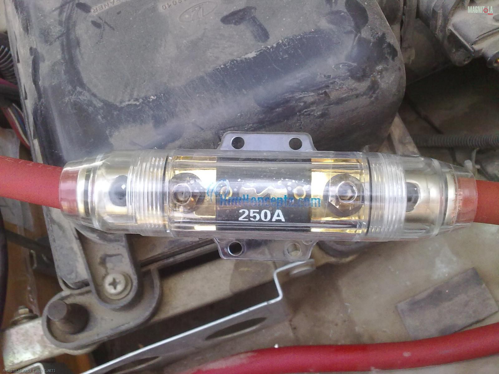 Итак,питание проведено.Плюс взят от аккума,минус с кузова. Силовая проводка Shock Industries Competition Series 1/0 Ga.На расстоянии 20 см от аккума подключил пред на 250 ампер.Держатель предохранителя KnuKonceptz,очень удобный,проводка влезает без проблем и хорошо держится