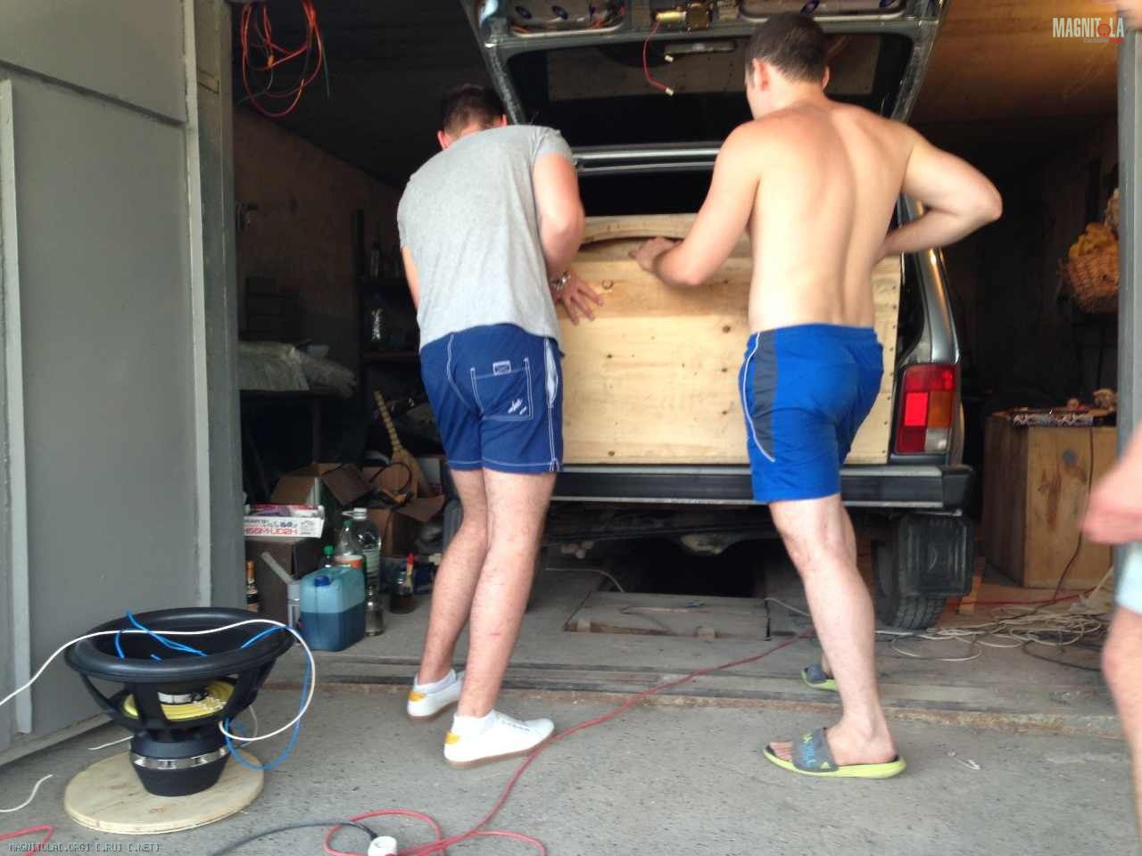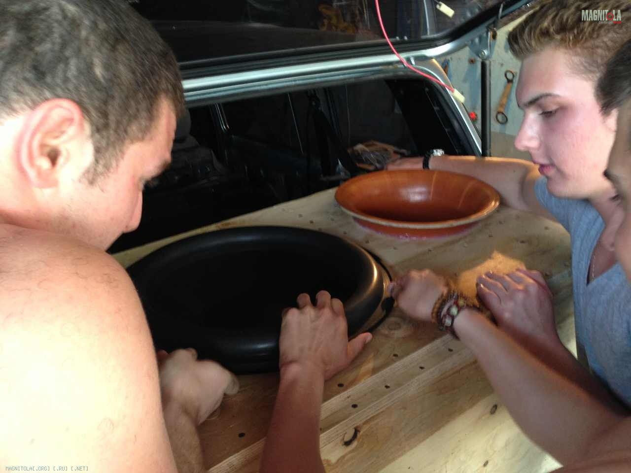 Далее,были выпилены отверстия для трубы и саба.Хочу отметить,что короб создавался долго-четыре дня.Не то,чтобы с утра до вечера я над ним потел,но,так или иначе,четыре дня ушло.Фанеру распиливал циркулярной пилой,отверстия вырезал фрезером с радиусной планкой а ля Jasper Tools(точная копия,но из оргстекла).Короб вставляли втроем:процесс трудоемкий)))